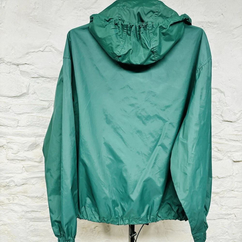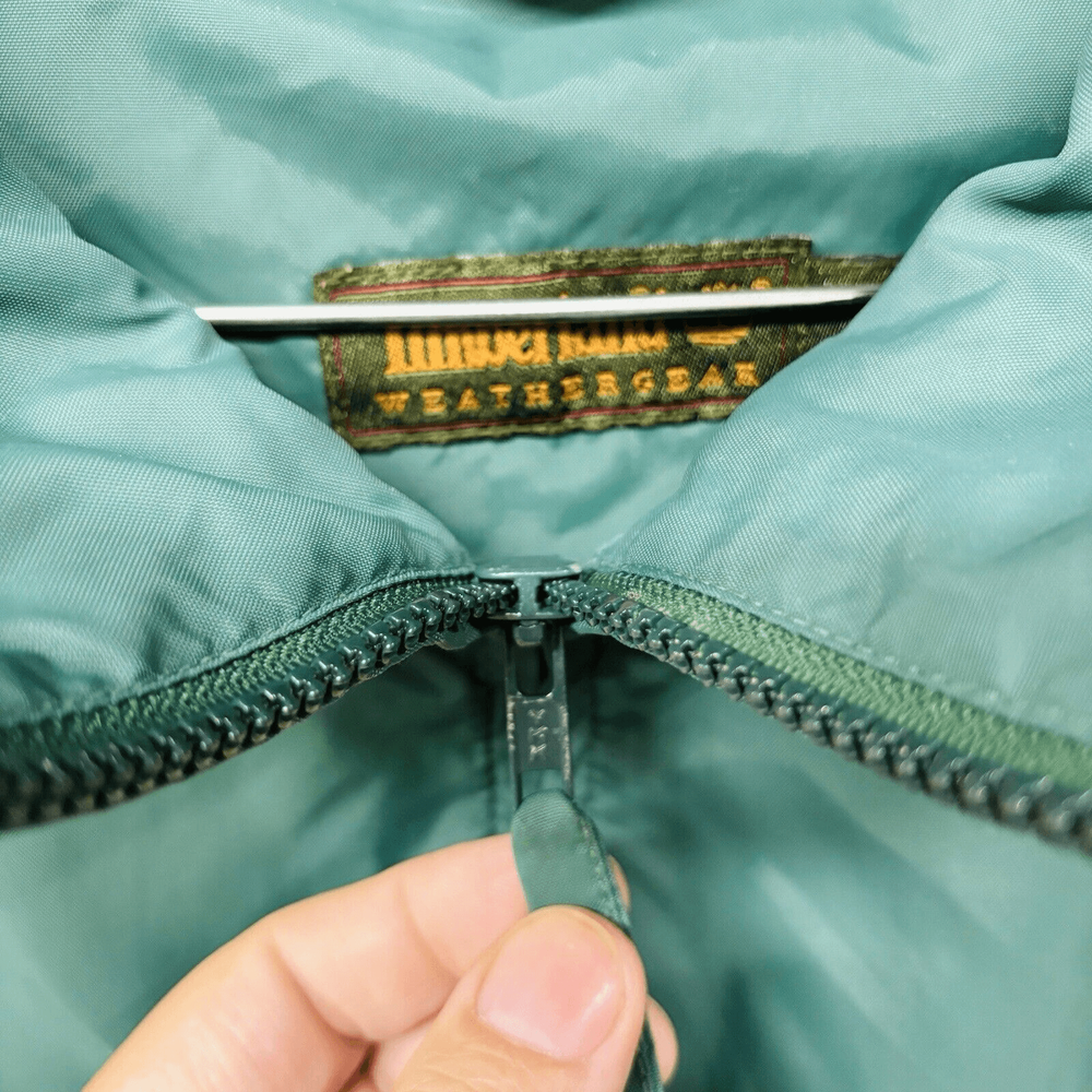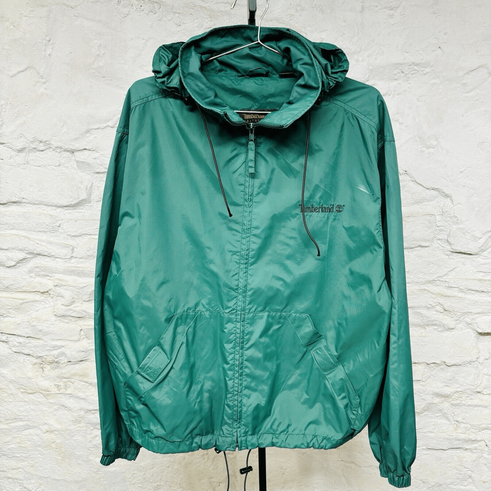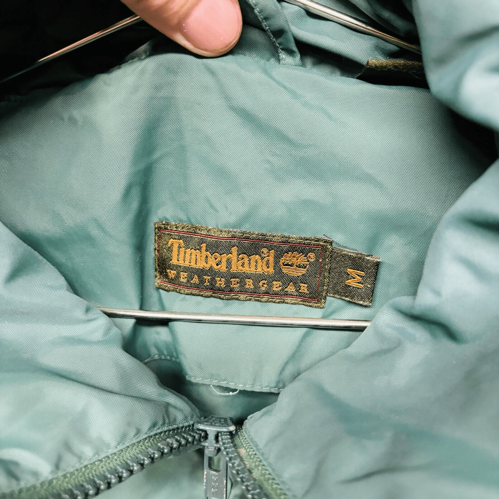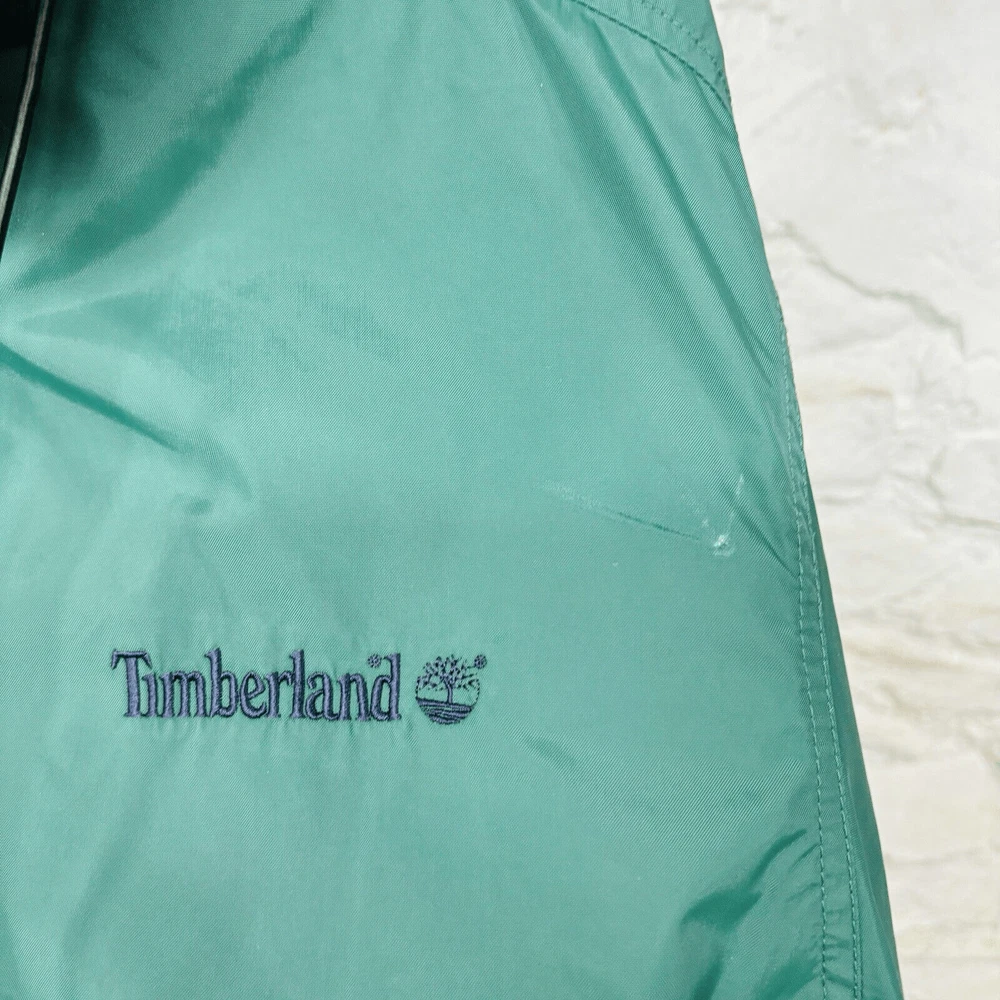 Vintage Timberland Rain Jacket Mens Medium Green Weather Gear Nylon Hoodie Approx measurements pit to pit: 24” collar seam to hem: 28” Item is pre owned. Nice condition with a couple small aesthetic flaws. Some minor paint chipped on the zipper pull and a spot on the left shoulder that looks like an iron mark. No stains holes or other flaws. Please refer to photos for detail.