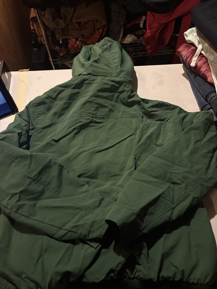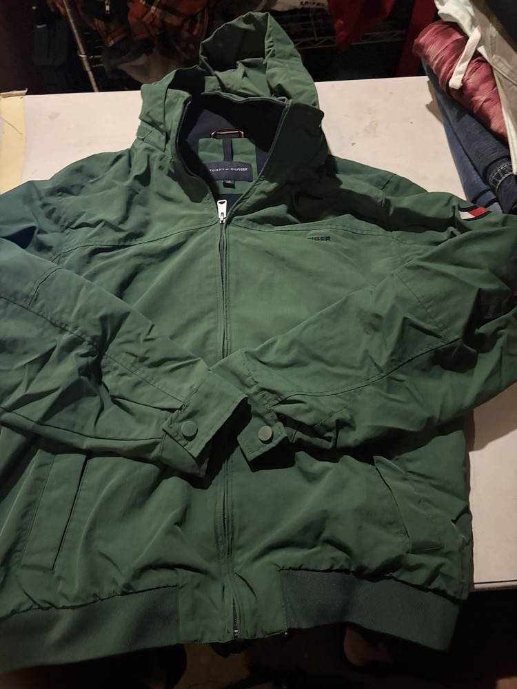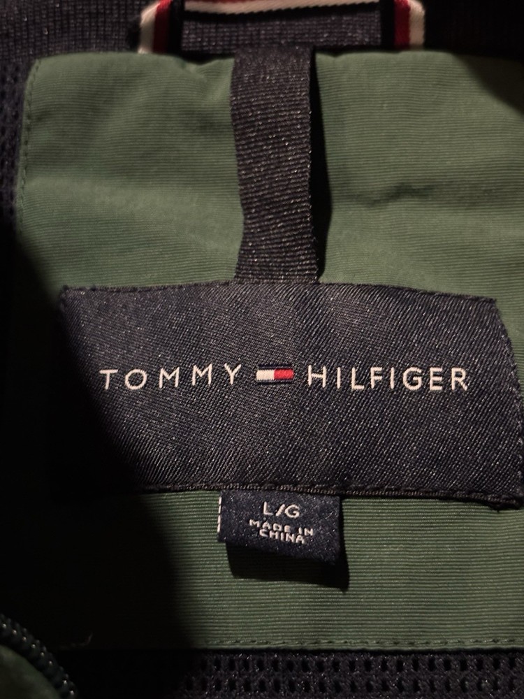 Vintage Tommy Hilfiger Jacket in green color, made of nylon outer shell material with polyester lining and insulation material. This mid-length windbreaker jacket features a classic fit and a striped pattern with embroidered logo accents. The jacket has a full zip closure with drawstring, hook & loop, and button options, along with a band collar style and zipped pockets for breathability and wind-resistance. It is suitable for all seasons, with warmth weight of 350, and ideal for various occasions such as travel, casual wear, and workwear. The jacket is machine washable and has a chest size of 52 inches. The product line is Tommy Hilfiger Tommy Jeans, and it is a perfect addition to any outdoor or classic-themed wardrobe.