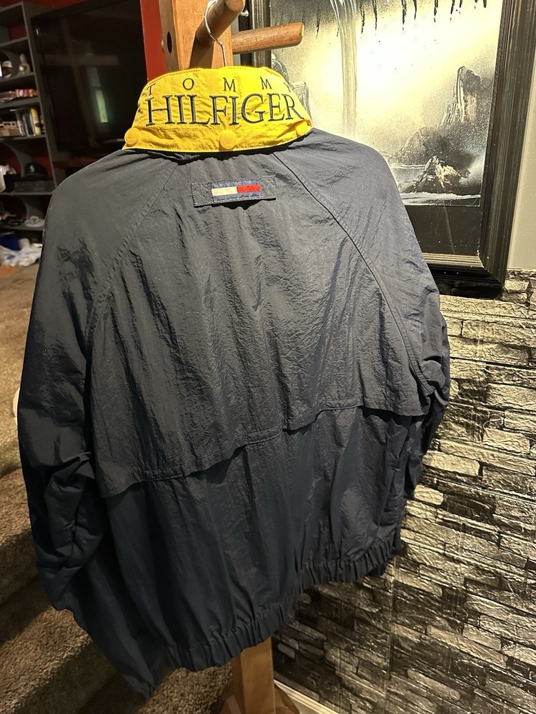 This Vintage Tommy Hilfiger Jacket Windbreaker from the 90s features a spell out on the back collar, making it a stylish and nostalgic addition to any man's wardrobe. Made from nylon with a solid blue color, this short-length windbreaker has a zip and snap closure, with embroidered accents for added flair. Perfect for casual or travel occasions, this lightweight jacket is hooded, wind-resistant, and suitable for all seasons. With a regular fit and size small (runs big), this Tommy Hilfiger jacket is versatile and suitable for various activities like walking, golf, skateboarding, hiking, and running.