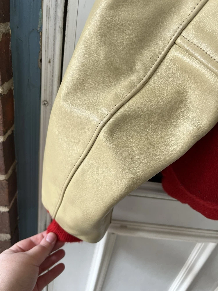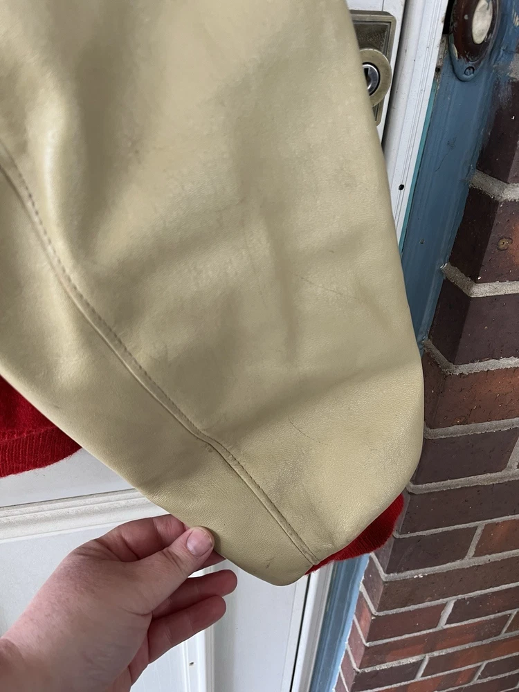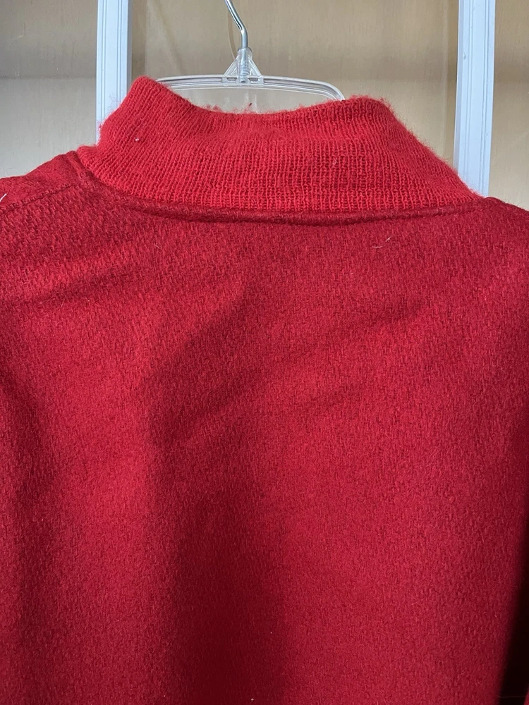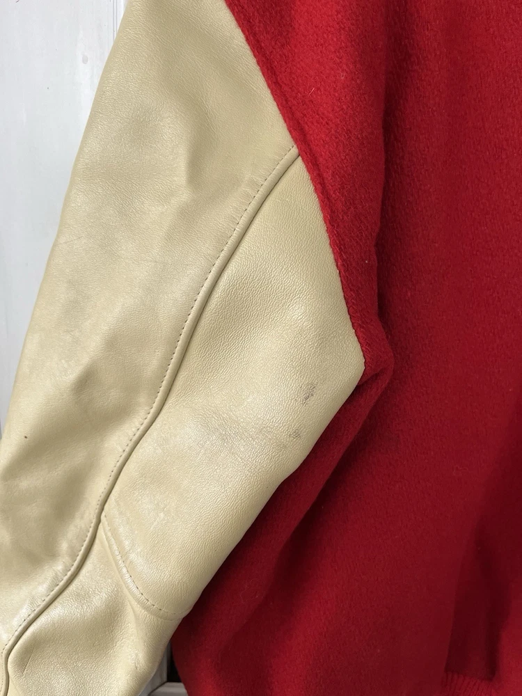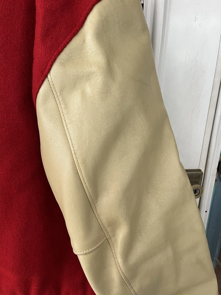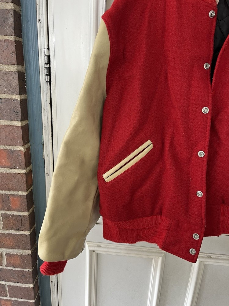 I absolutely love this vintage varsity jacket! The red color is bold and eye-catching, while the wool material feels durable yet comfortable. The fit is true to size, and the button/snap closure keeps it secure. It’s surprisingly lightweight but still warm enough for cooler weather. The retro style stands out, and the craftsmanship is impressive—you can tell it’s handmade. Perfect for casual outings or adding a pop of nostalgia to any outfit. Rare find and definitely worth it!