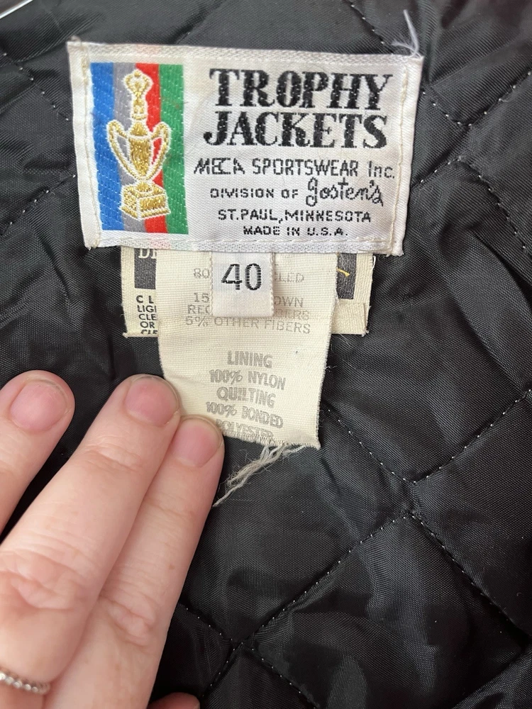 The Vintage Trophy Meca Sportswear Red Varsity Letterman Jacket in size 40 is a rare and collectible piece with a classic fit and solid red color. Made of wool with a short coat length, this jacket features a button and snap closure, perfect for a variety of occasions like travel, parties, casual wear, and workwear. Handmade in the United States, this lightweight and breathable jacket is lined, wind-resistant, and ideal for all seasons including winter, summer, fall, and spring. With a retro and colorful theme, this limited edition jacket is personalized with unique features such as oversized sizing, bodywarmer style, and full zip design. Shoulder to shoulder 22 inches Sleeve length 25 inches Top of coat to bottom 26 inches See pics for details and condition.