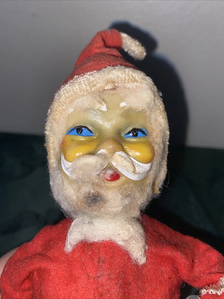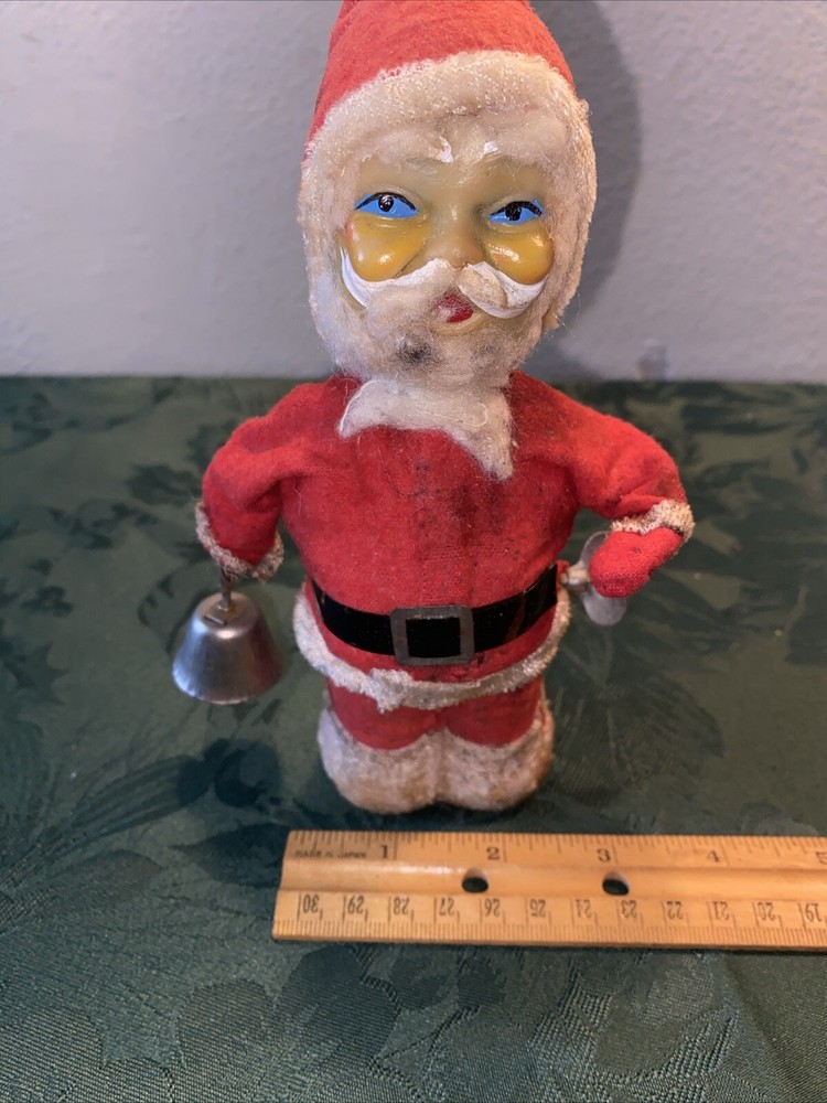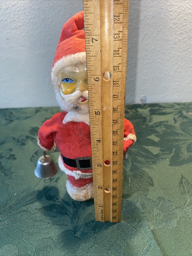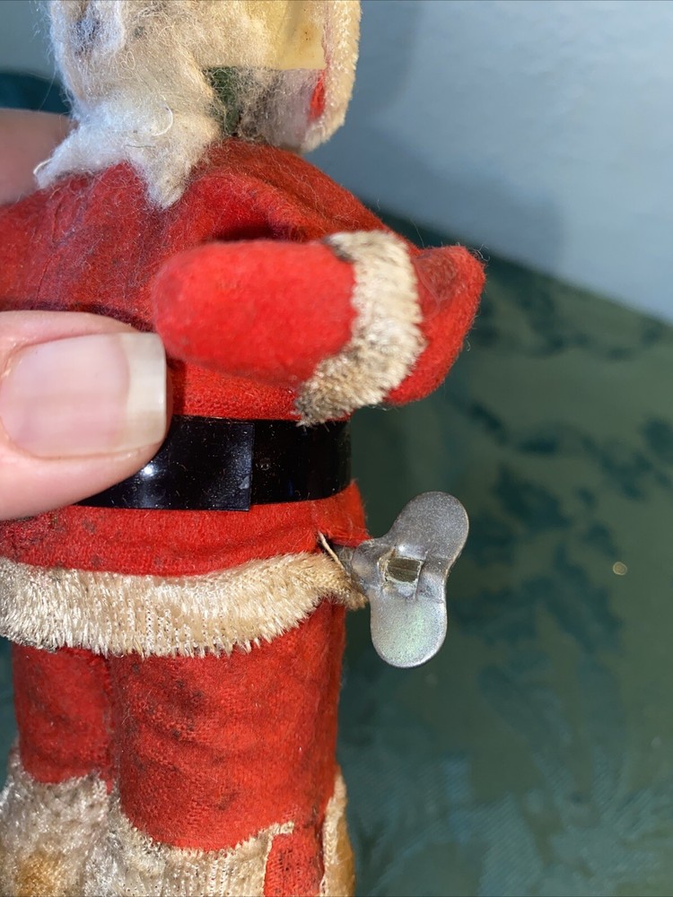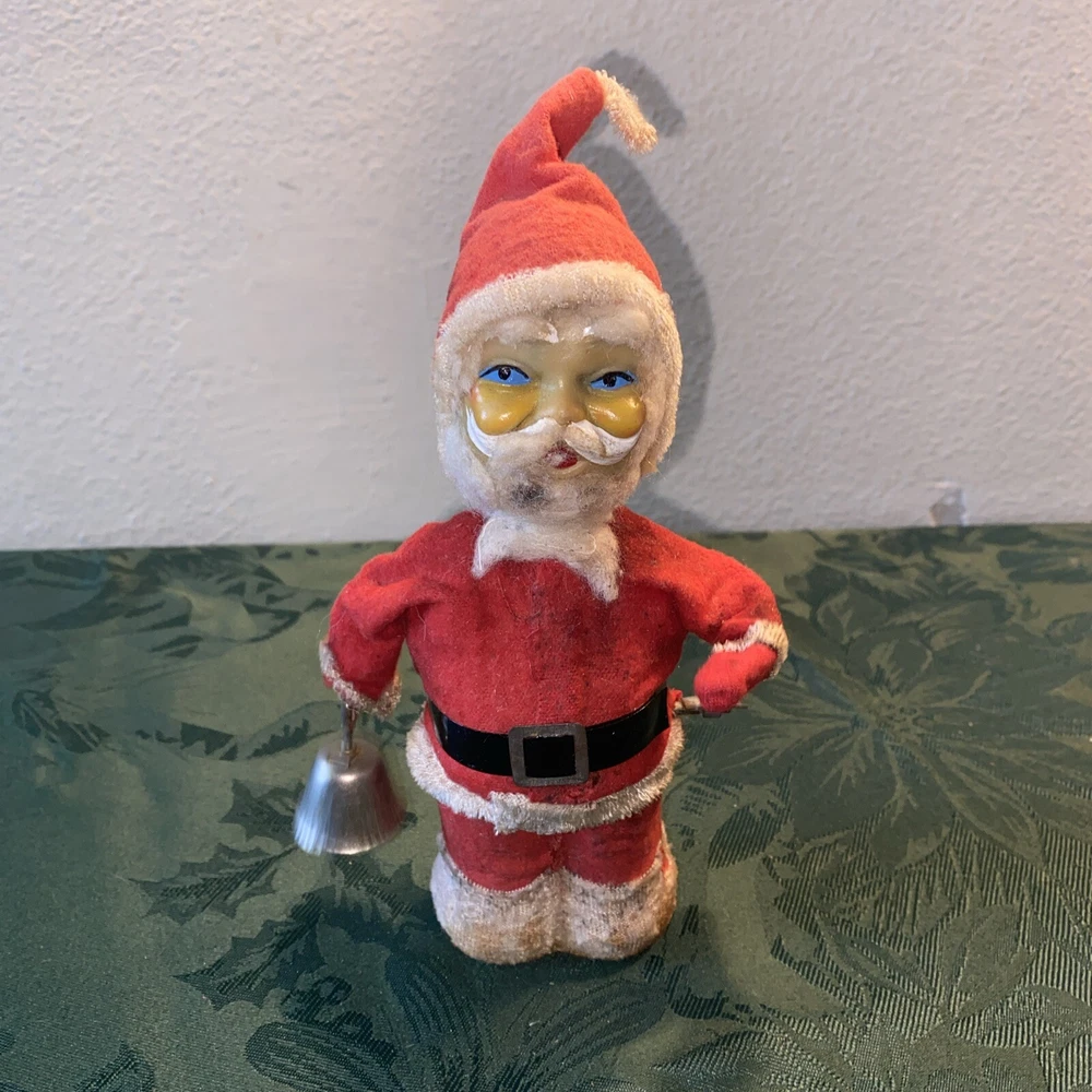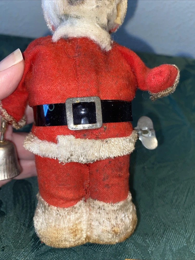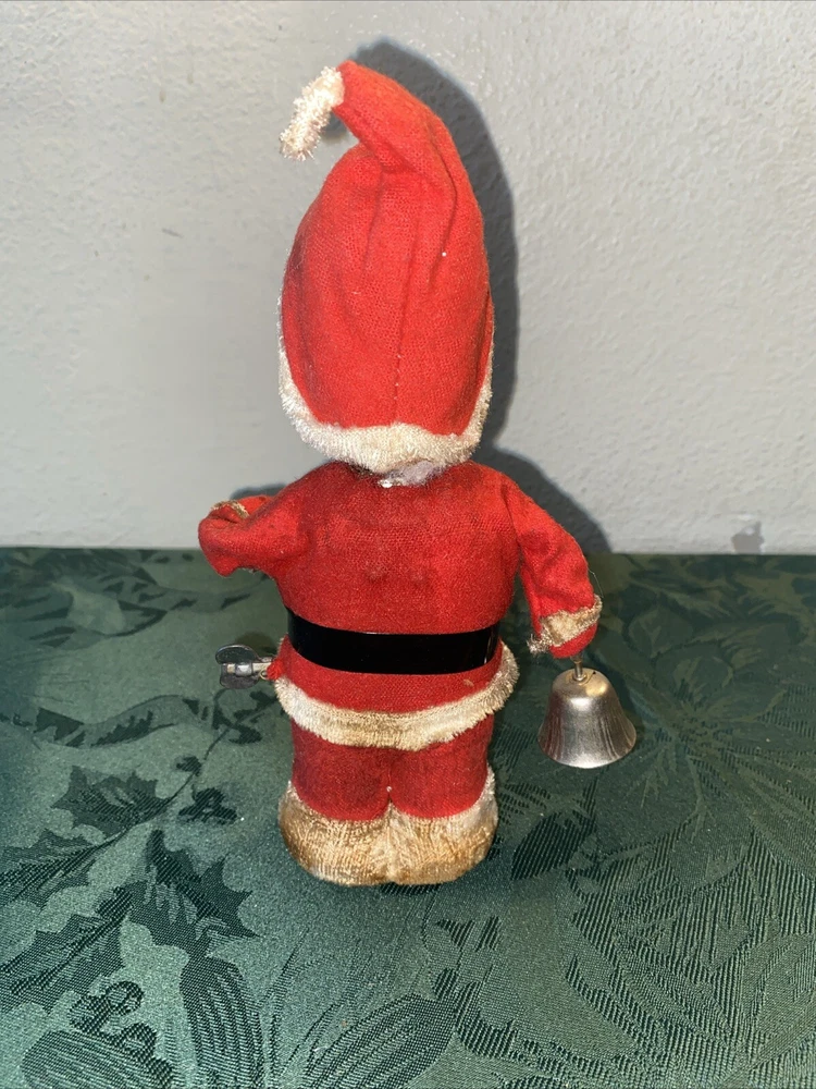 Unknown year Dirty needs cleaning Wind up in working order. Santa rings the bell and his other arm moves up and down Missing fabric on feet can be seen in last photo