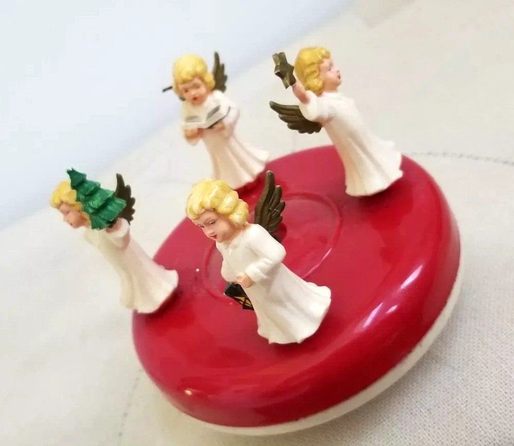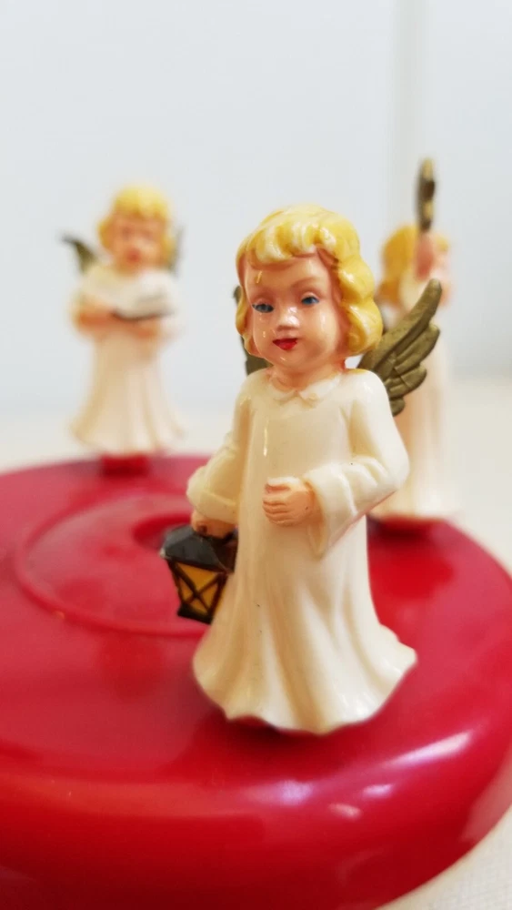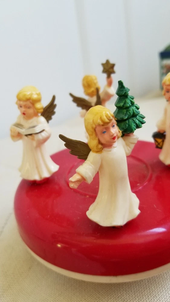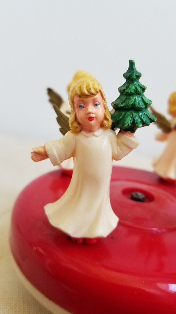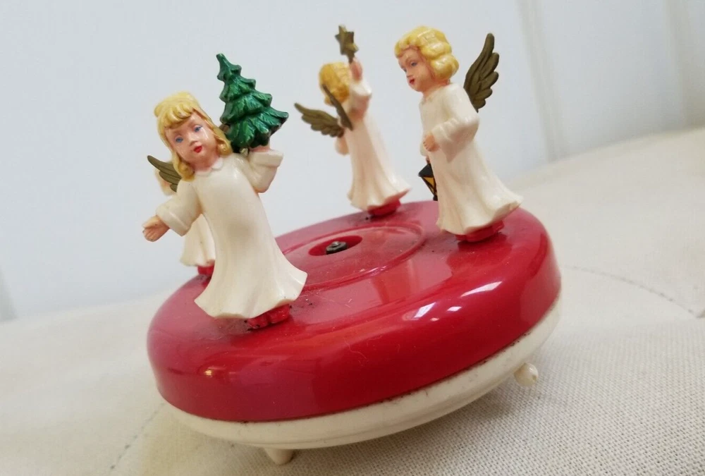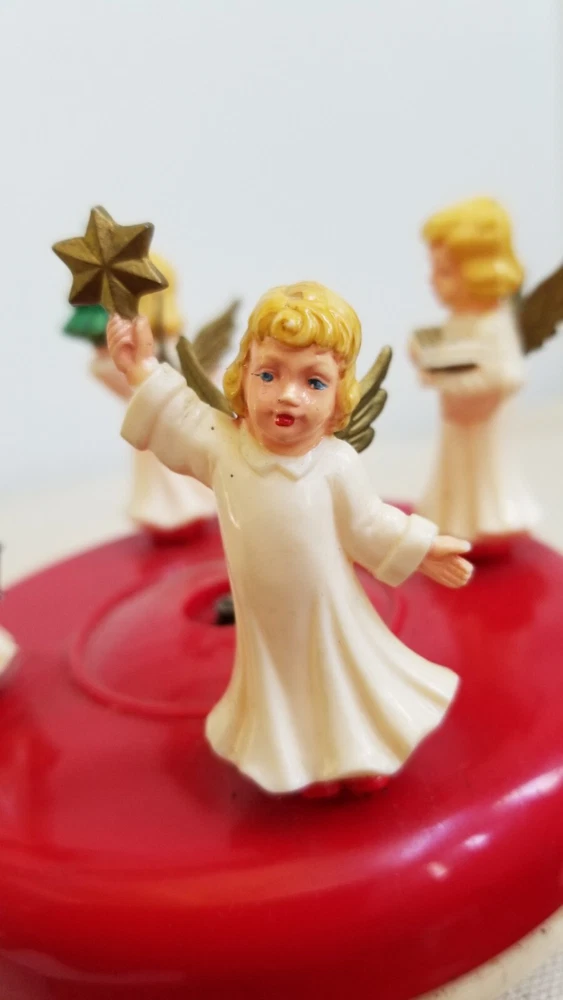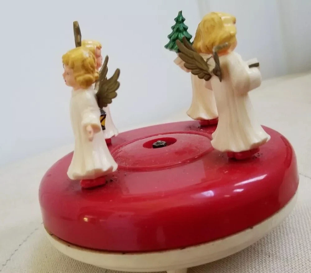 Vintage Angel Music Box West Germany Angel Christmas decoration. Red Plastic Celluloid by Ges Gesch from West Germany. Beautifully detailed and it works with sound and Angel's turn. The music I bel is the Christmas song Silent Night.This music box measures 4ā in height and 4 1/2ā in diameter. Stamped Made in Western Germany and Ges Gesch. In wonderful vintage condition, angels remain intact. This music box is working with music.When you wind it up music plays Silent Night and the device turns with the angels turning slowly. Each angel is holding something unique. A book, a lantern, a tree and a star. Paint is vibrant and intact with item showing minimal wear. No attempts to clean item. Please see photos for description.