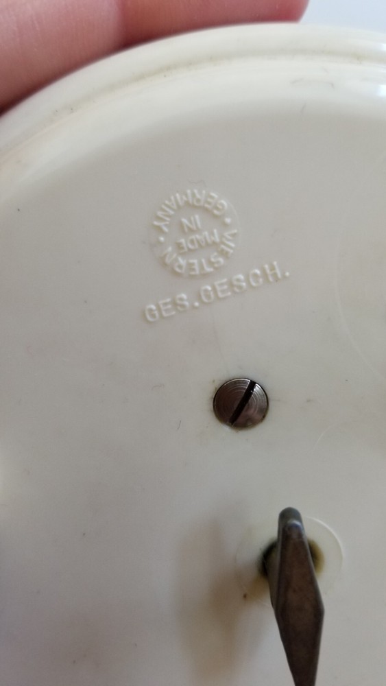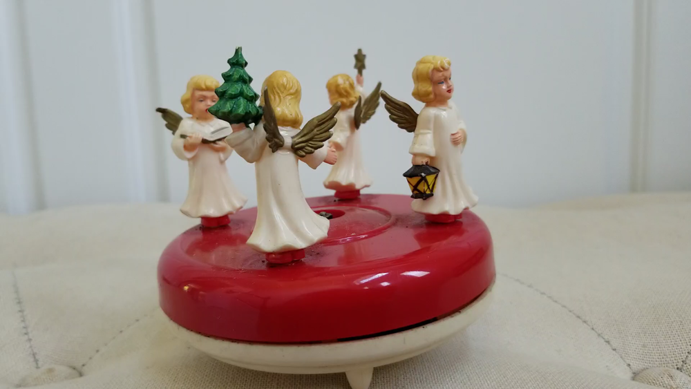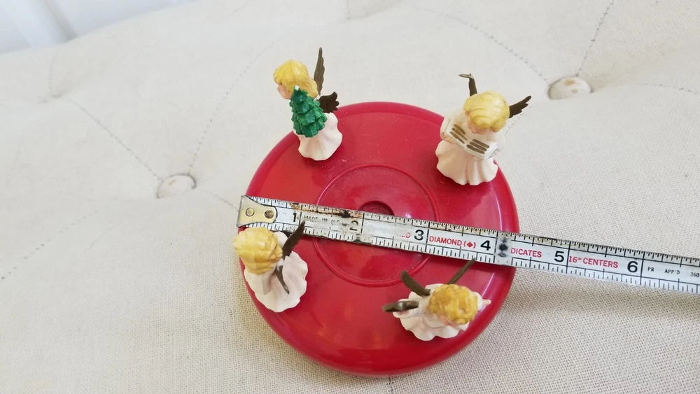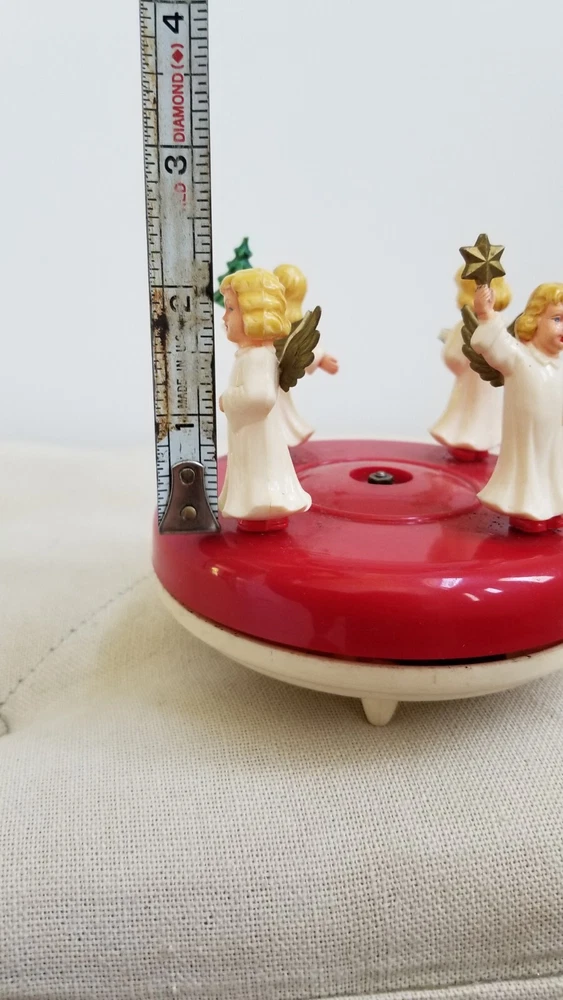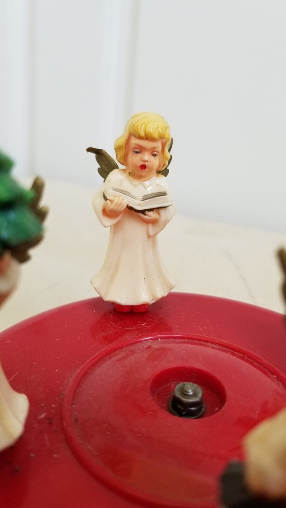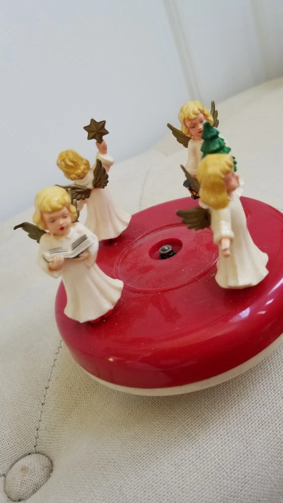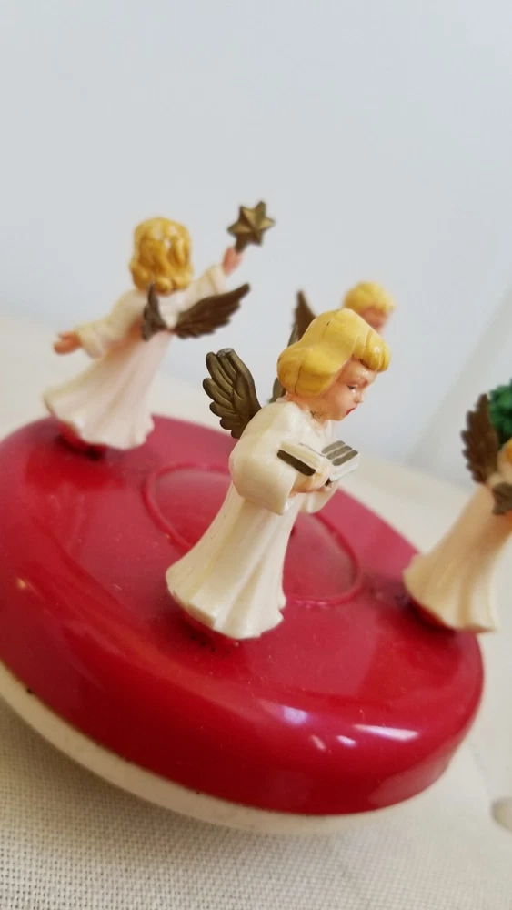 Vintage Angel Music Box West Germany Angel Christmas decoration. Red Plastic Celluloid by Ges Gesch from West Germany. Beautifully detailed and it works with sound and Angel's turn. The music I bel is the Christmas song Silent Night.This music box measures 4ā in height and 4 1/2ā in diameter. Stamped Made in Western Germany and Ges Gesch. In wonderful vintage condition, angels remain intact. This music box is working with music.When you wind it up music plays Silent Night and the device turns with the angels turning slowly. Each angel is holding something unique. A book, a lantern, a tree and a star. Paint is vibrant and intact with item showing minimal wear. No attempts to clean item. Please see photos for description.