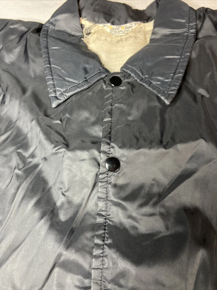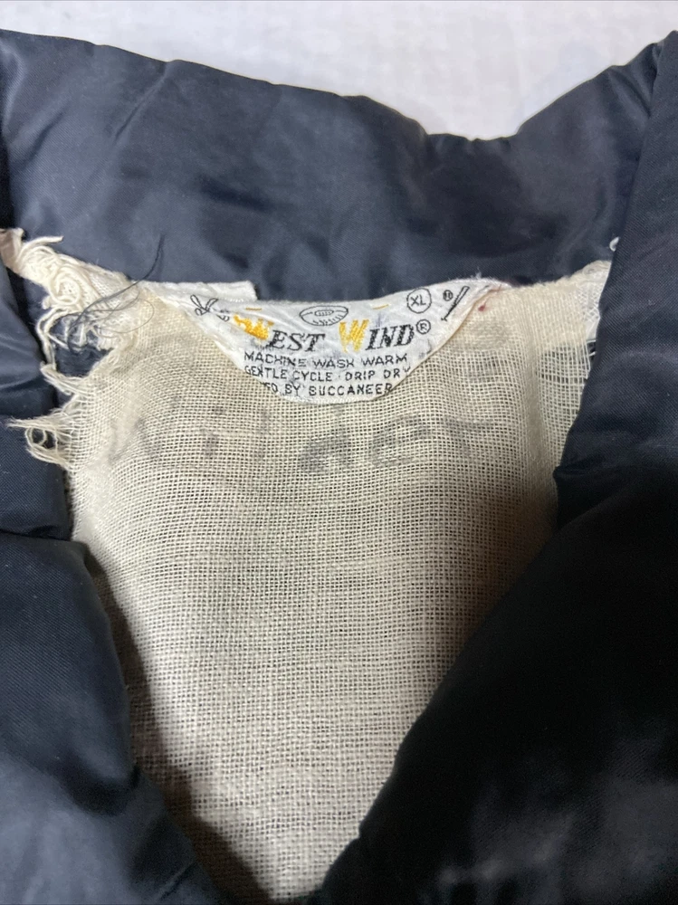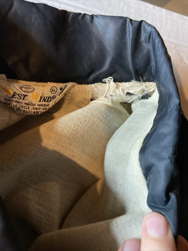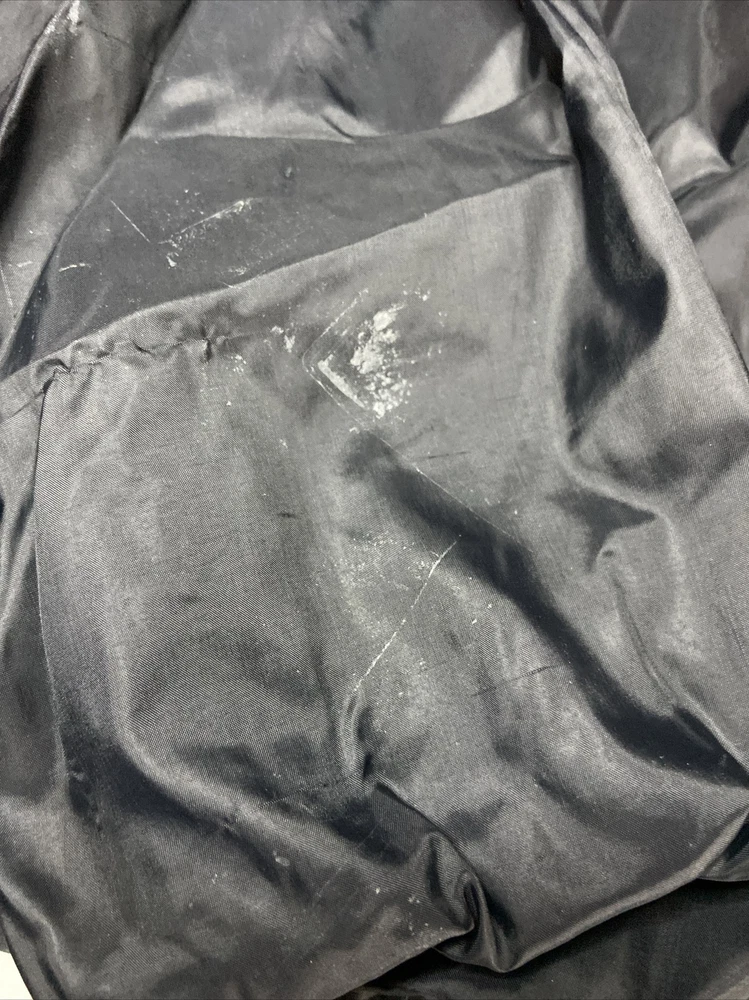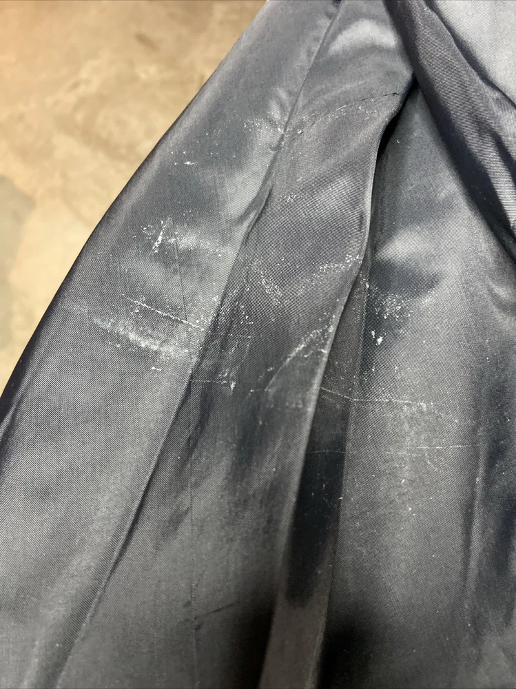 Don’t know much about this. Not originally mine. In somewhat rough shape. Stains on sleeves and holes in the inner jacket. Name written on inside. Would consider a collectors piece and not wearing this. Again, does have wear.