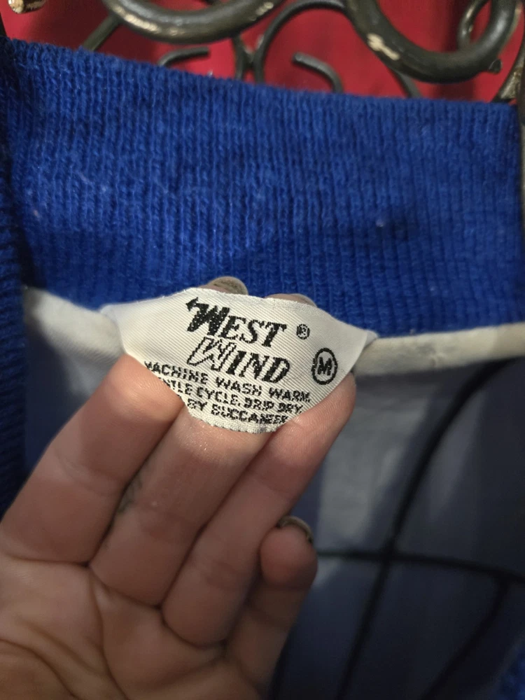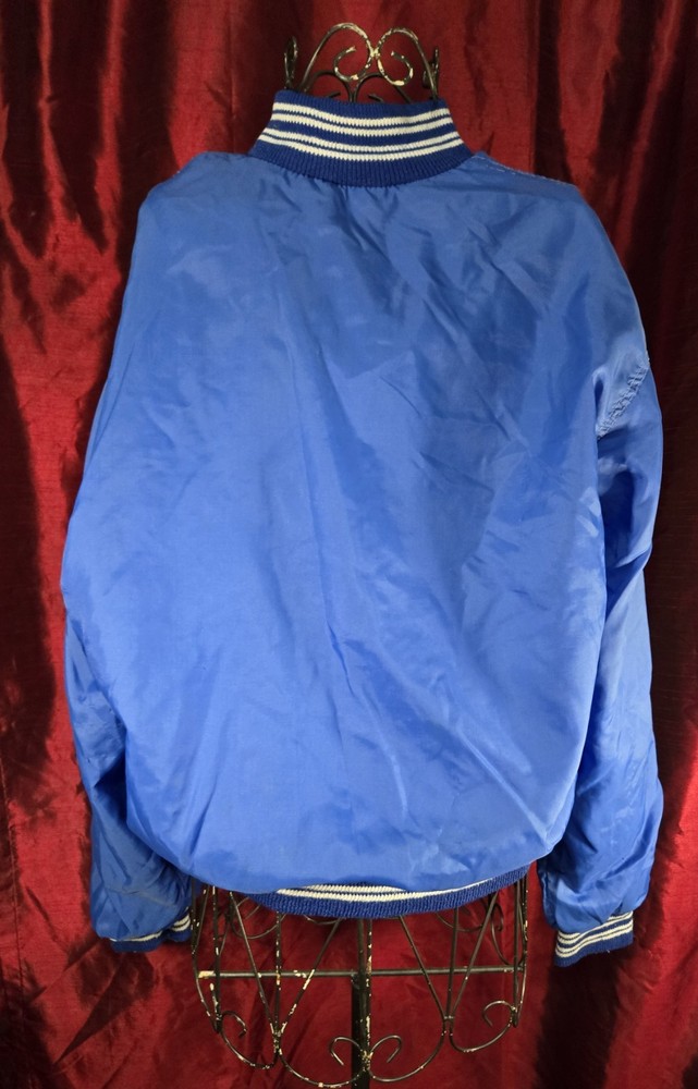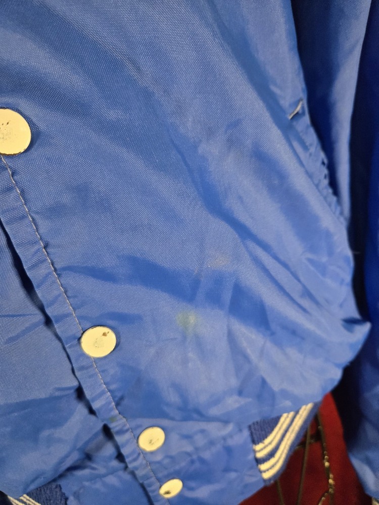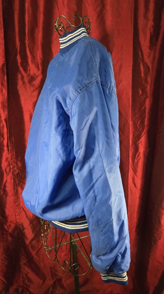 Add a touch of vintage style to your wardrobe with this West Wind Jacket from Buccaneer. The bomber jacket features a solid blue color with classic accents like a snap button closure and elastic waist. It is made of nylon with polyester lining and insulation, making it lightweight and breathable while providing warmth in all seasons. This mid-length jacket has pockets and a snap button collar, making it practical for casual occasions like walking. It is perfect for men in size XL who want a regular fit. The jacket is modeled after a Varsity Jacket with a classic 80s and 90s retro theme. Made in the United States, it is a classic piece that will never go out of style.