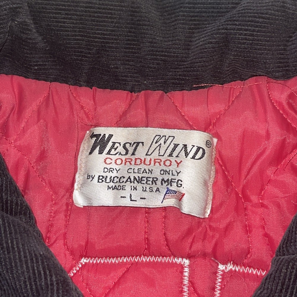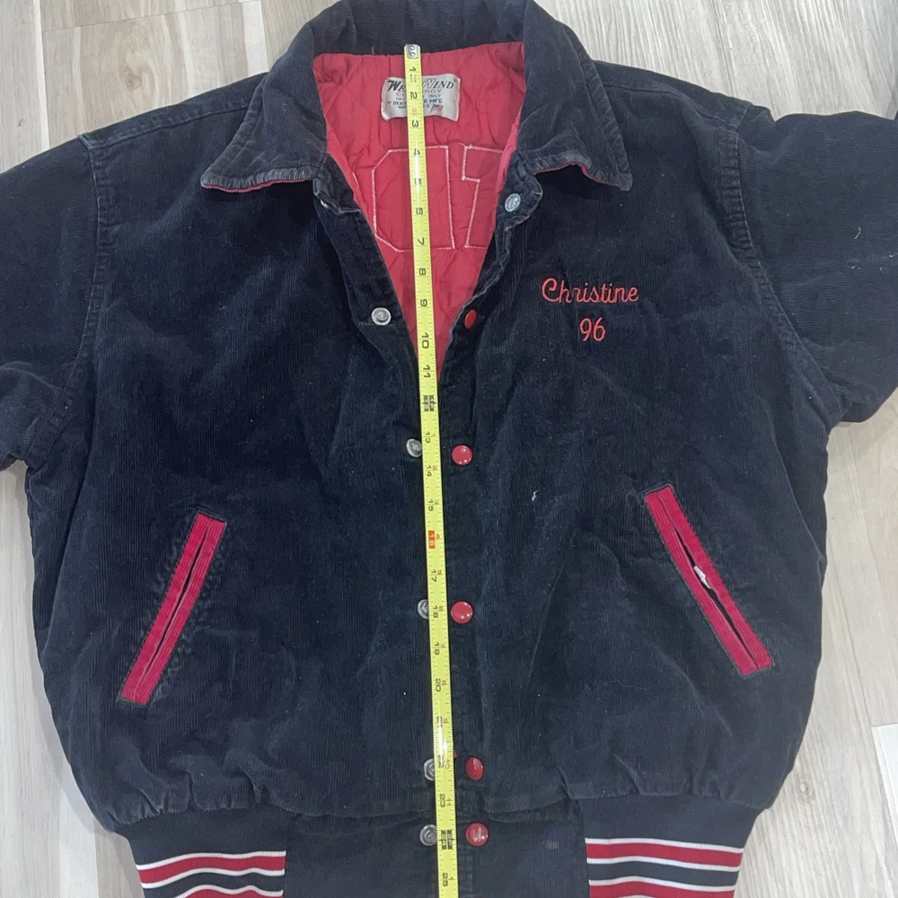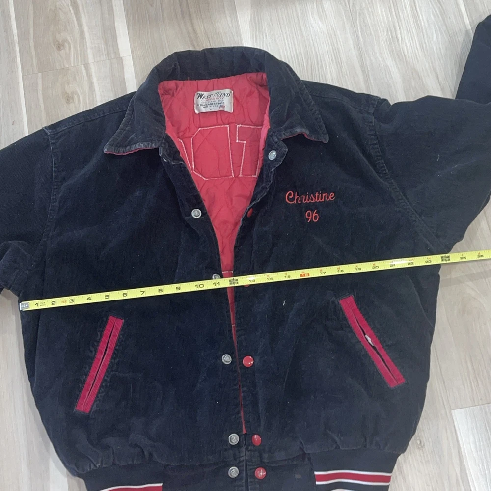 The Vintage West Wind Schnur Varsity Jacke L Hatboro Horsham Christine 96 is a classic black corduroy jacket with a mid-length cut and button closure. It features embroidered accents and is perfect for various occasions such as travel, parties, casual outings, and workwear. This retro-inspired jacket has a varsity style with a school, USA, university, and college theme, making it a timeless piece for any wardrobe. Made in the United States, this jacket is ideal for all seasons with its synthetic insulation and polyester lining for added comfort and warmth.