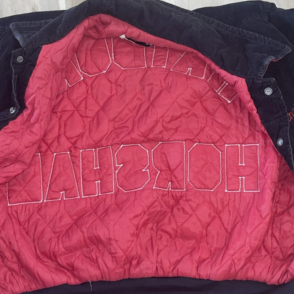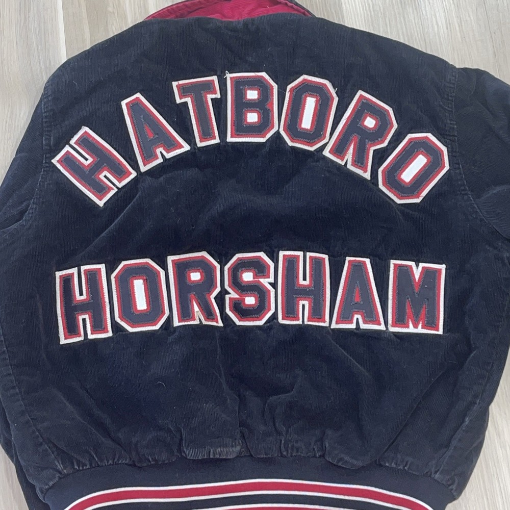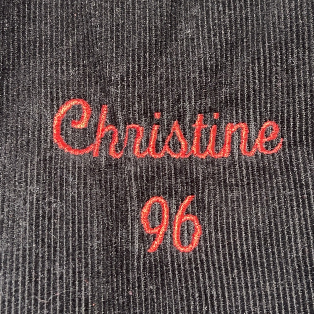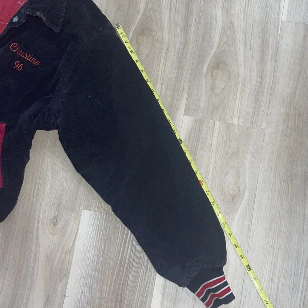 The Vintage West Wind Schnur Varsity Jacke L Hatboro Horsham Christine 96 is a classic black corduroy jacket with a mid-length cut and button closure. It features embroidered accents and is perfect for various occasions such as travel, parties, casual outings, and workwear. This retro-inspired jacket has a varsity style with a school, USA, university, and college theme, making it a timeless piece for any wardrobe. Made in the United States, this jacket is ideal for all seasons with its synthetic insulation and polyester lining for added comfort and warmth.