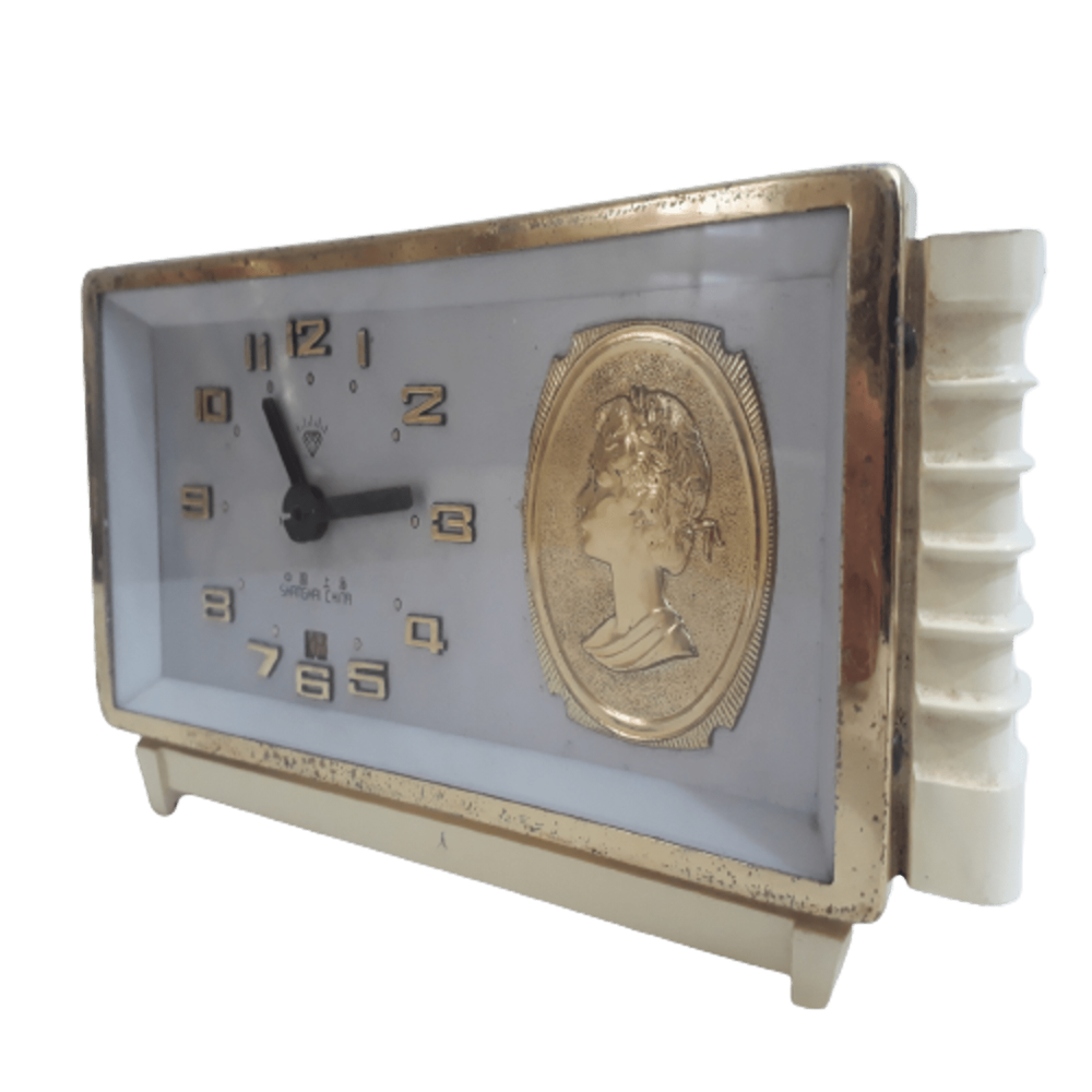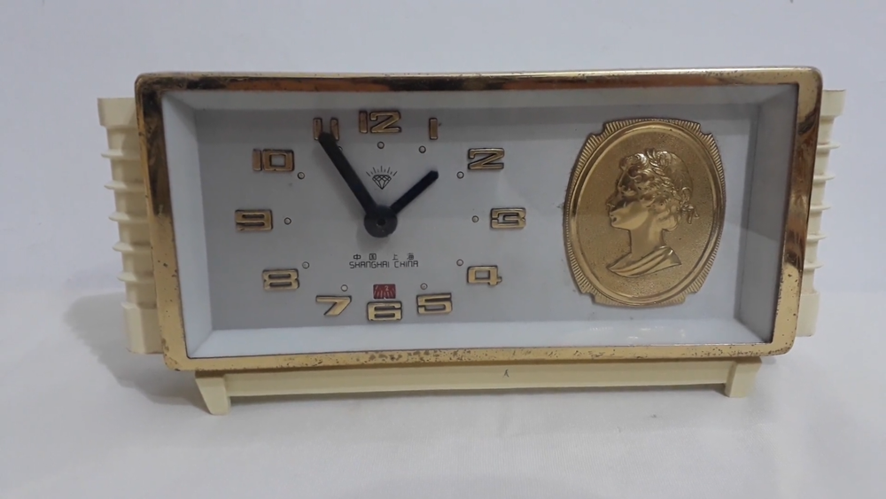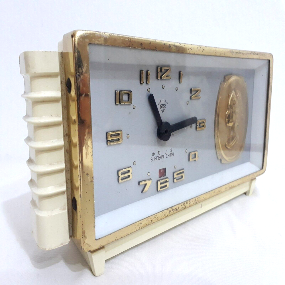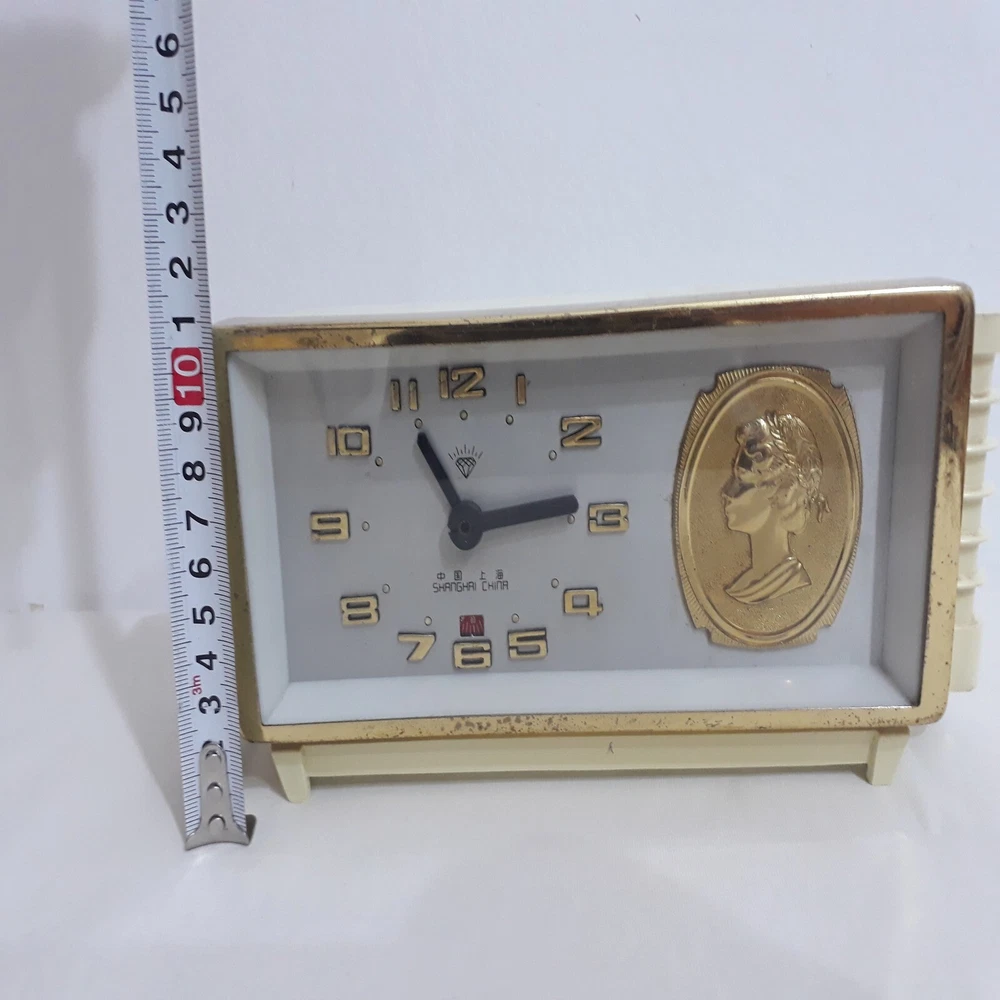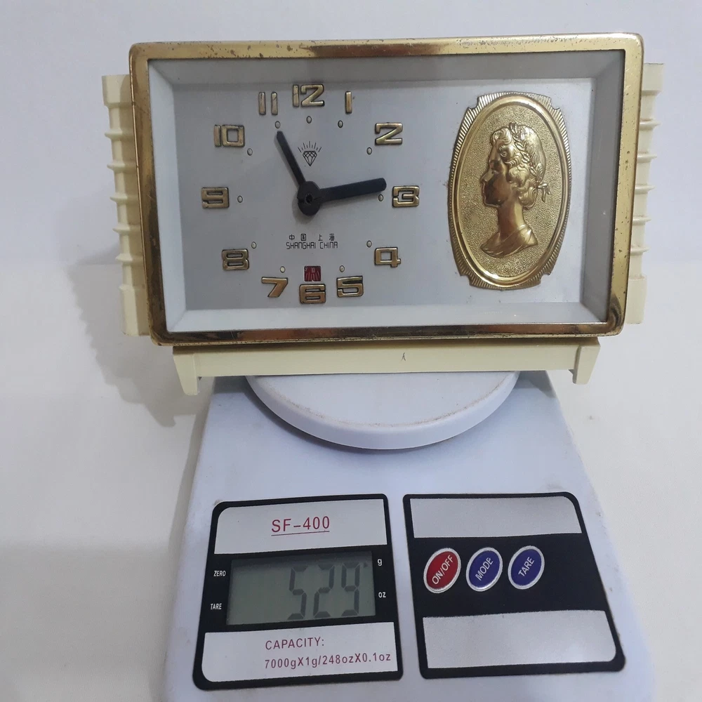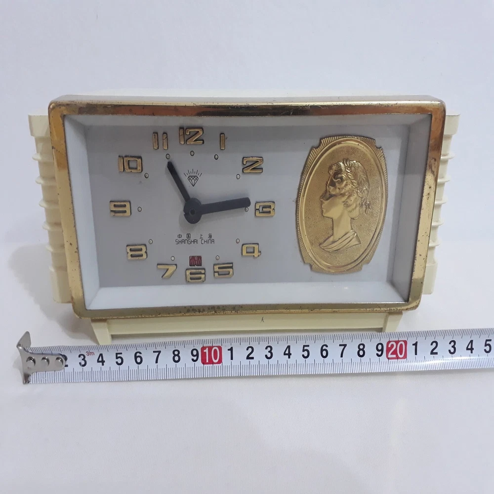 Vintage Wind Up Alarm Clock Diamond China Mechanical Wind-Up Golden Dial Working Queen Elizabeth Tested Works This beautifull vintage wind up alarm clock is manufactured by Diamond company in shanghai China, it has a gold color. The vintage wind up alarm clock was manufactured during the 70s. It is decorated with the face image of Queen Elizabeth II. It is a mechanical working alarm clock The vintage wind up alarm clock Rings and clock very well. you can see the video for more details. Item Dimension: Lenght: 23 cm (9 inch) Height: 11 cm (4.5 inch) Widht: 6 cm (2.3 inch) Weight: 529 gr See pictures and video for more details