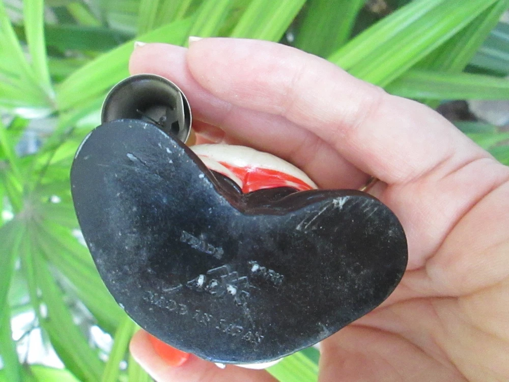 Wind him up and his head moves. 5" tall. Made of a not soft and not hard plastic, in between(if that makes sense). Made in Japan.. 1950s.. As you can see a lot of the red paint has come off..