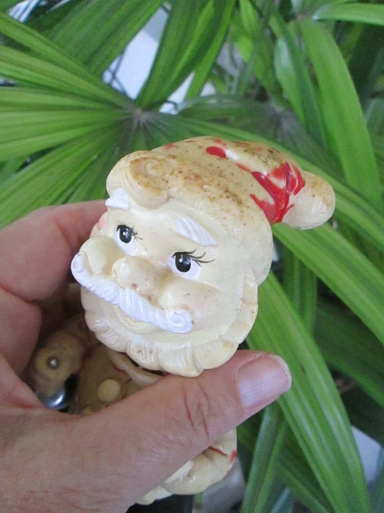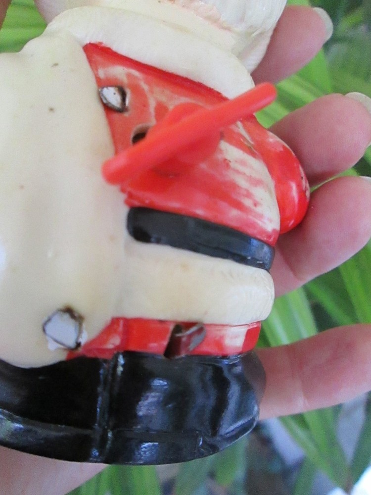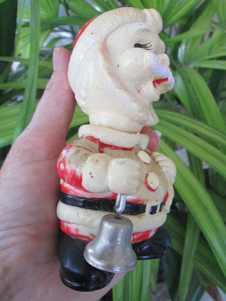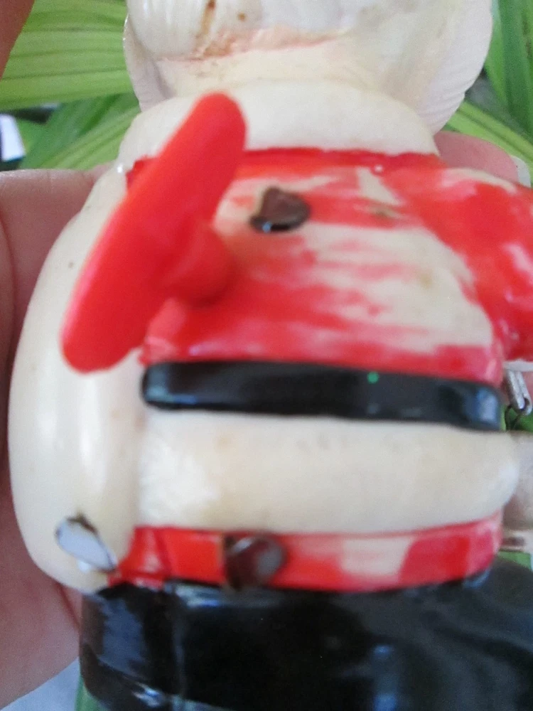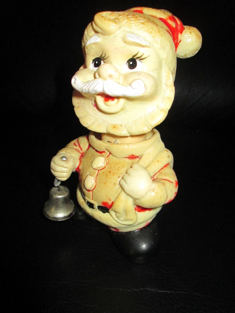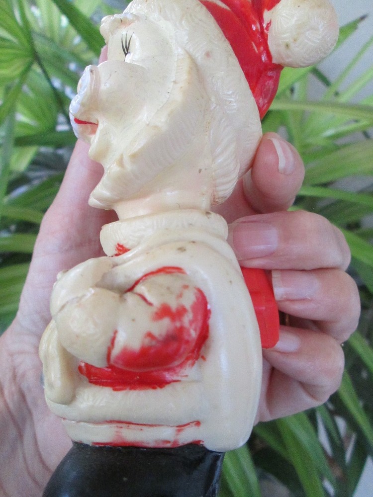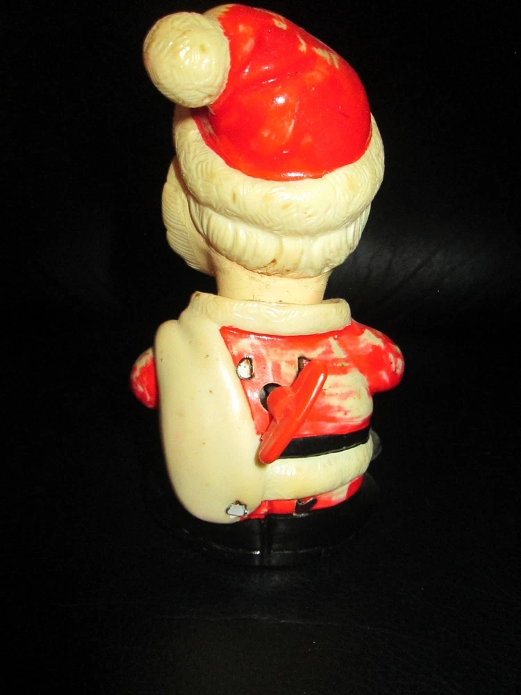 Wind him up and his head moves. 5" tall. Made of a not soft and not hard plastic, in between(if that makes sense). Made in Japan.. 1950s.. As you can see a lot of the red paint has come off.....