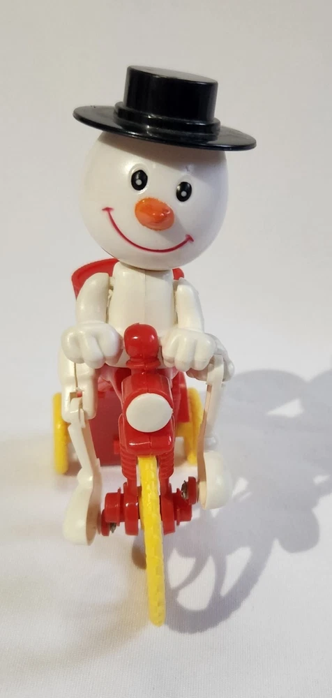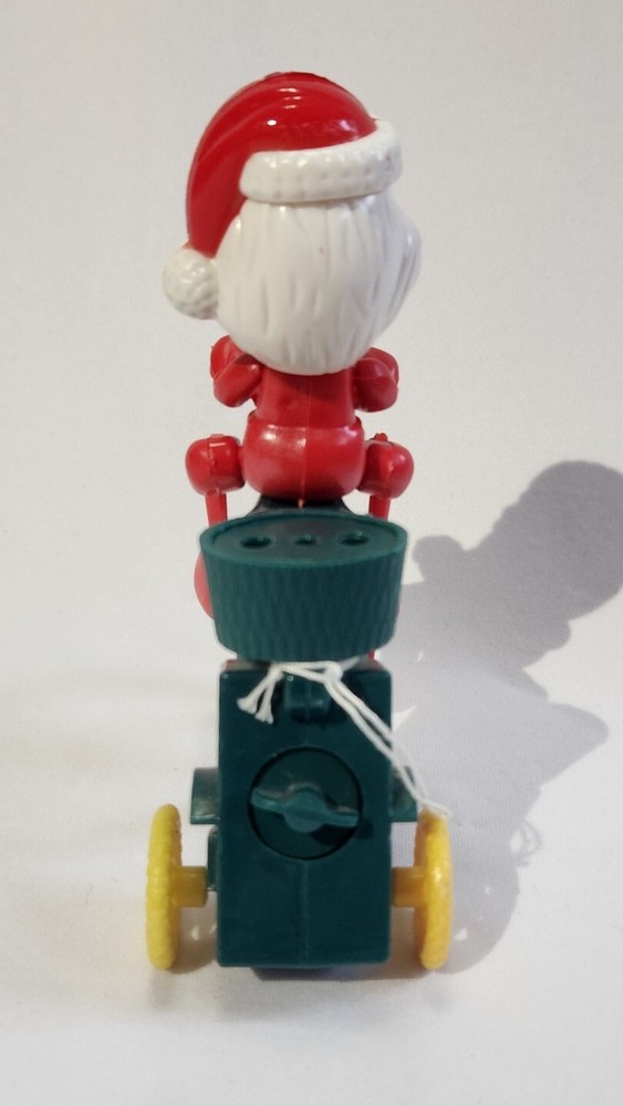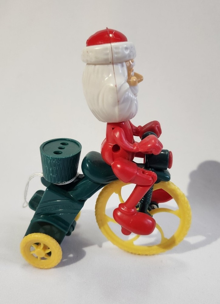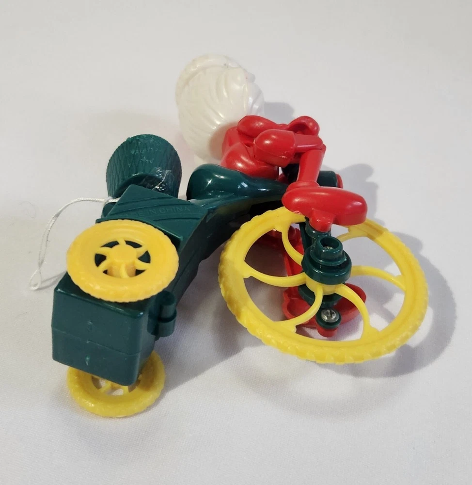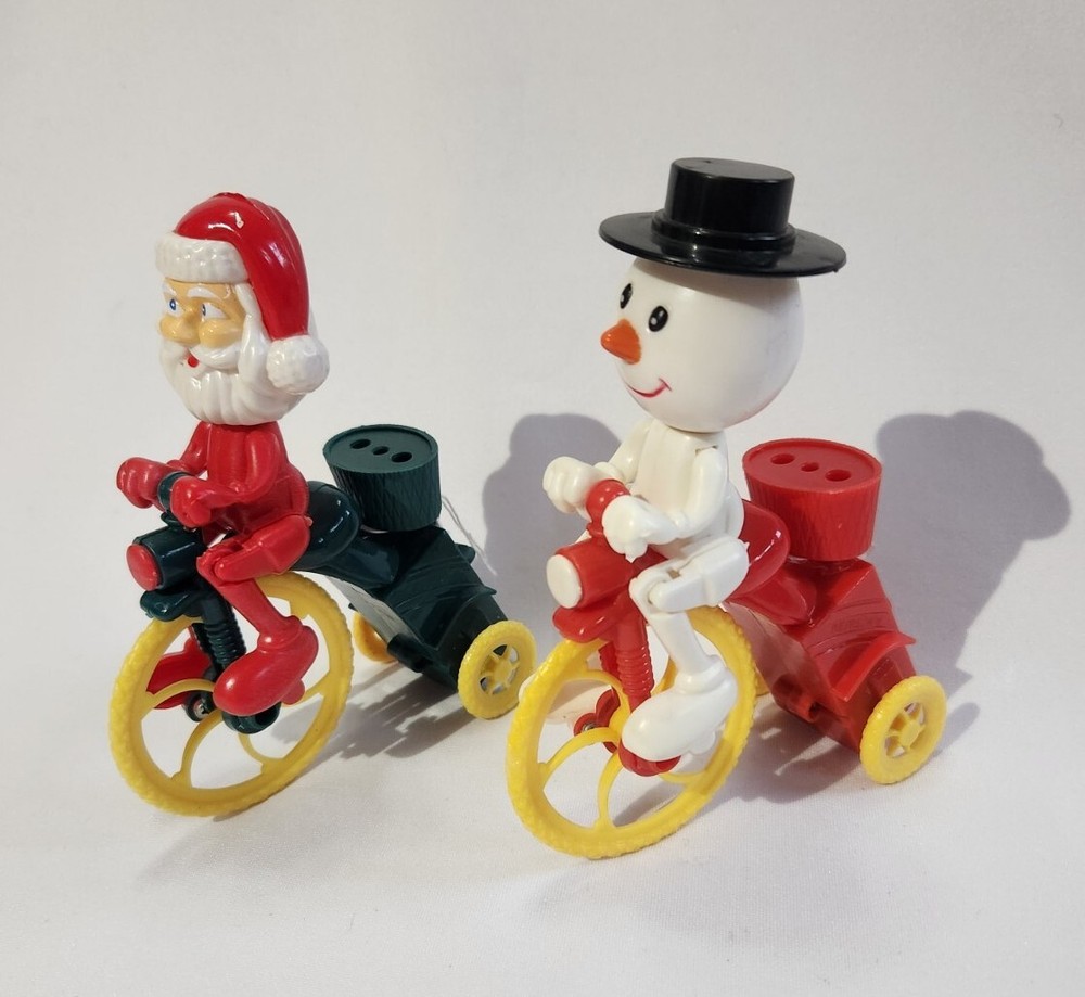 Add a vintage touch to your Christmas decor with this delightful wind-up toy featuring Santa Claus and a snowman riding a bicycle. The multicolor plastic figurine is perfect for collectors and fans of Christmas characters. It is a great addition to any toy collection and will bring joy to kids and adults alike. The toy is designed to feature a wins-up mechanism and is perfect for display or play. Get your hands on this unique Christmas decoration today! Measurements • 5.5" H x 4" L x 1.75" W