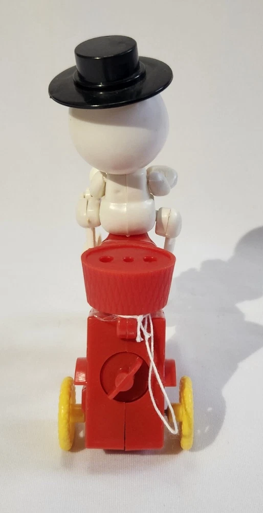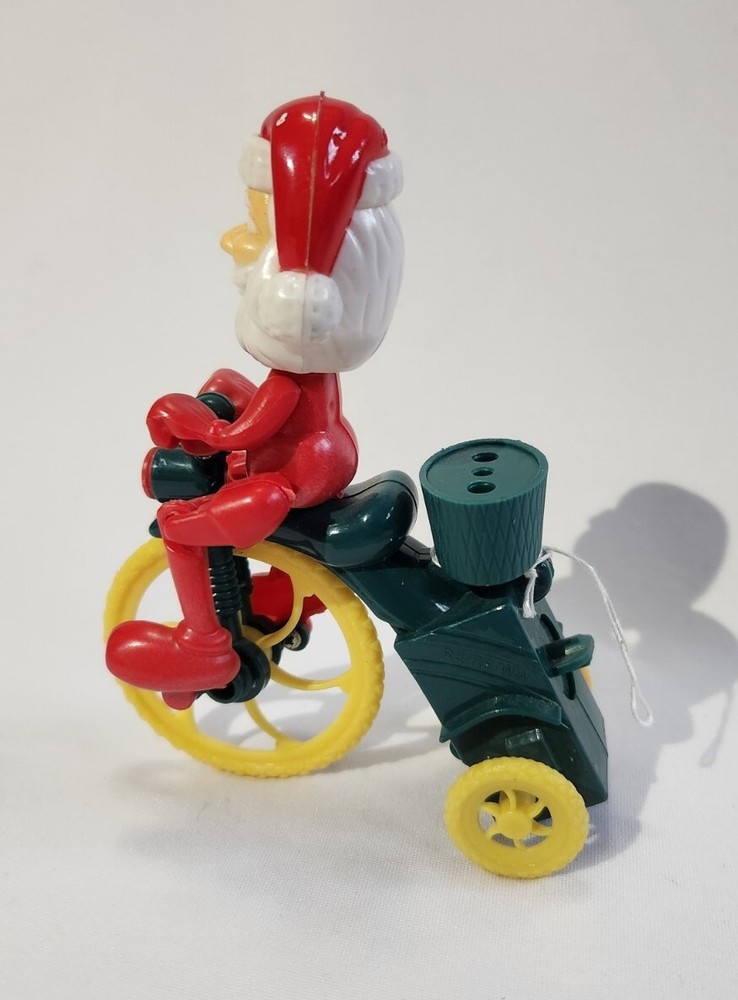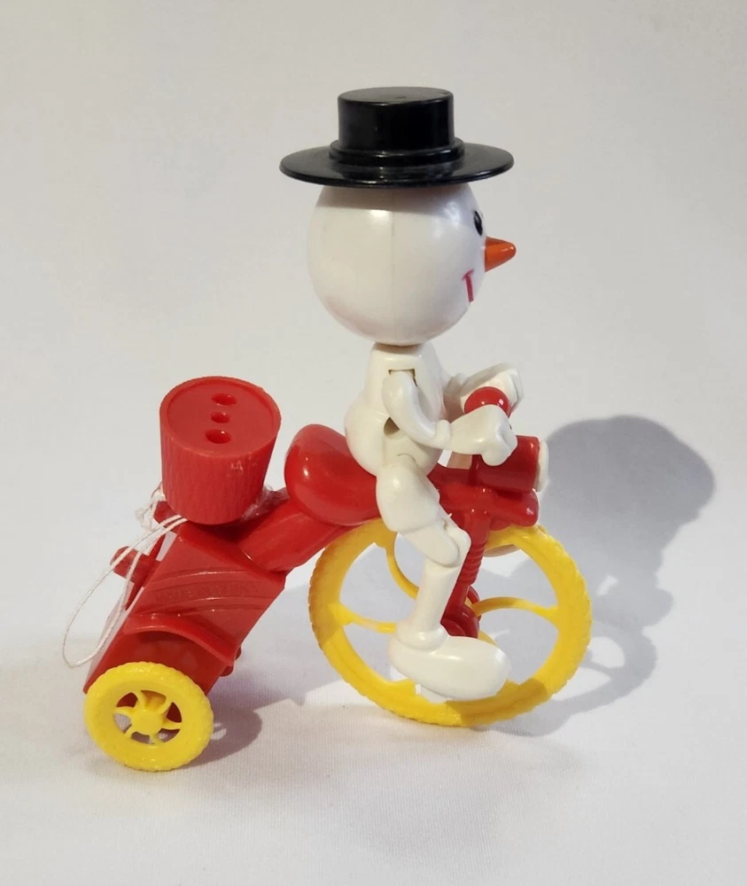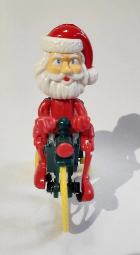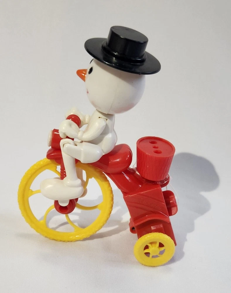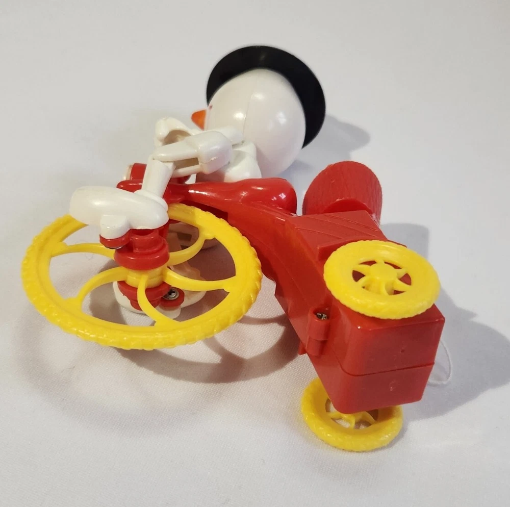 Add a vintage touch to your Christmas decor with this delightful wind-up toy featuring Santa Claus and a snowman riding a bicycle. The multicolor plastic figurine is perfect for collectors and fans of Christmas characters. It is a great addition to any toy collection and will bring joy to kids and adults alike. The toy is designed to feature a wins-up mechanism and is perfect for display or play. Get your hands on this unique Christmas decoration today! Measurements • 5.5" H x 4" L x 1.75" W