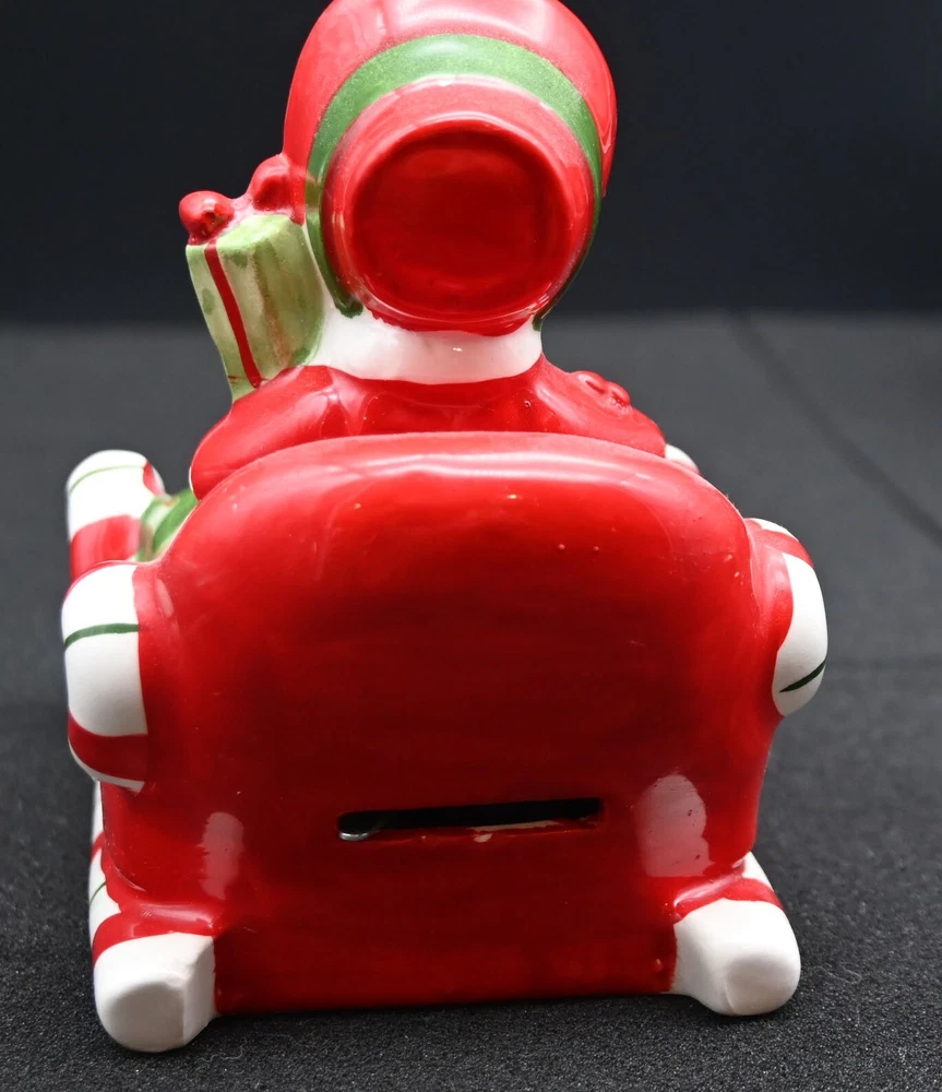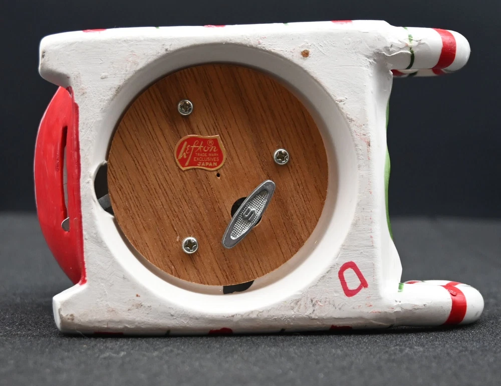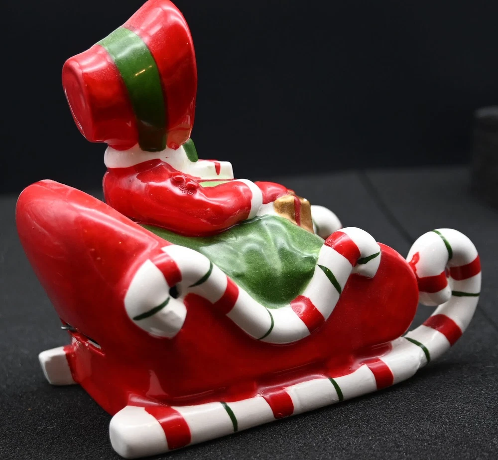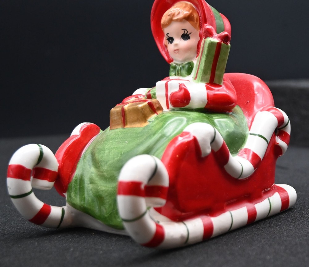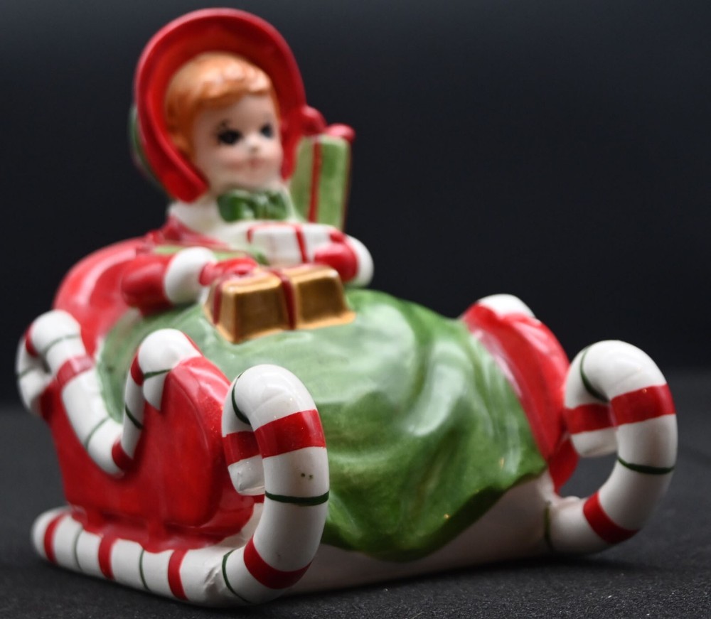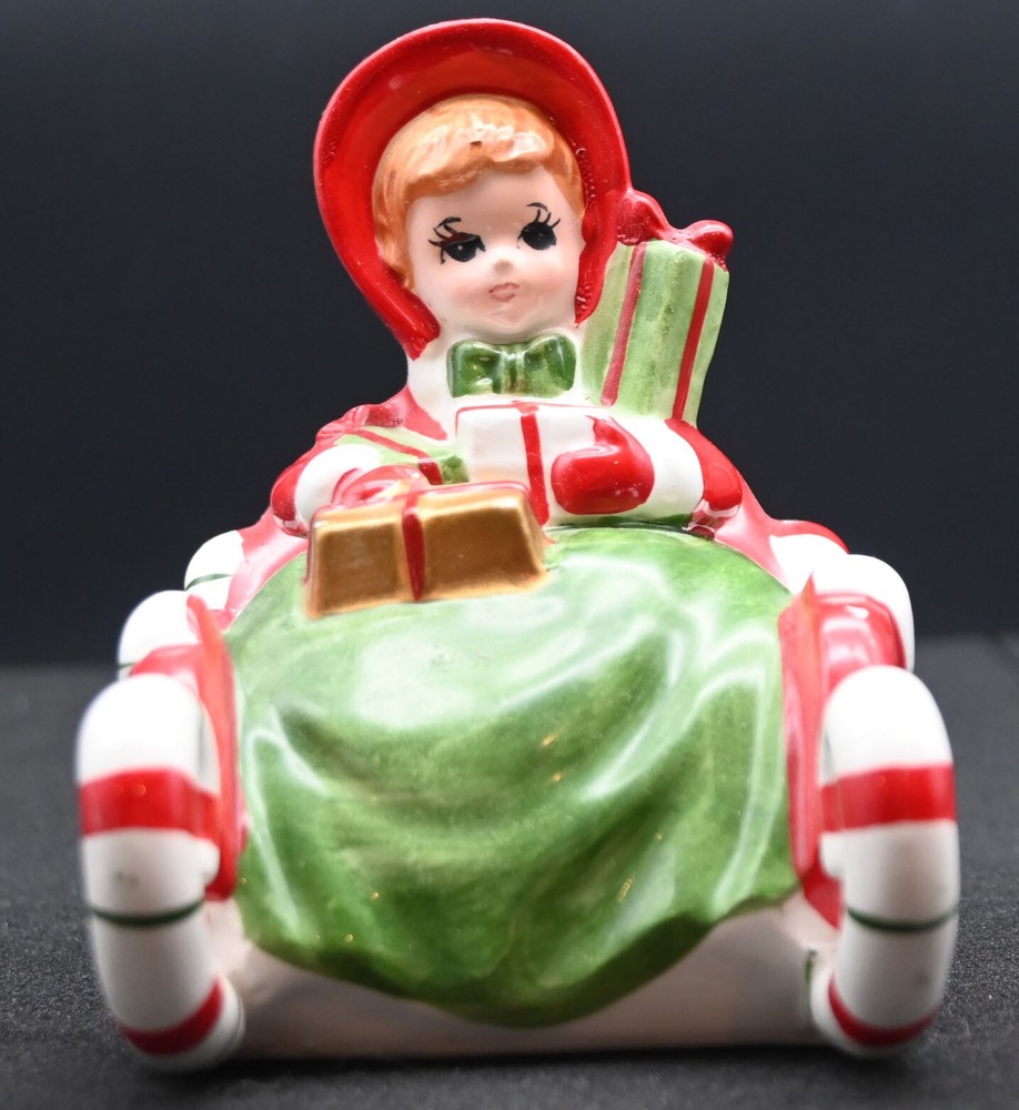 This cute and rare Lefton Japan musical Christmas decoration features a shopping girl riding in her sleigh with packages. Marked on the bottom with Sticker from Lefton and indicates it was made in Japan. Expertly packaged with bubble wrap and double-boxed for your convenience.
