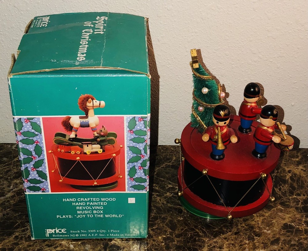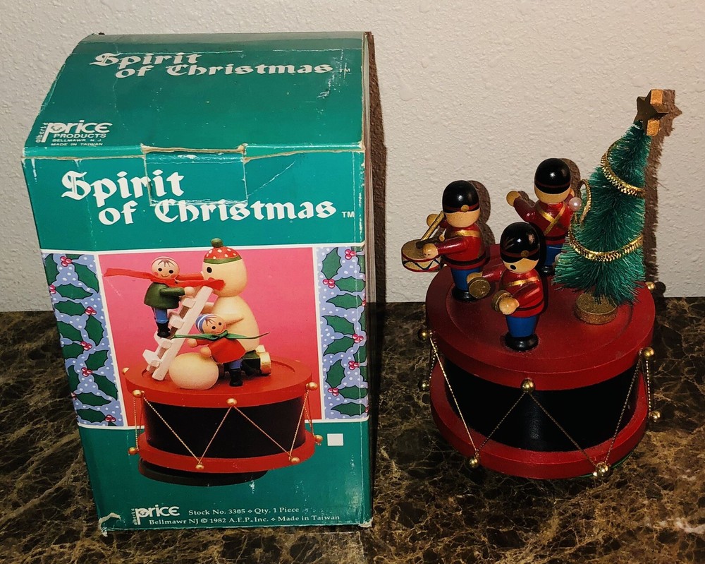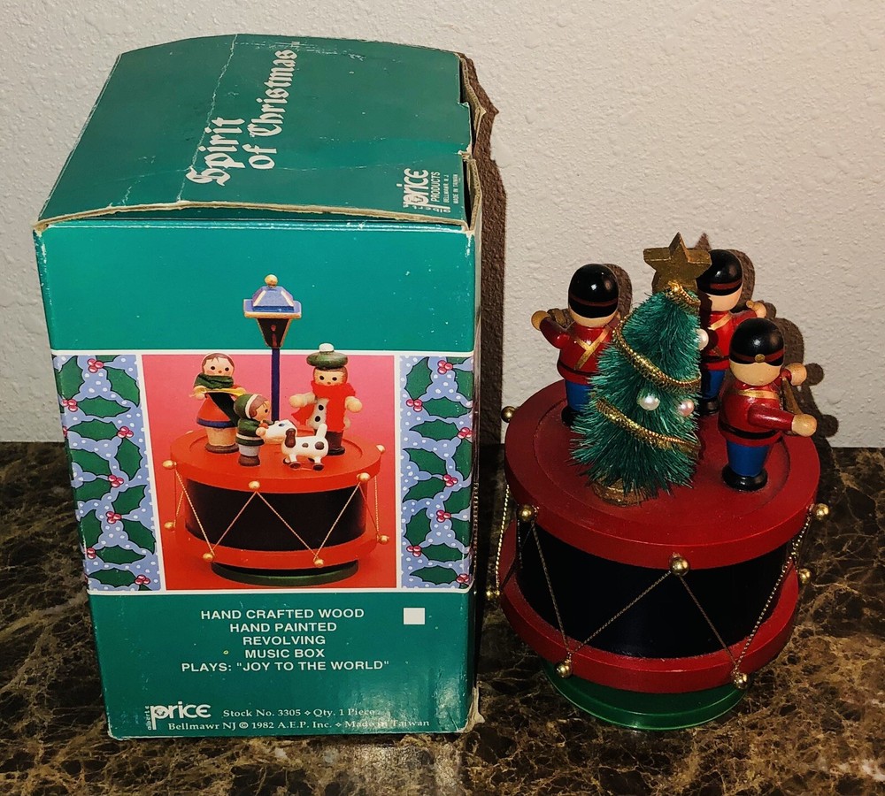 This vintage Spirit Of Christmas music box figurine is a charming addition to any room. Wind up the gear to hear "We Wish You A Merry Christmas" and watch as the band rotates. The painted wood figurine stands at 6.5 inches tall and 4.25 inches wide, making it the perfect size for gift-giving or decorating. The item, manufactured in 1982, comes in its original box and requires no additional parts. It is suitable for all ages and occasions, and would make a great addition to any holiday or seasonal collection. This original vintage piece is a rare find and is sure to bring joy to anyone who receives it.
