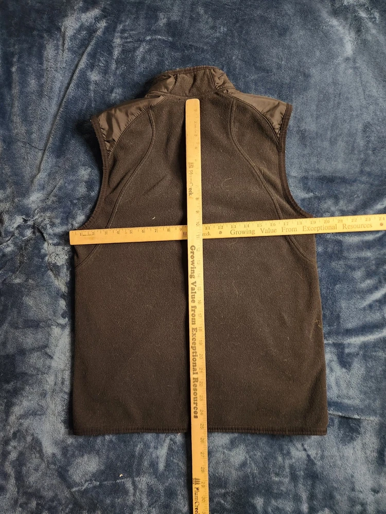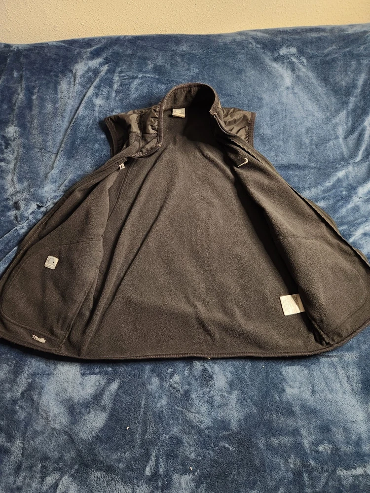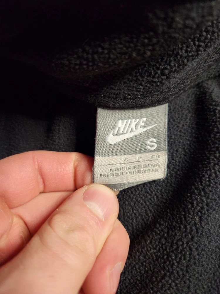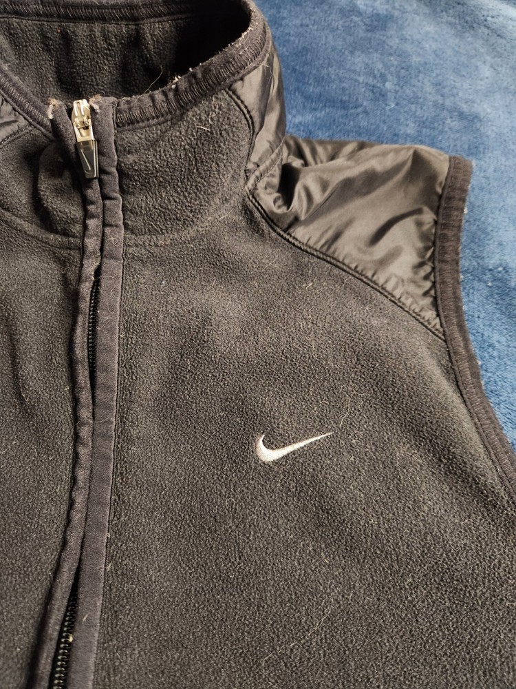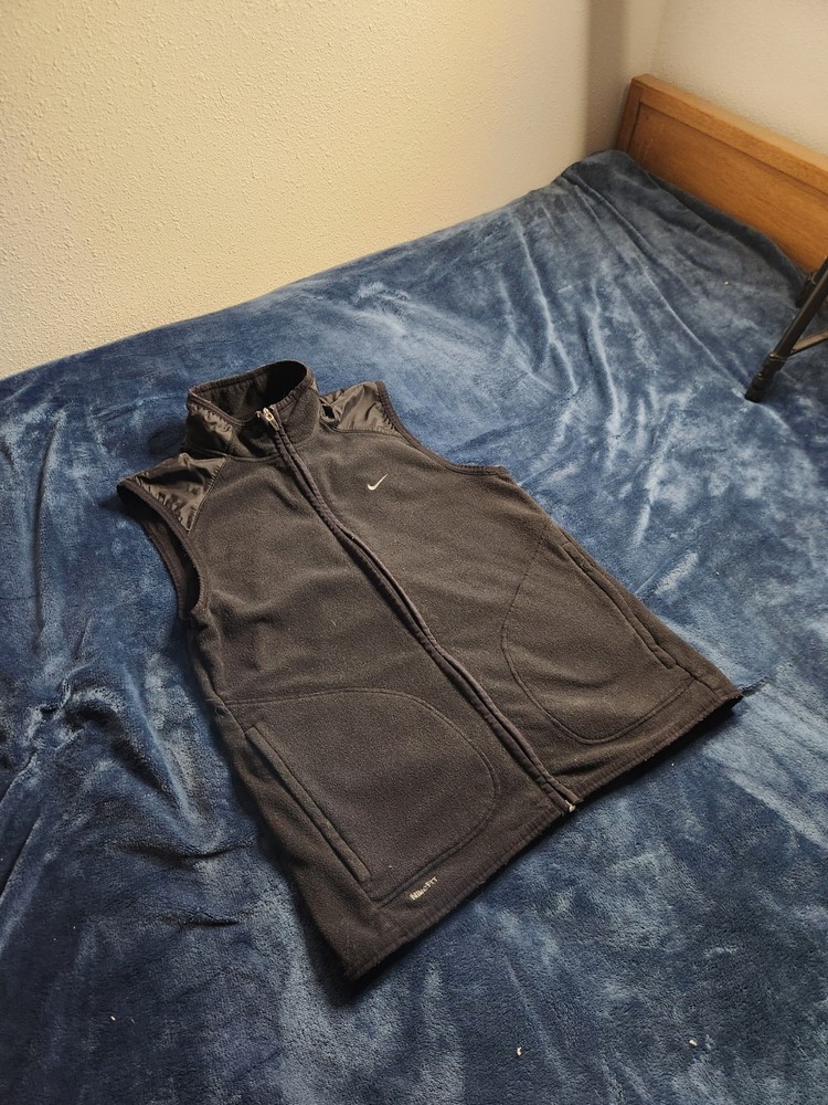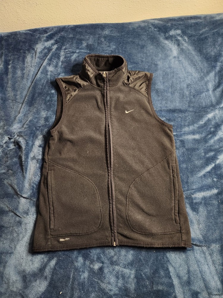 This Nike Dri-Fit vintage Y2K fleece vest is designed for men in size small. Featuring a full zip closure, stand-up collar, and black polyester outer shell, it offers zipped pockets, breathability, and wind-resistance. Ideal for travel, activewear, casual, or workwear, it is suitable for all seasons and activities like walking, running, and hiking. The vest showcases the iconic Nike Swoosh logo and a classic athletic style with a modern twist.