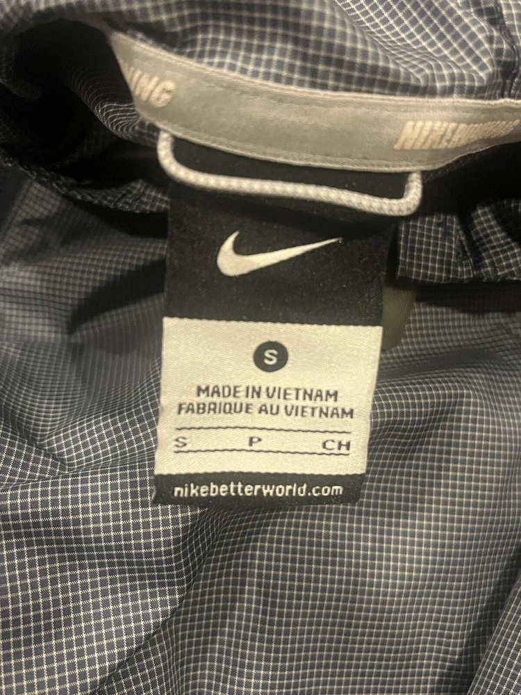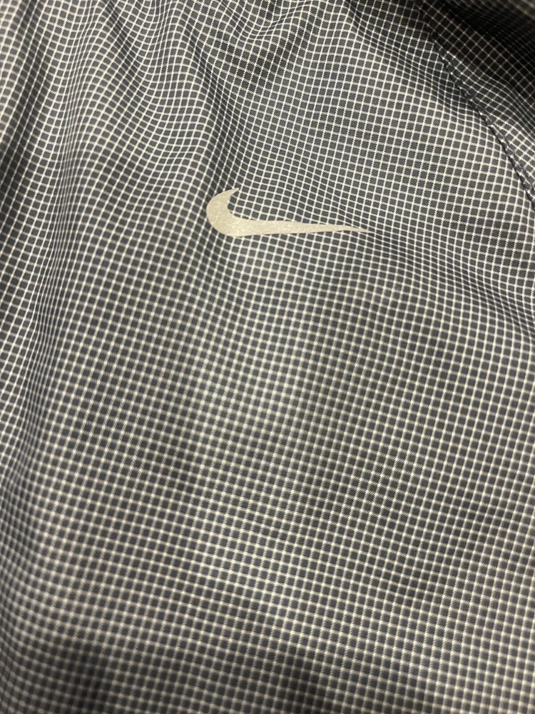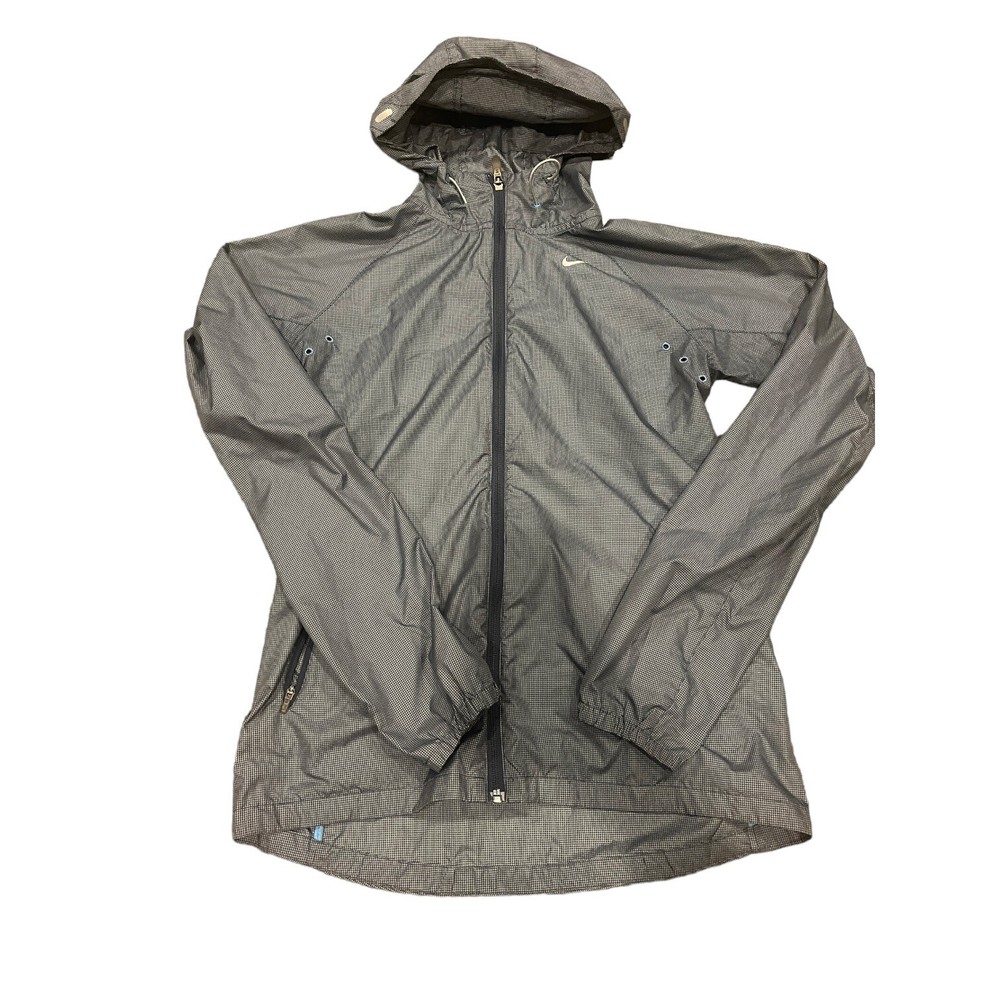 Elevate your activewear game with this vintage Y2K Nike women's running grid hooded windbreaker jacket in a stylish gray color. Made of 100% nylon, this mid-length jacket features a check pattern, long sleeves, and a full zip closure with reflective details for visibility. Perfect for any occasion, whether it's running and jogging or just enjoying the outdoors, this jacket is wind-resistant and water-resistant, making it a great choice for all seasons. With zipped pockets and a hood, this jacket is both practical and fashionable. The Nike Air product line ensures a comfortable fit, and the jacket is quick-drying and lightweight. Ideal for women who love nature, happy, nautical, and preppy themes, this jacket is perfect for school, college, and outdoor activities. B6