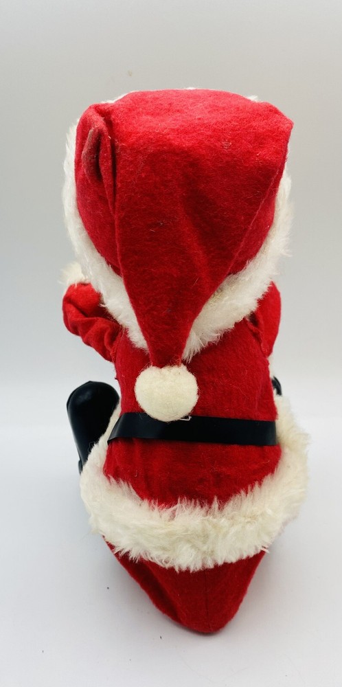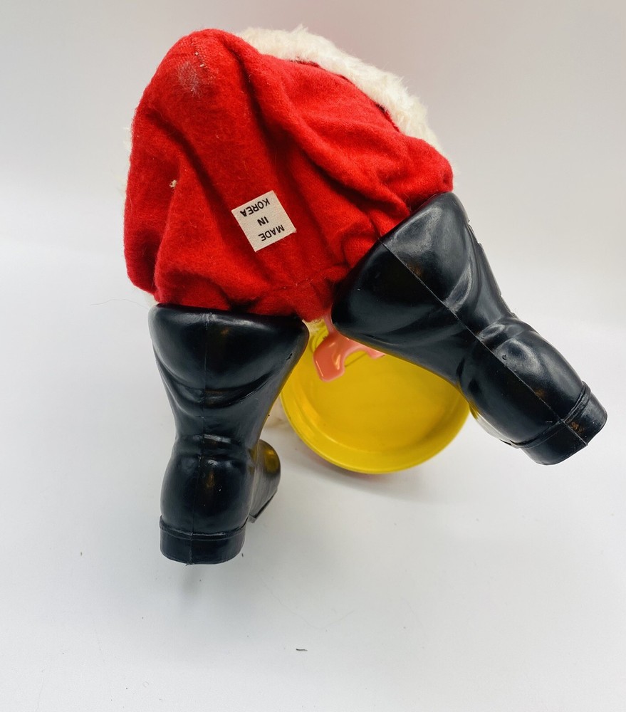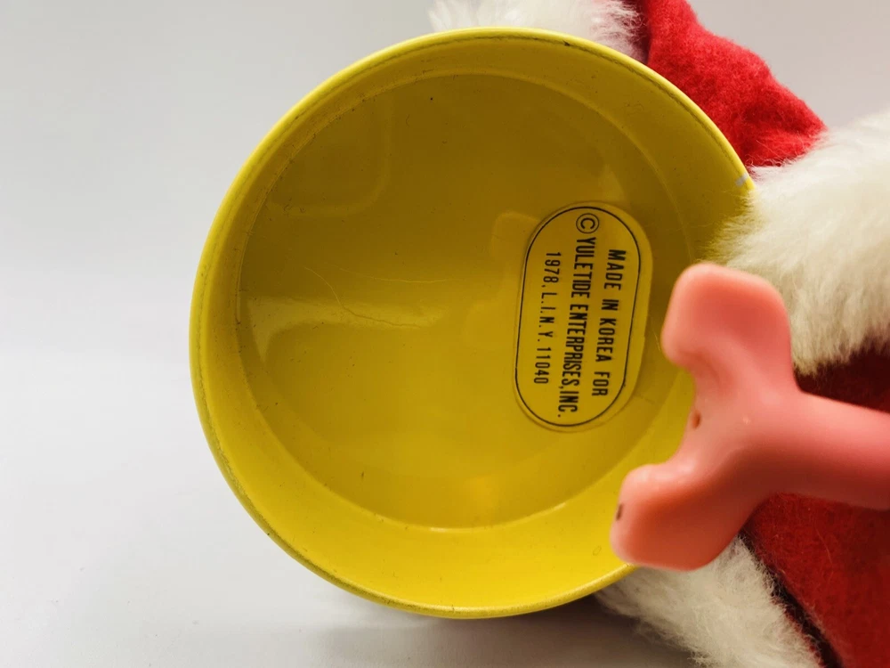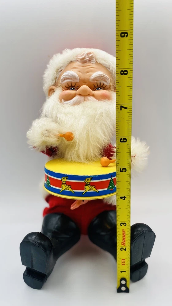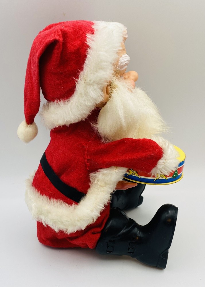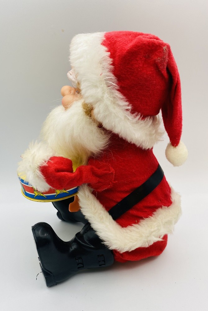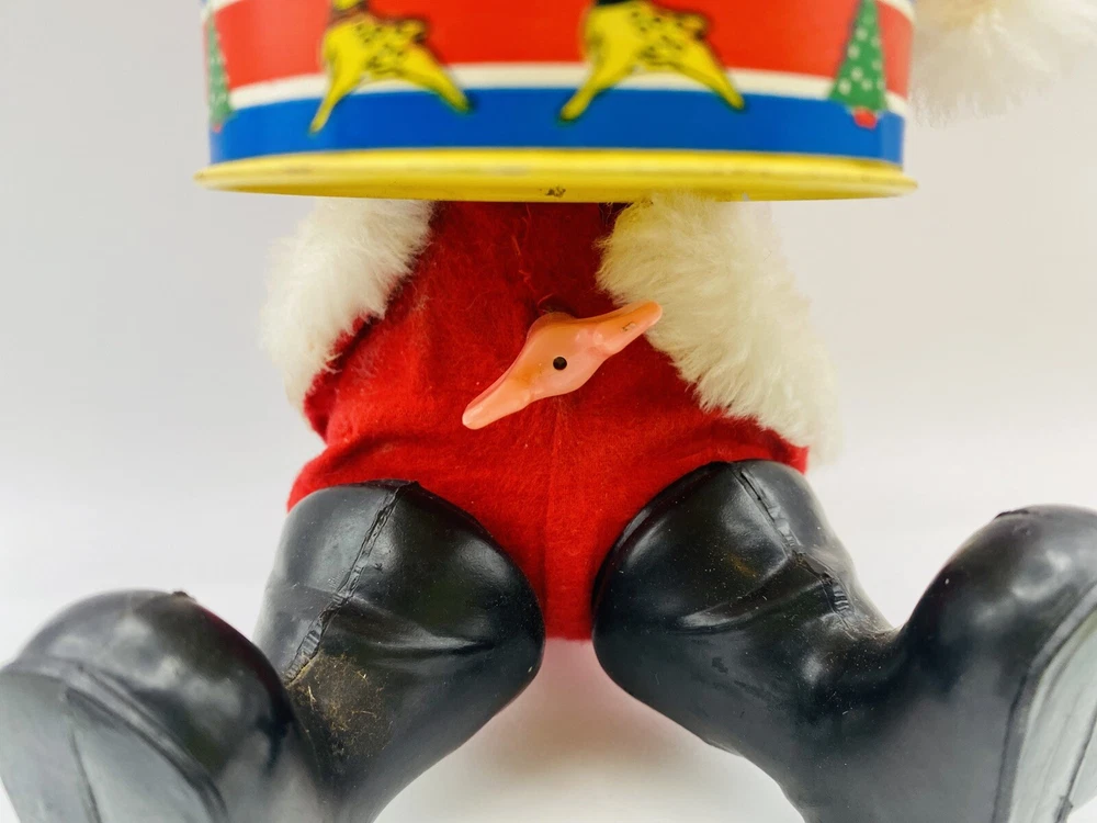 This medium-sized wind-up toy features a jolly Santa figure in a red outfit, complete with a drum and drumsticks. Made by Yuletide Enterprises in 1978. Works perfect, just wind him up gently, and he starts drumming and moving up and down.