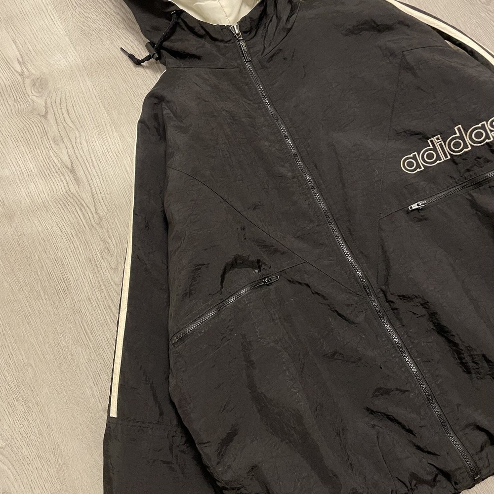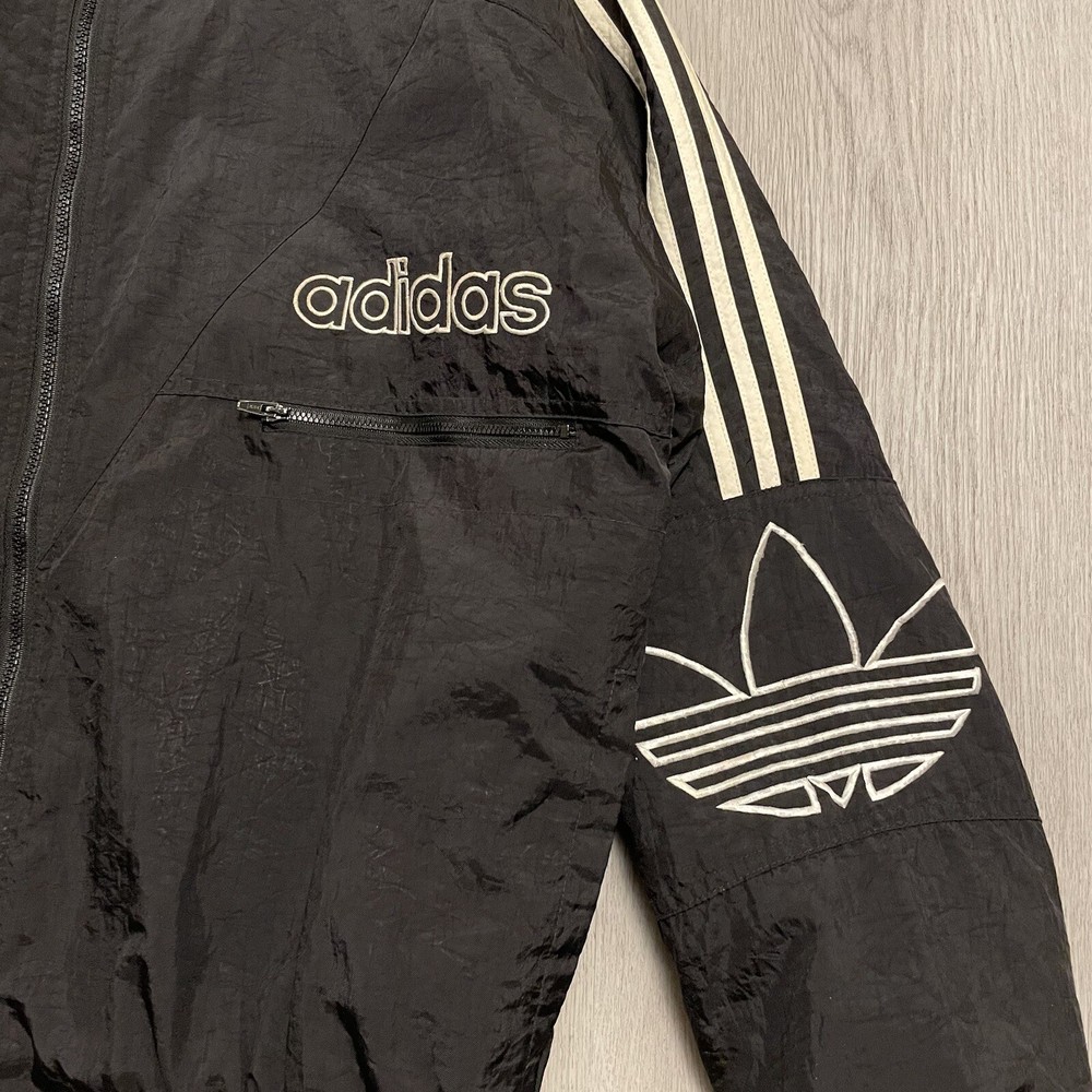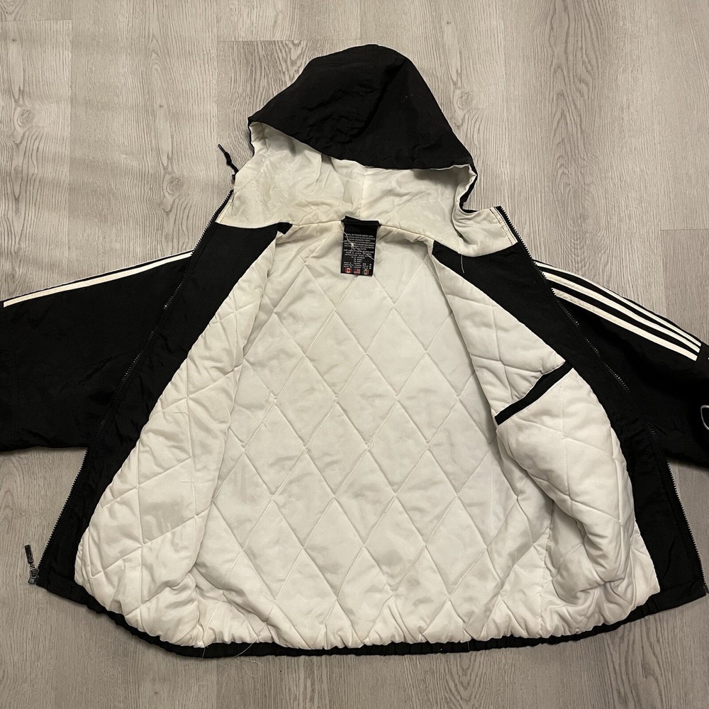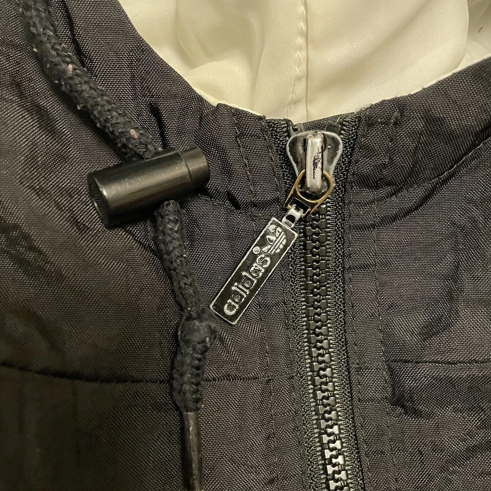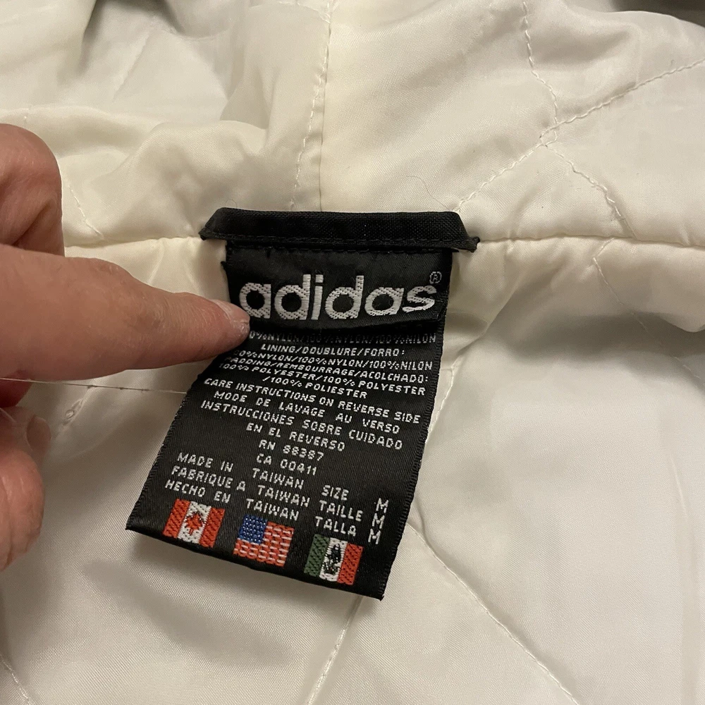Beautiful rare 90s adidas jacket Some very minuscule flaws pictured Measurements in photos This is a vintage men's puffer jacket from adidas, made of nylon and canvas with a polyester lining and insulation. It features a stand-up collar, hood, full zip closure, and pockets. The jacket is wind-resistant and suitable for all seasons. The black jacket has an embroidered big logo and a solid pattern. The jacket is machine washable and fits in a classic style. It is a mid-length jacket with long sleeves and is a size medium. The jacket has a colorful, grunge, and hipster theme and is suitable for various sports and activities.