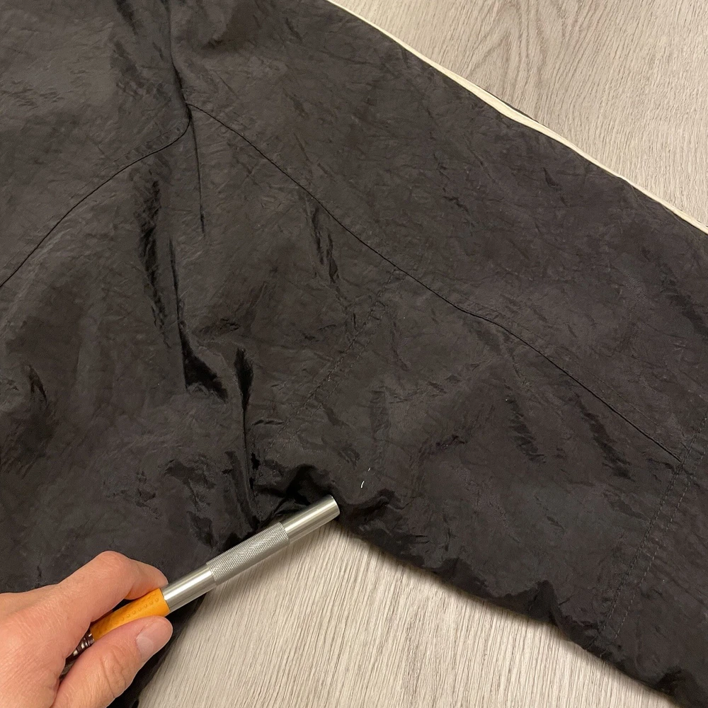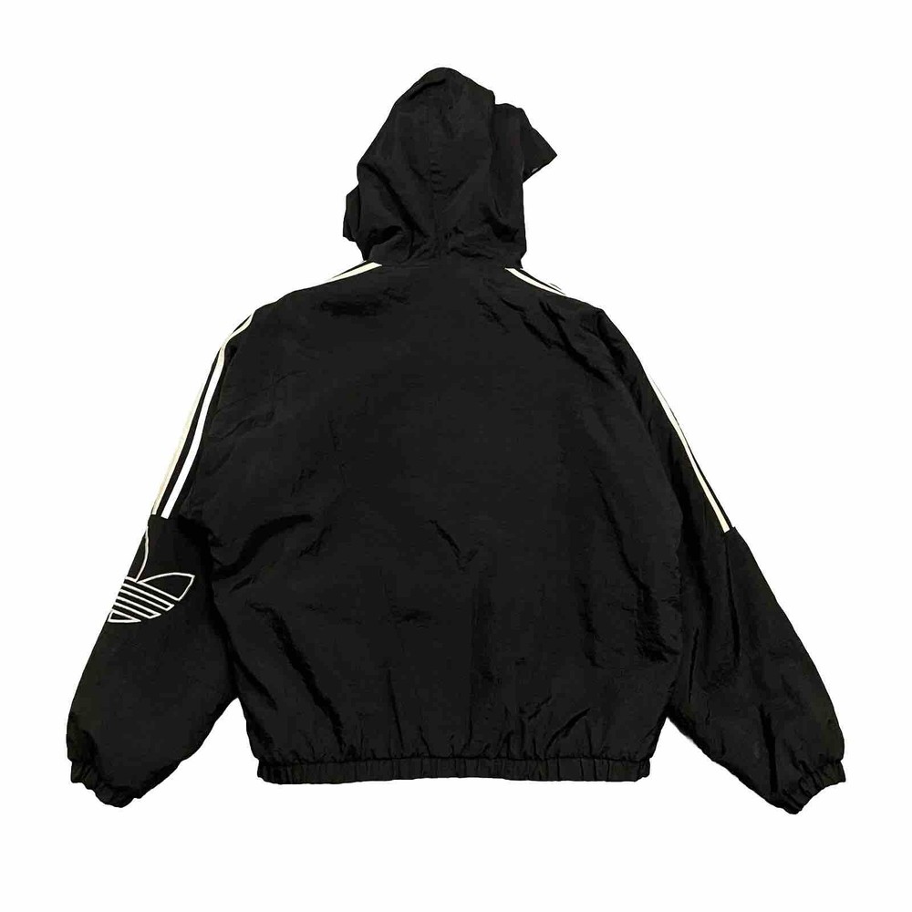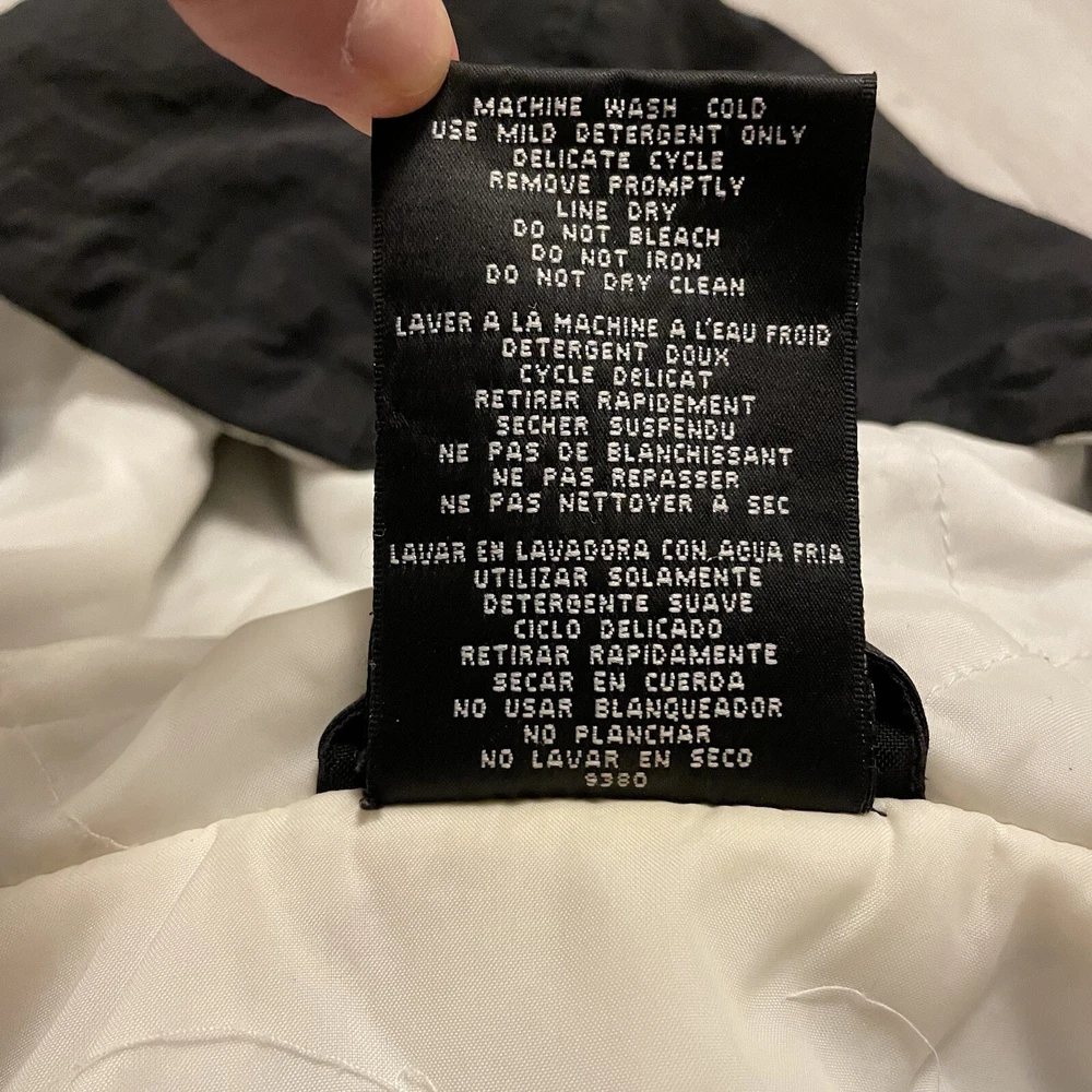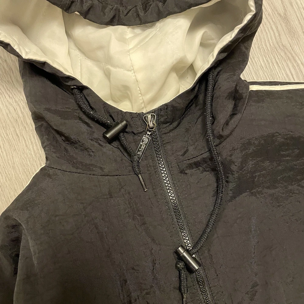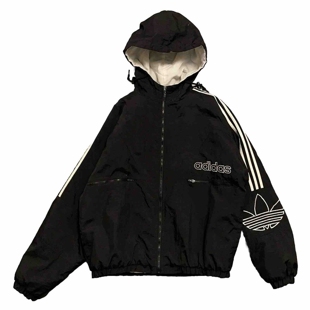 Beautiful rare 90s adidas jacket Some very minuscule flaws pictured Measurements in photos This is a vintage men's puffer jacket from adidas, made of nylon and canvas with a polyester lining and insulation. It features a stand-up collar, hood, full zip closure, and pockets. The jacket is wind-resistant and suitable for all seasons. The black jacket has an embroidered big logo and a solid pattern. The jacket is machine washable and fits in a classic style. It is a mid-length jacket with long sleeves and is a size medium. The jacket has a colorful, grunge, and hipster theme and is suitable for various sports and activities.