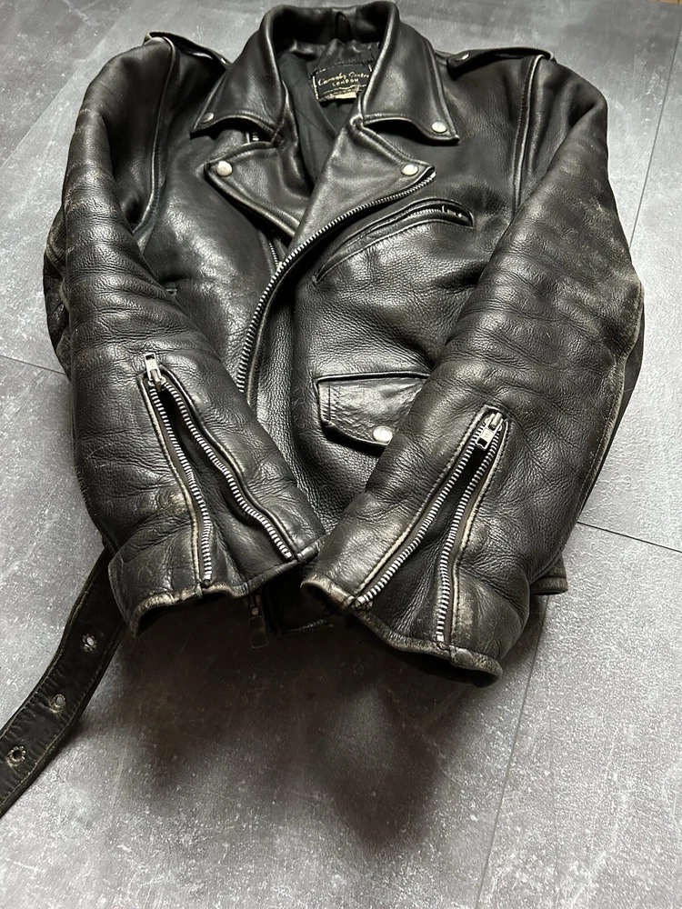 Get ready to hit the road in style with this vintage biker racer jacket. Made from genuine leather, this jacket is the perfect combination of fashion and function. The black leather jacket features a classic fit, short length, and a solid pattern with accents of a belt, button, and zipper. The jacket is suitable for both casual and formal occasions and is wind and water-resistant, making it perfect for all seasons. It also features zipped pockets, a full zip, and a belted closure for added comfort and style. This jacket is a must-have for any biker or racer enthusiast and is available in size S. Dry clean only. 🔗🔗‼️ATTENTION‼️🔗🔗 ⛓️ Go through every details picture ⛓️ Refer manual measurements ⛓️ No refund/return ⛓️ Don't forget to leave your phone number ⛓️ Enjoy the shopping I'm shipping from Poland - shipping term - - USA - (1-3 weeks) - Europe - (5-7 days) - Canada - (2-3 weeks) - Australia - (2-3 weeks) -delivery terms are written with a margin, often the delivery time is much shorter. -Please write your mobile phone number when ordering in the format + (country code)!!!!!!! I indicate the phone number in the post office when sending the parcel