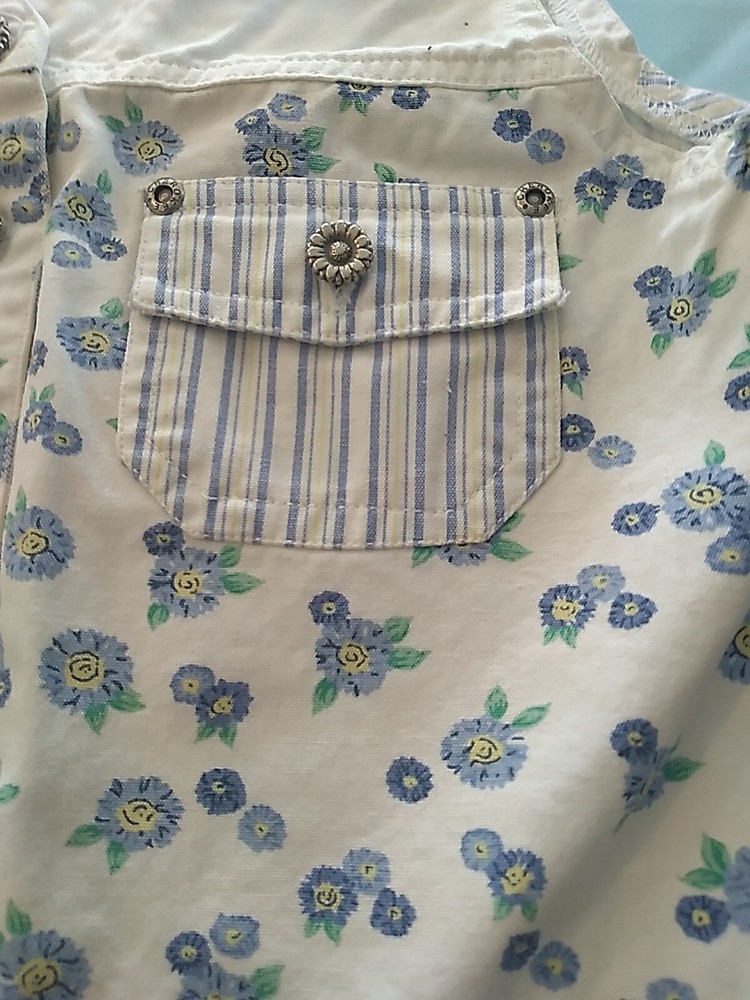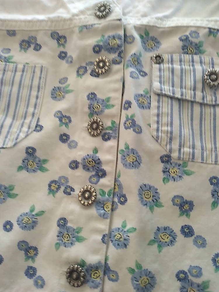This vintage denim jean vest from Cherokee is a must-have for any fashion-forward woman in blue floral print with blue and yellow stripe patternThe floral pattern and bronze metal buttons add a touch of Western style, while the biker and hipster themes make it perfect for casual occasions. The vest is made of cotton and is machine washable for easy care. It features a collarless design, adjustable straps on the back waist, and a wind-resistant construction, making it suitable for all seasons. The vest is a size L and has a short length, making it ideal for layering over a tank top or a long-sleeved shirt. Whether you're going for a retro or vintage look, this Cherokee jean vest is the perfect addition to your wardrobe.