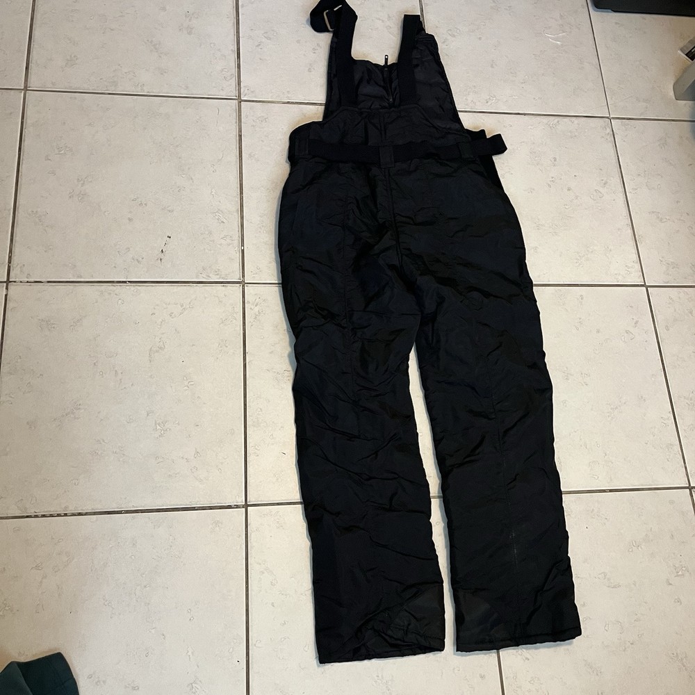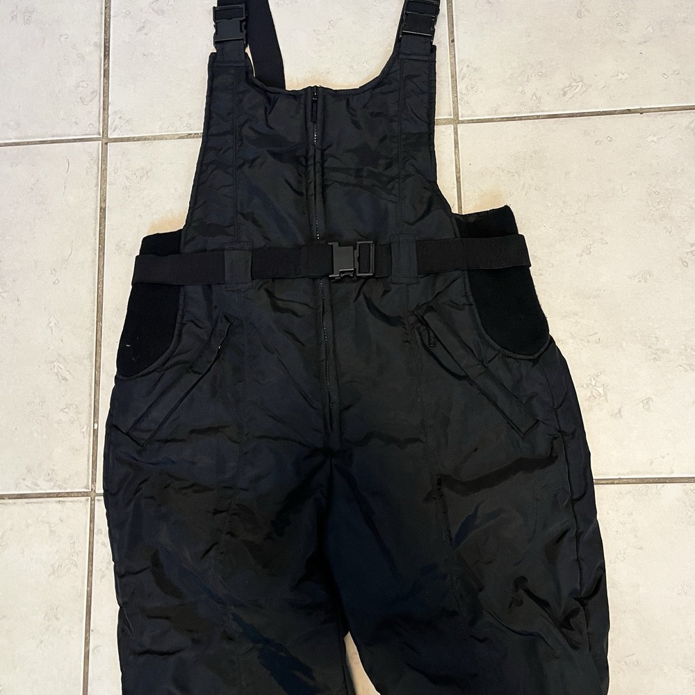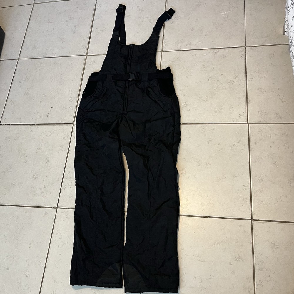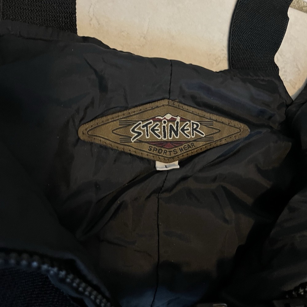 The men's ski suit overalls in size L by Steiner are a vintage black snowsuit designed for skiing. This ski bib features windproof, thermal, breathable, and water-resistant properties, making it suitable for all seasons. The insulated suit is easy to care for and ideal for skiing activities.