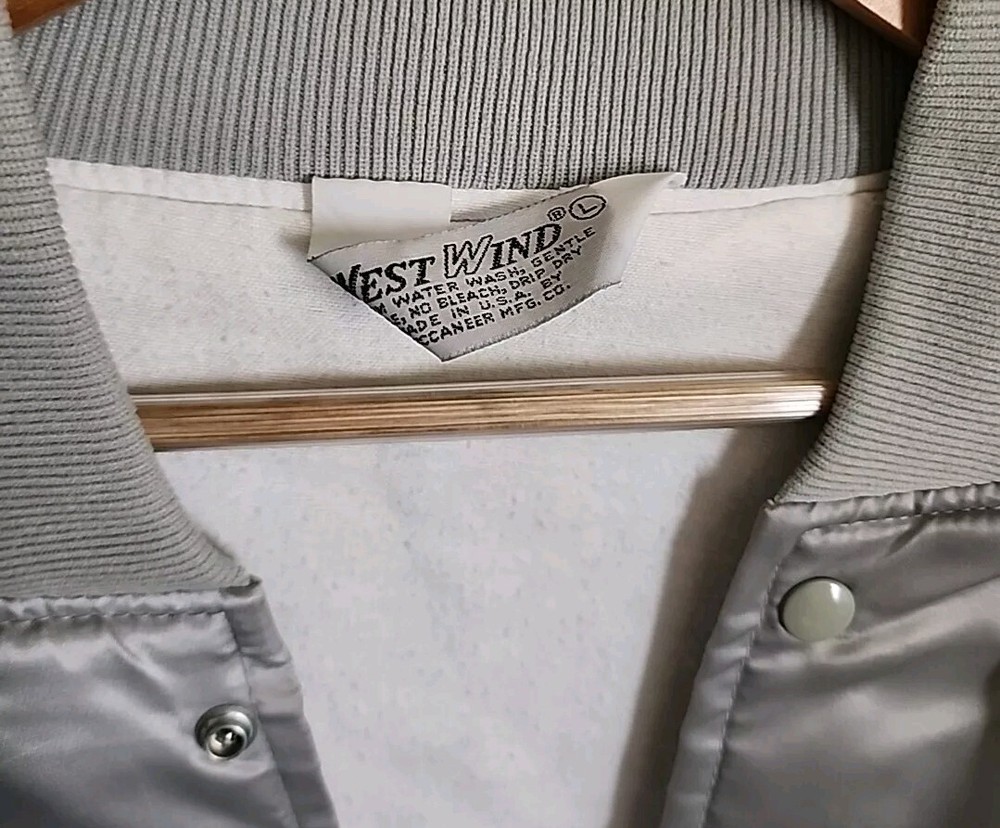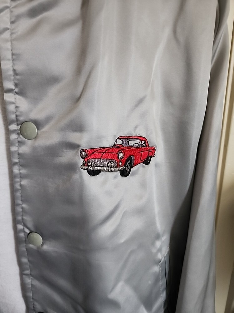 This vintage Wind brand jacket is a timeless classic that is perfect for any occasion. The jacket features a mid-length bomber style design with a button closure and embroidered accents. It is made from high-quality materials and is lightweight, making it suitable for all seasons. The jacket also has pockets for added convenience. The gray color of the jacket complements the classic red car embroidered design, making it a stylish addition to any outfit. Whether you're traveling, going to a party, or just out for a casual walk, this jacket is perfect for men who want to look their best. This jacket is a United States product and is available in size L.