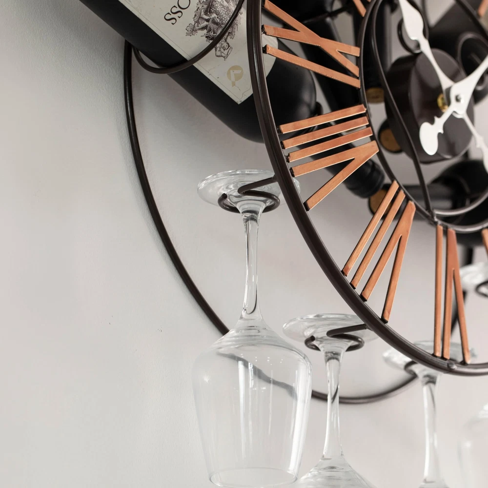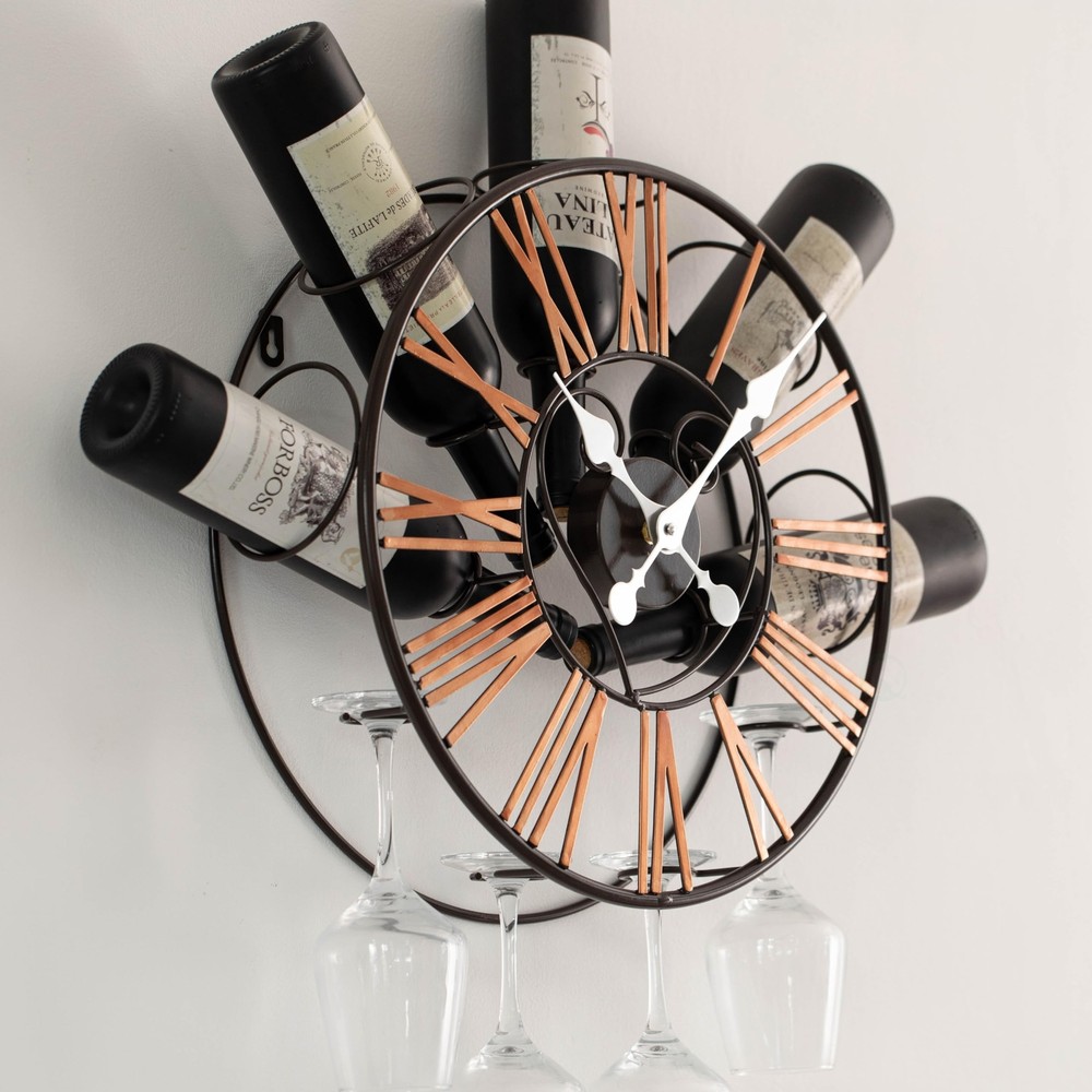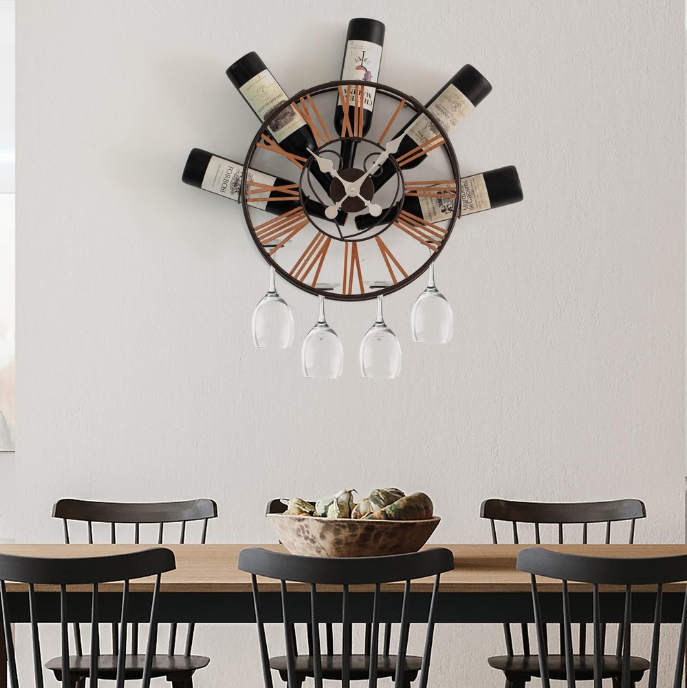 Vintiquewise Wall-Mounted Clock Design Wine Holder with Stemware Rack - Unique Shelf for Champagne, White & Red Wine Organizer with 4 Glass Holders, Wine Bottle Display for Home, Kitchen and Bar Decor Product Details Brand: Vintiquewise Color: Black Product Dimensions: 6"D x 16.75"W x 16.75"H Manufacturer: Quickway Imports UPC Product Dimensions: 6 x 16.75 x 16.75 inches Item Weight: 2.97 pounds Manufacturer: Quickway Imports Country of Origin: China Item model number: QI004686 Date First Available: November 18, 2024 Measuring 16.75 inches in width, 6 inches in depth, and 16.75 inches in height, this wall-mounted wine rack combines vintage charm with modern functionality. It features a built-in clock that requires 1 AA battery (not included) and offers storage for up to 5 wine bottles and 4 hanging wine glasses. The sleek metal frame adds a stunning focal point to your kitchen, dining room, or home bar. This stylish piece elevates any space with its unique blend of style and function. This wall clock wine rack features a striking design and sturdy metal construction. With its central clock and space for storing wine bottles and goblets, it provides both style and practicality. Perfect for hosting guests or cozy gatherings, this 2-in-1 display rack adds vintage-inspired charm while elegantly presenting your favorite wines. A unique decorative piece, this wine bottle holder is perfect not only for your home bar or kitchen but also for enhancing your living room, lounge, or entertainment space. Its striking round metal frame and central clock creates a captivating focal point, while the inverted lower crossbar securely holds wine glasses, keeping them dust-free. It offers a space-saving solution and serves as an ideal accent, adding style to your home decor. Designed for wine enthusiasts, this wall wine rack requires no assembly and offers versatile wine storage and home bar accessories. Its combination of modern luxury and vintage charm adds character to your home, transforming unused space into a stunning art wall. Equipped with a wine glass holder, it enhances the sophisticated ambiance of your space while remaining organized, functional, and visually appealing. This wall rack and glass shelf make an excellent gift for wine lovers, those starting their wine collection, and your family and friends for birthdays, Father's Day, or Christmas. Not only does it add a touch of elegance to any space, but once installed, it transforms the area into a strikingly beautiful bar aesthetic, making it a delightful addition to any home and a thoughtful present that enhances its decor. Elevate your home decor with our stunning wall clock wine rack, a perfect blend of style and functionality. This unique piece is a practical storage solution that enhances your wall decor. Designed for wine enthusiasts, this wall-mounted rack elegantly holds your favorite wine bottles while showcasing your glassware, transforming any empty wall into a captivating mini bar. Crafted with a modern yet vintage-inspired aesthetic, this unique decorative piece adds a timeless charm to your space. It not only keeps your wine and glassware organized but also enhances the ambiance of your home with its elegant presence. The wine glass holder conveniently stores your goblets, ensuring they are always within reach and dust-free. Installation is a breeze, as this floating shelf comes with all the necessary screws and allowing you to mount it easily on any wall. Once in place, it becomes a stunning focal point, turning your kitchen wall decor into a sophisticated display that impresses guests and adds character to your home. Perfect for housewarmings, birthdays, or as a thoughtful gift for wine lovers, this wall clock wine rack is more than just a storage solution; it’s a statement piece that reflects your style. Whether you’re creating a cozy nook for entertaining or simply looking to organize your wine collection, this elegant rack elevates your decor while offering practical wine storage and easy accessibility. Transform your home into a stylish haven for wine enjoyment with this exquisite wall-mounted wine rack.