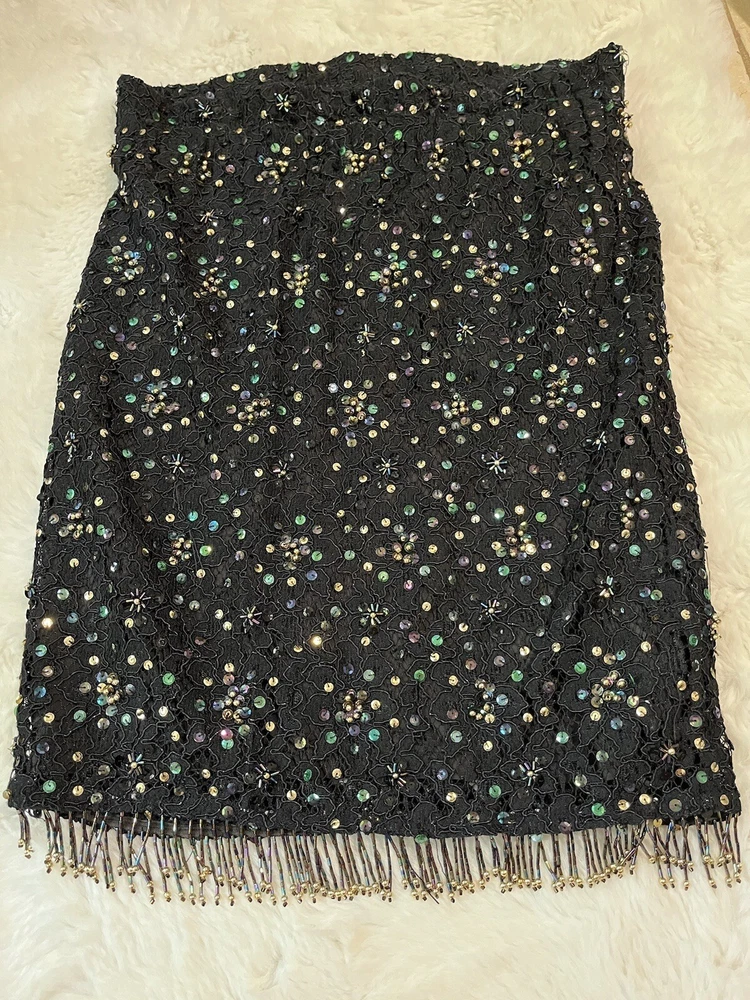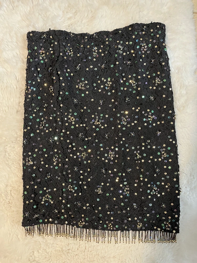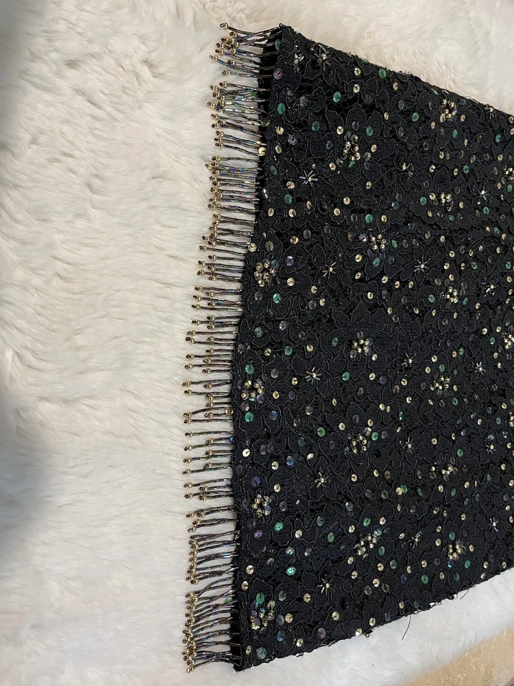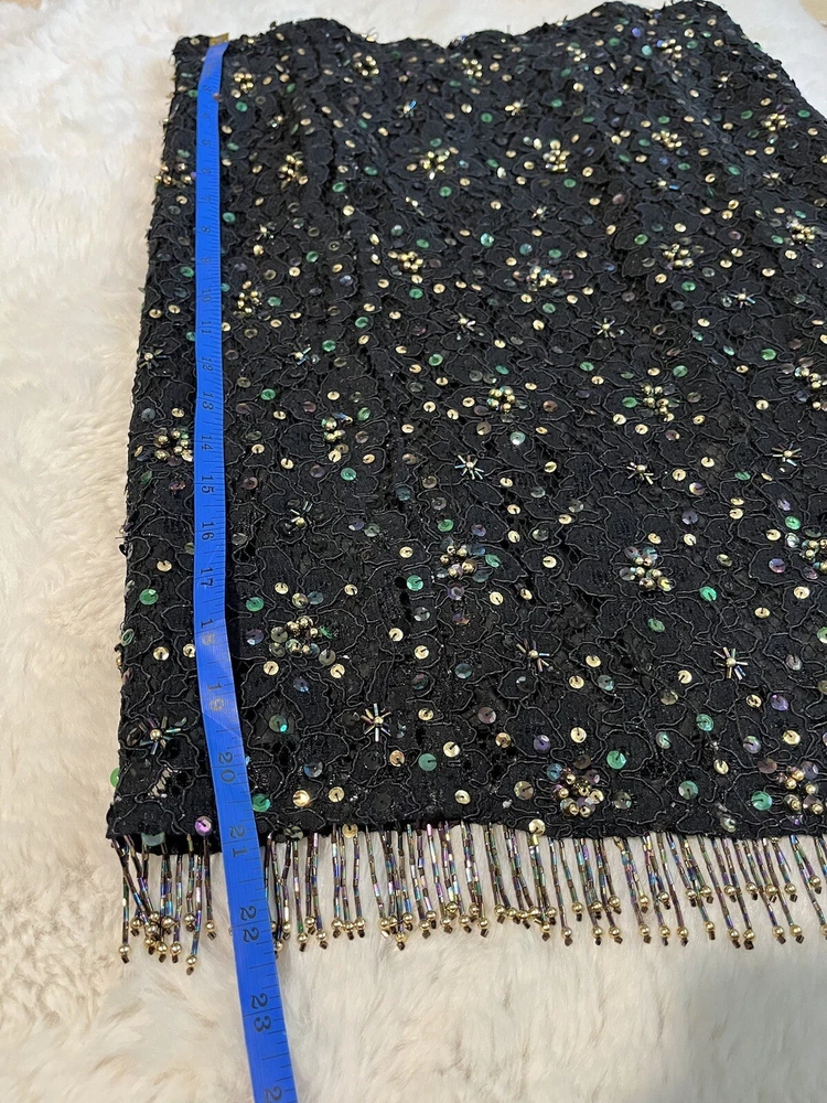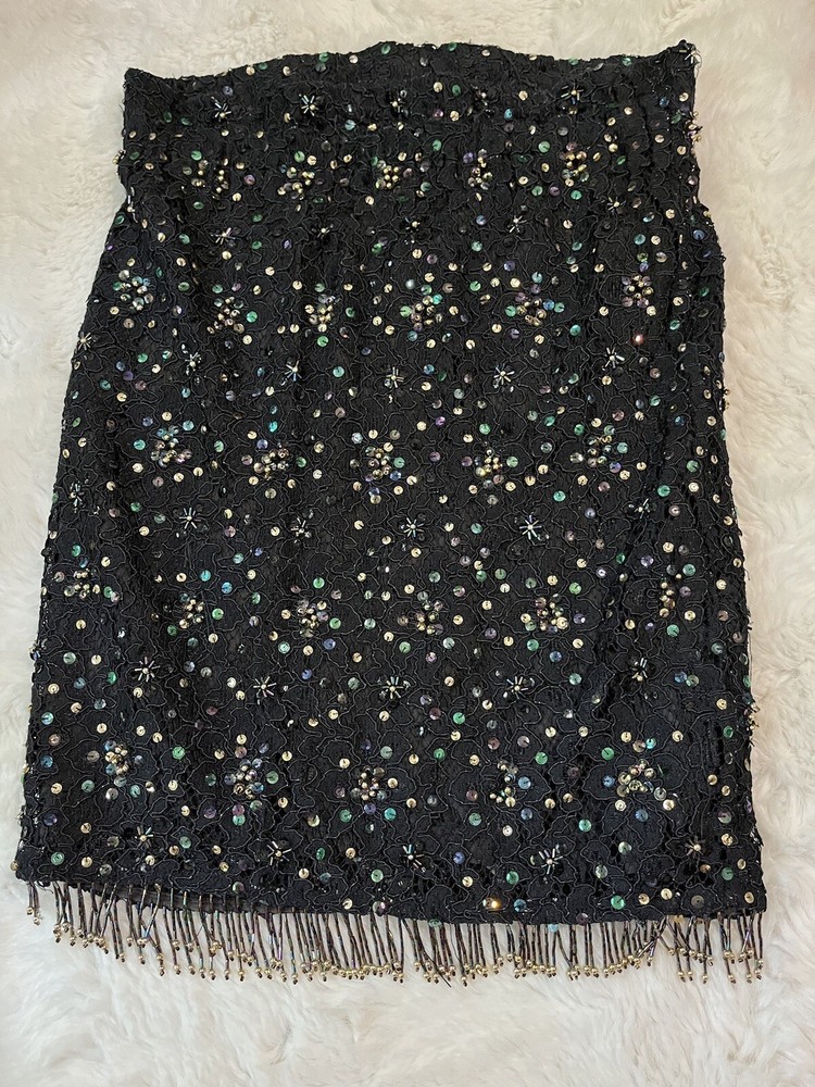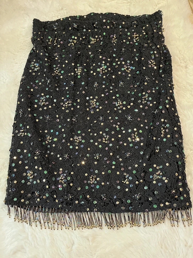 This is a vintage Vivienne Tam skirt in size 2, made in Hong Kong. The skirt is knee-length and features a solid black color with beaded fringe and sequined accents. The fabric is made of nylon and rayon. Lace floral embroidery, with a pull-on closure. The skirt is lined and has stretch. The style is straight and hits right above the knees. I’m great vintage condition, a couple tassels are missing as photographed but not noticeable when wearing. Can fit multiple sizes seems larger than a typical 2 please see all photos for measurements. I slipped on and am a size 4. depending on where the skirt is worn on the hips smaller or larger sizes can wear as well.