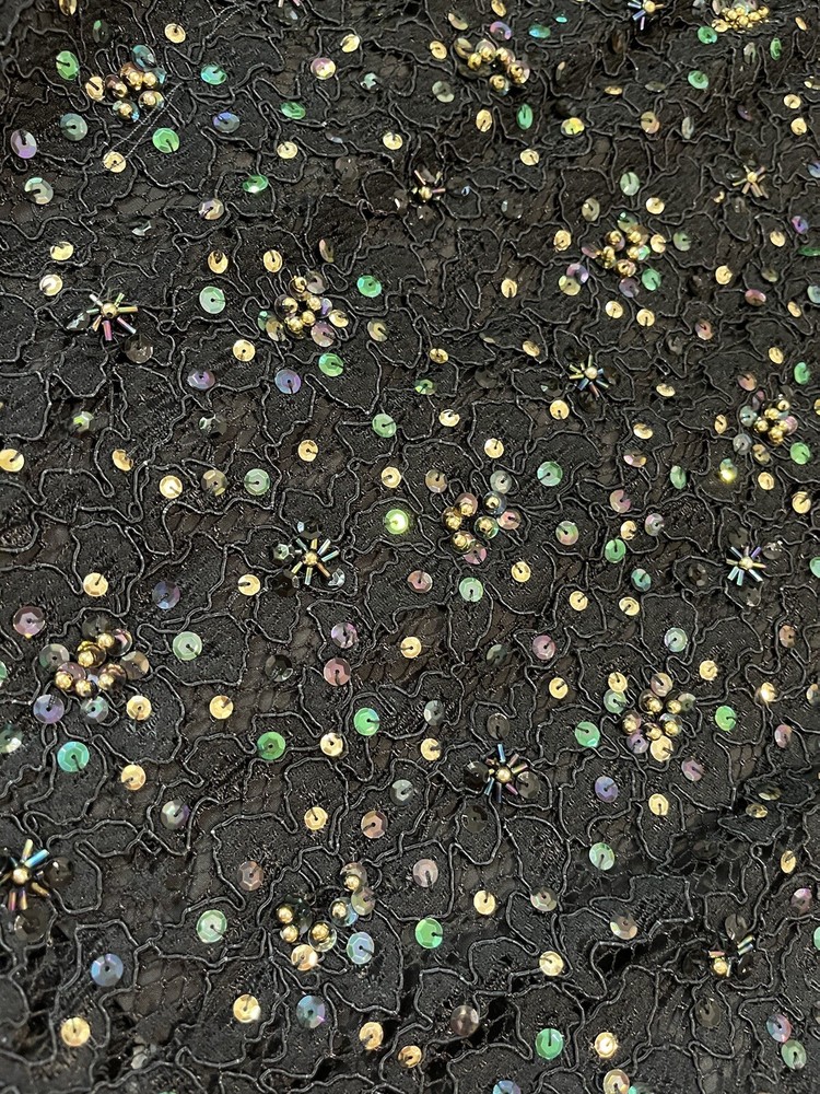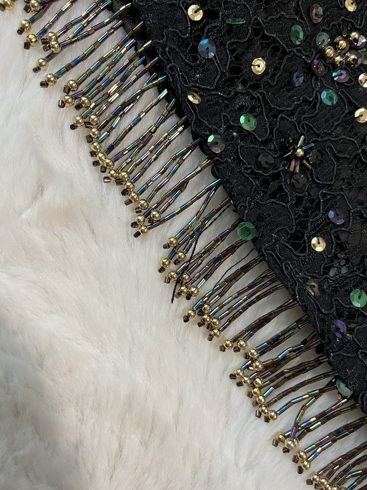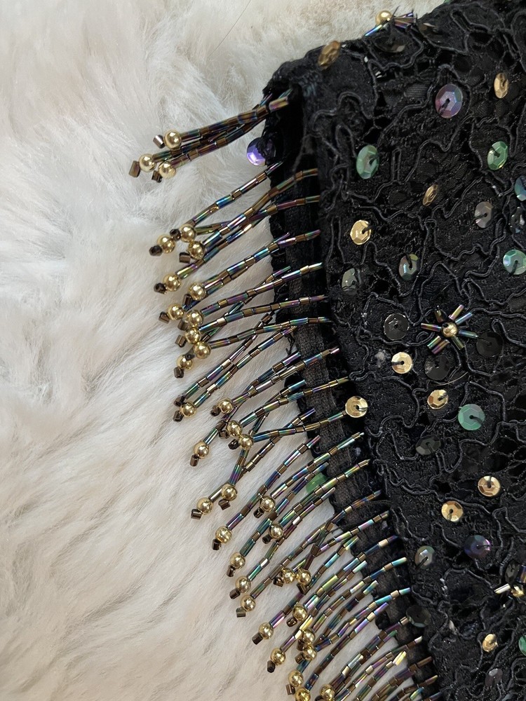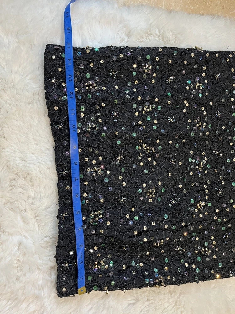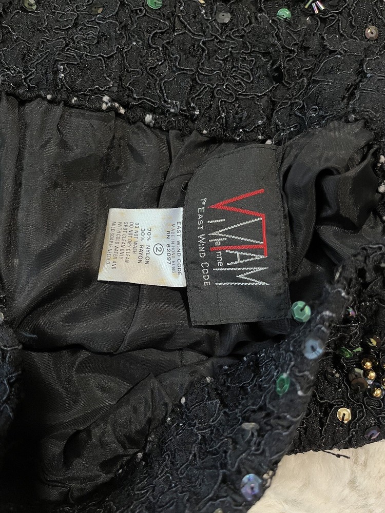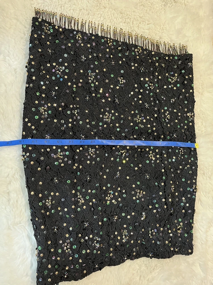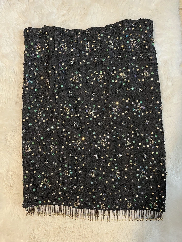This is a vintage Vivienne Tam skirt in size 2, made in Hong Kong. The skirt is knee-length and features a solid black color with beaded fringe and sequined accents. The fabric is made of nylon and rayon. Lace floral embroidery, with a pull-on closure. The skirt is lined and has stretch. The style is straight and hits right above the knees. I’m great vintage condition, a couple tassels are missing as photographed but not noticeable when wearing. Can fit multiple sizes seems larger than a typical 2 please see all photos for measurements. I slipped on and am a size 4. depending on where the skirt is worn on the hips smaller or larger sizes can wear as well.