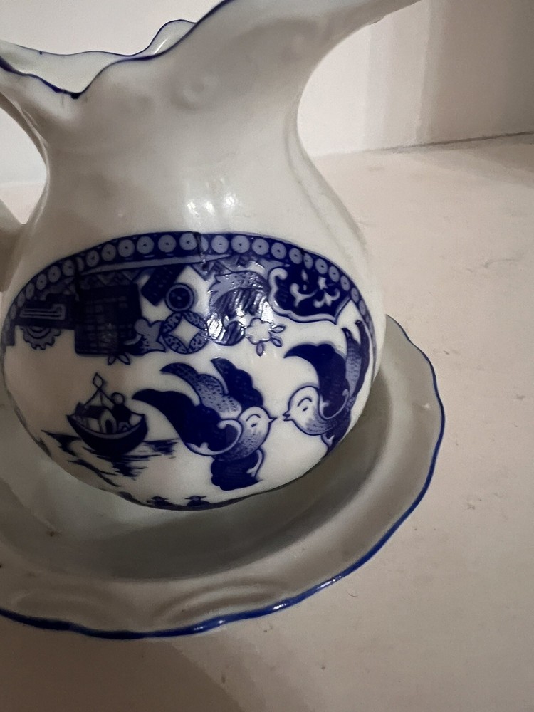 This vintage Choice Imports small Pottery pitcher and bowl set features a beautiful Blue Willow design on a white background with blue accents. The set is made of ceramic and porcelain and was produced in Japan. It's perfect for collectors of decorative items, especially those who appreciate Flow Blue and Blue Willow styles. The age of the set is unknown, but it is a vintage reproduction. The set is in good condition and would make a great addition to any collection.4.5” Dx3.5”T, 8oz, Distributed in Camdenton,NC.