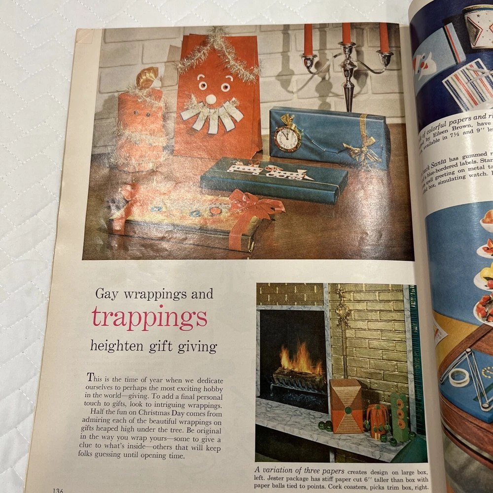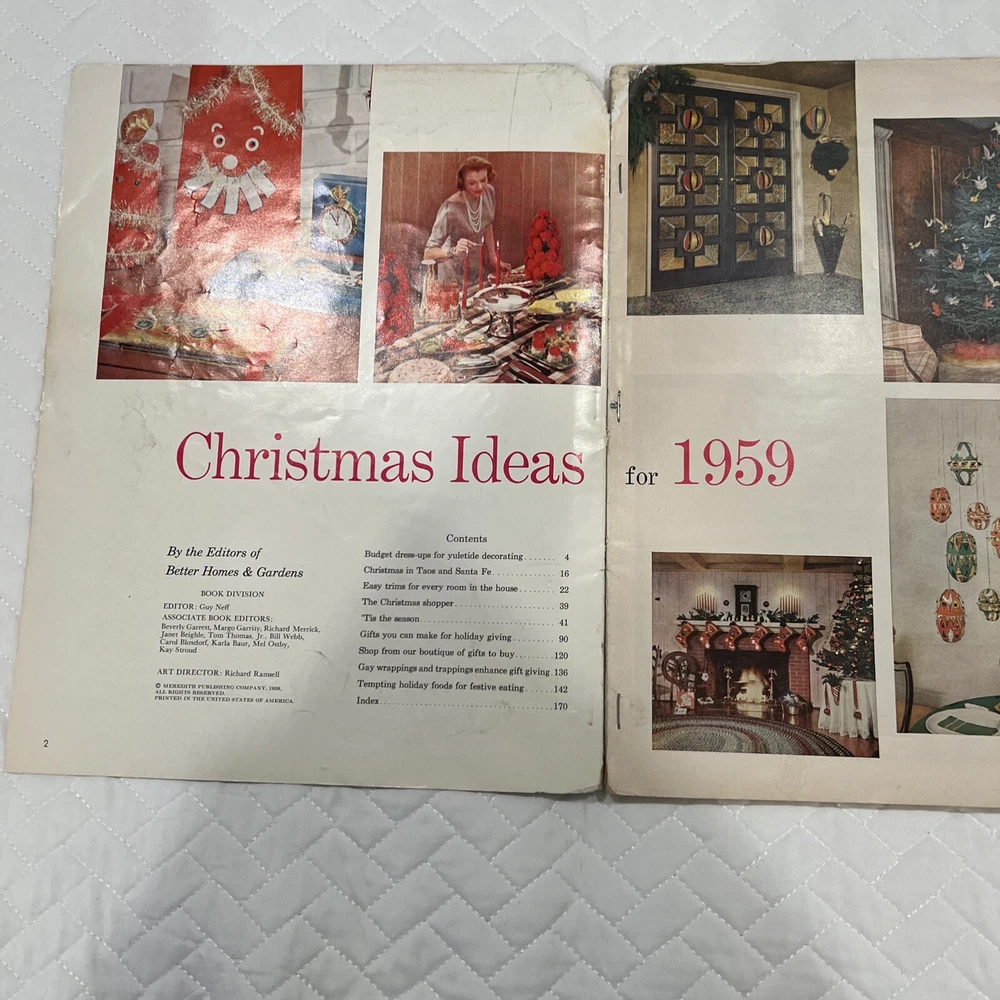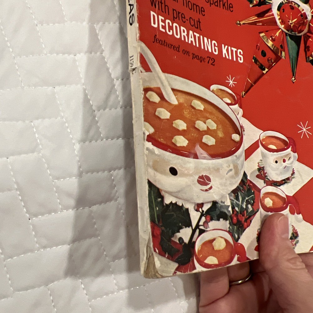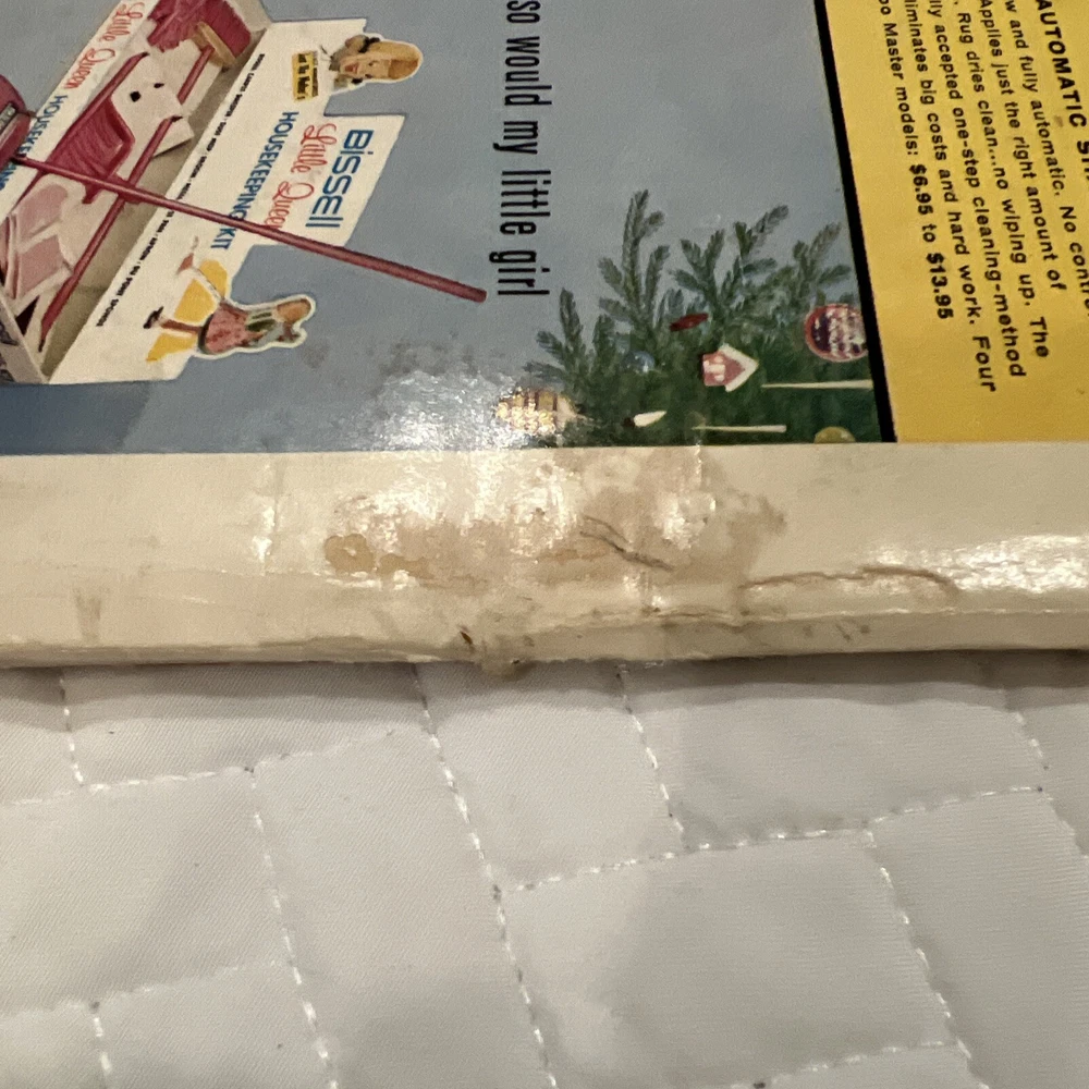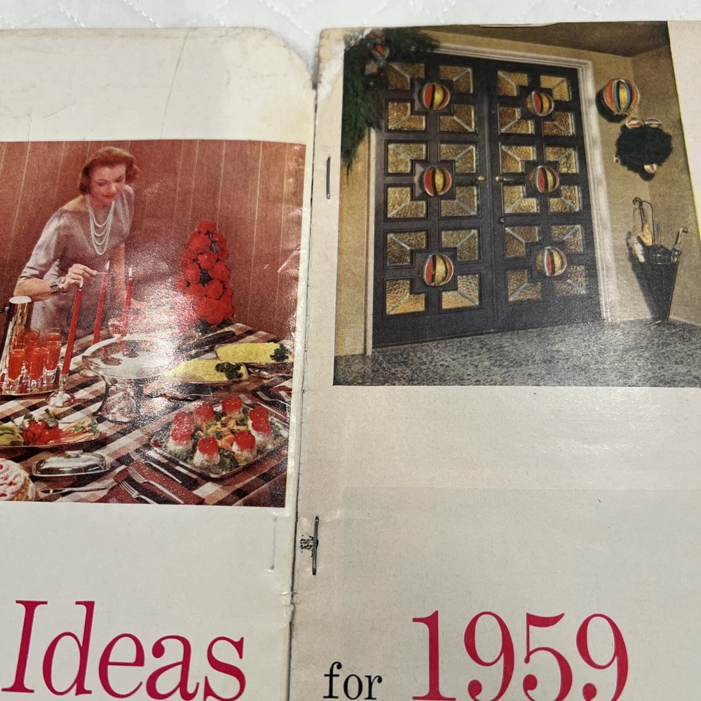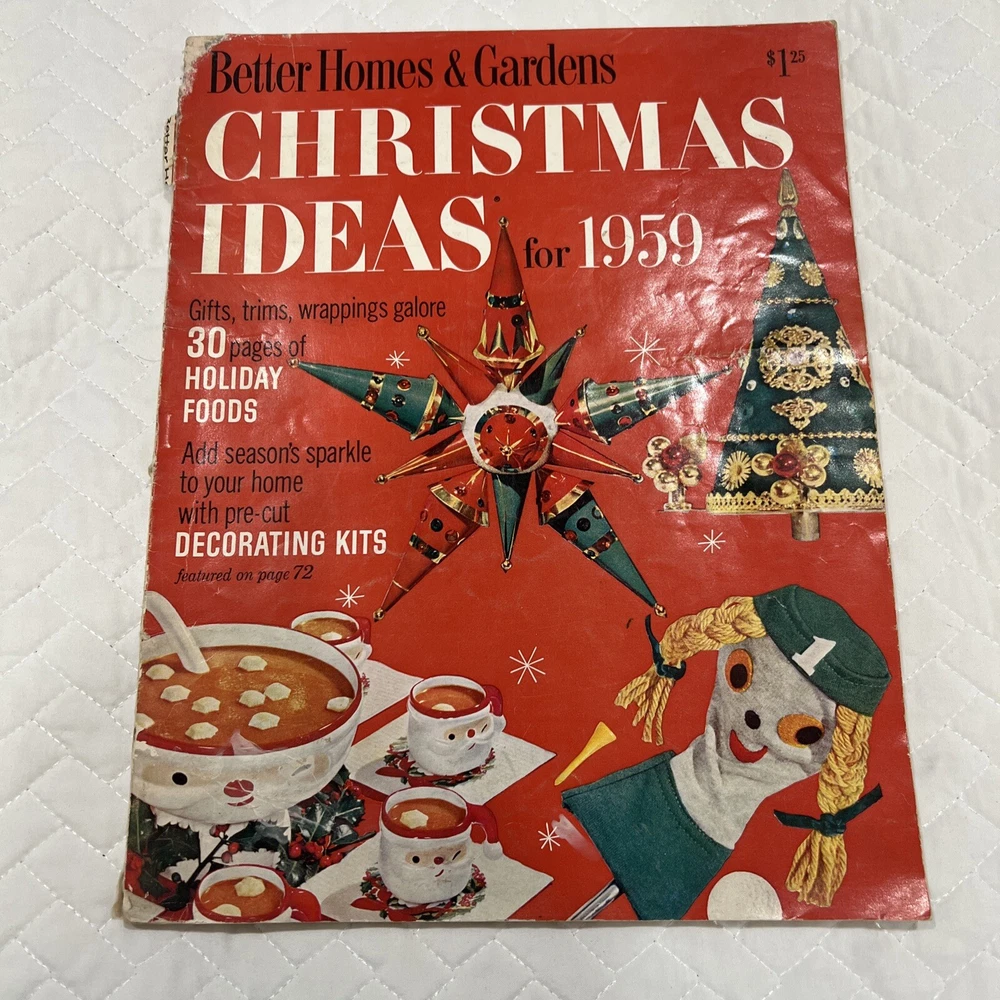 1959 Better Homes & Gardens Christmas Ideas Edition Cover is still attached but is torn on binding. Shows signs of use and yellowing of pages. However, overall, this magazine is so fun and in great vintage condition! You’ll love the crafts, recipes, and vintage advertising.