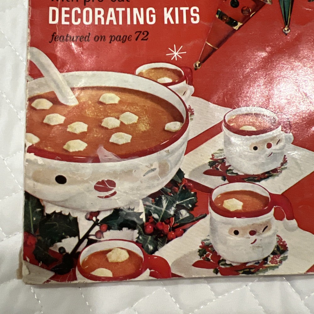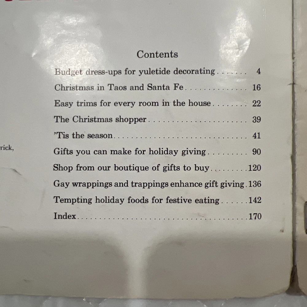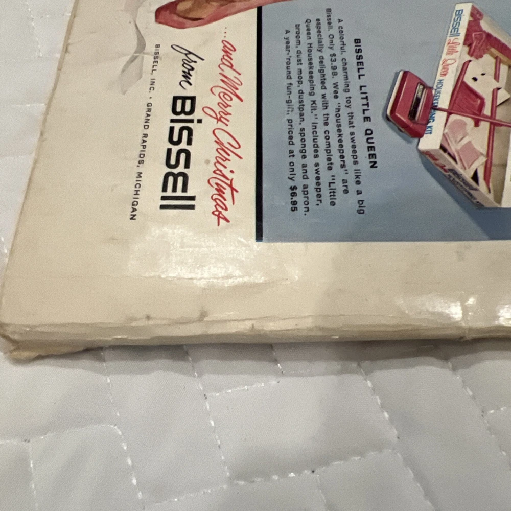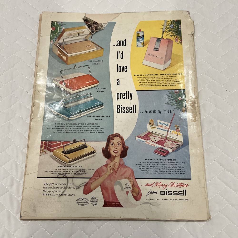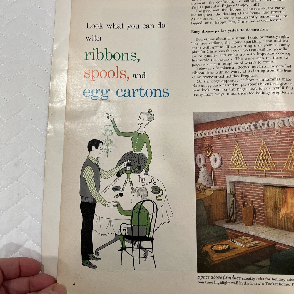 1959 Better Homes & Gardens Christmas Ideas Edition Cover is still attached but is torn on binding. Shows signs of use and yellowing of pages. However, overall, this magazine is so fun and in great vintage condition! You’ll love the crafts, recipes, and vintage advertising.