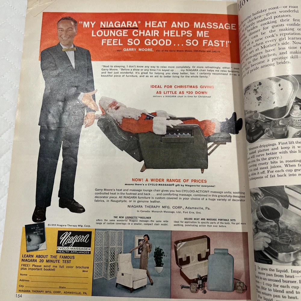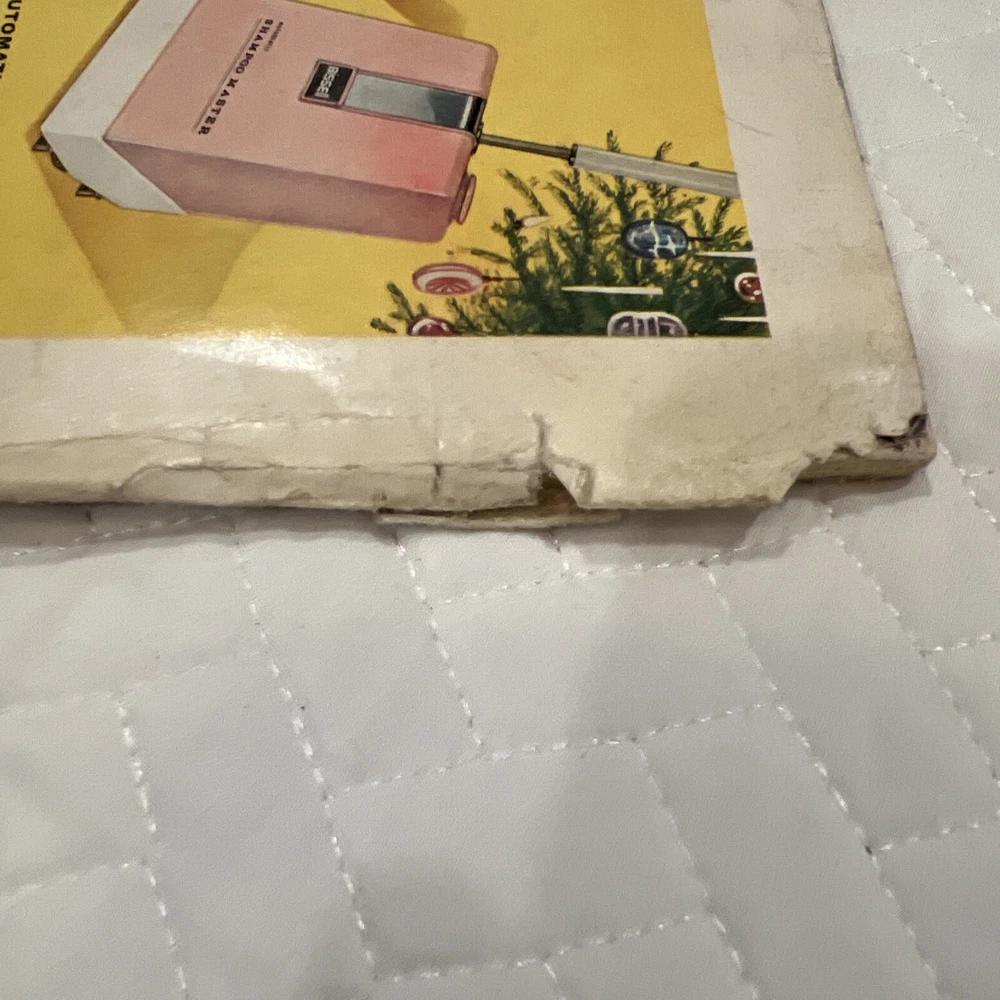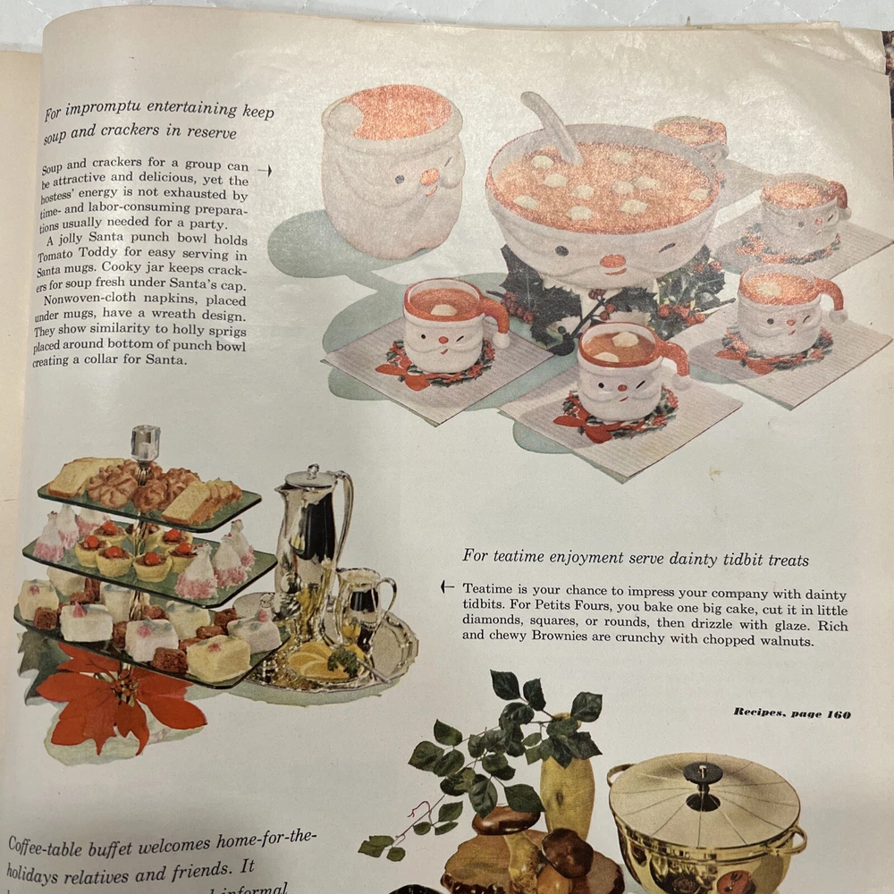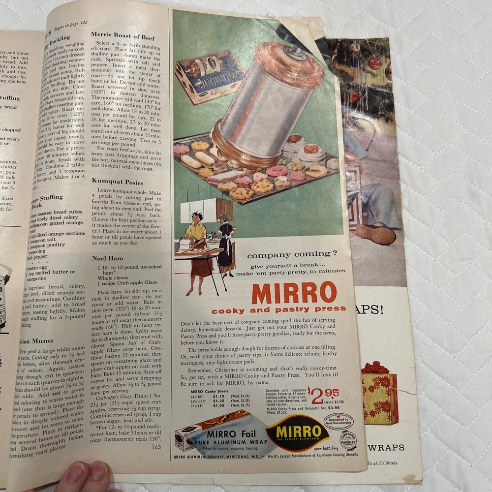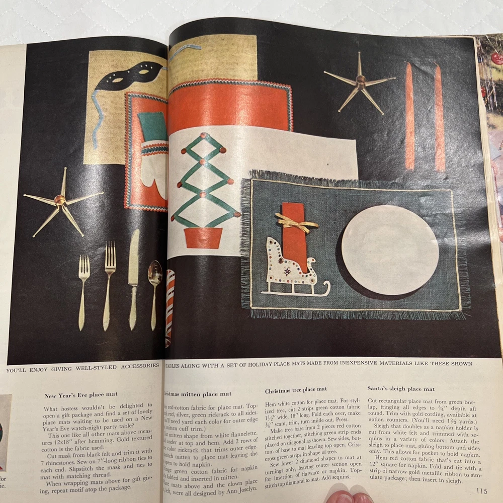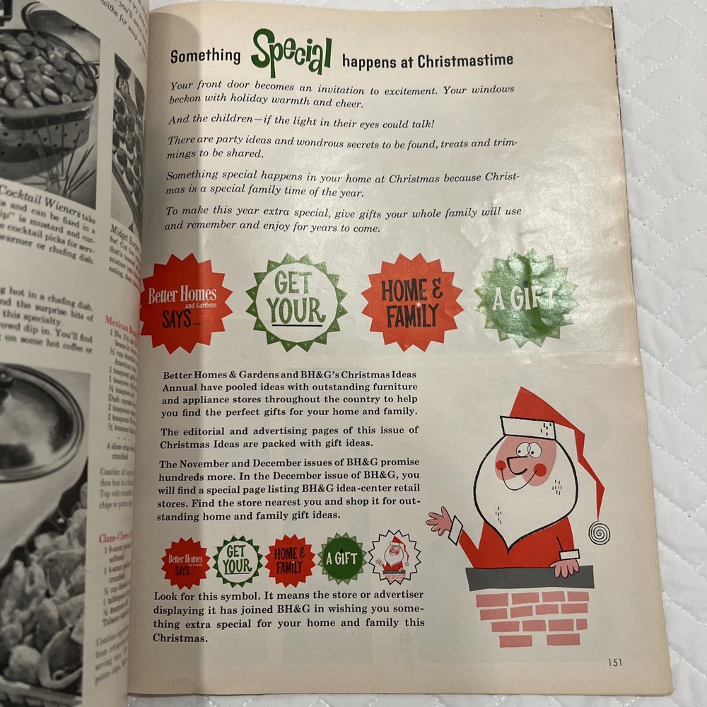 1959 Better Homes & Gardens Christmas Ideas Edition Cover is still attached but is torn on binding. Shows signs of use and yellowing of pages. However, overall, this magazine is so fun and in great vintage condition! You’ll love the crafts, recipes, and vintage advertising.