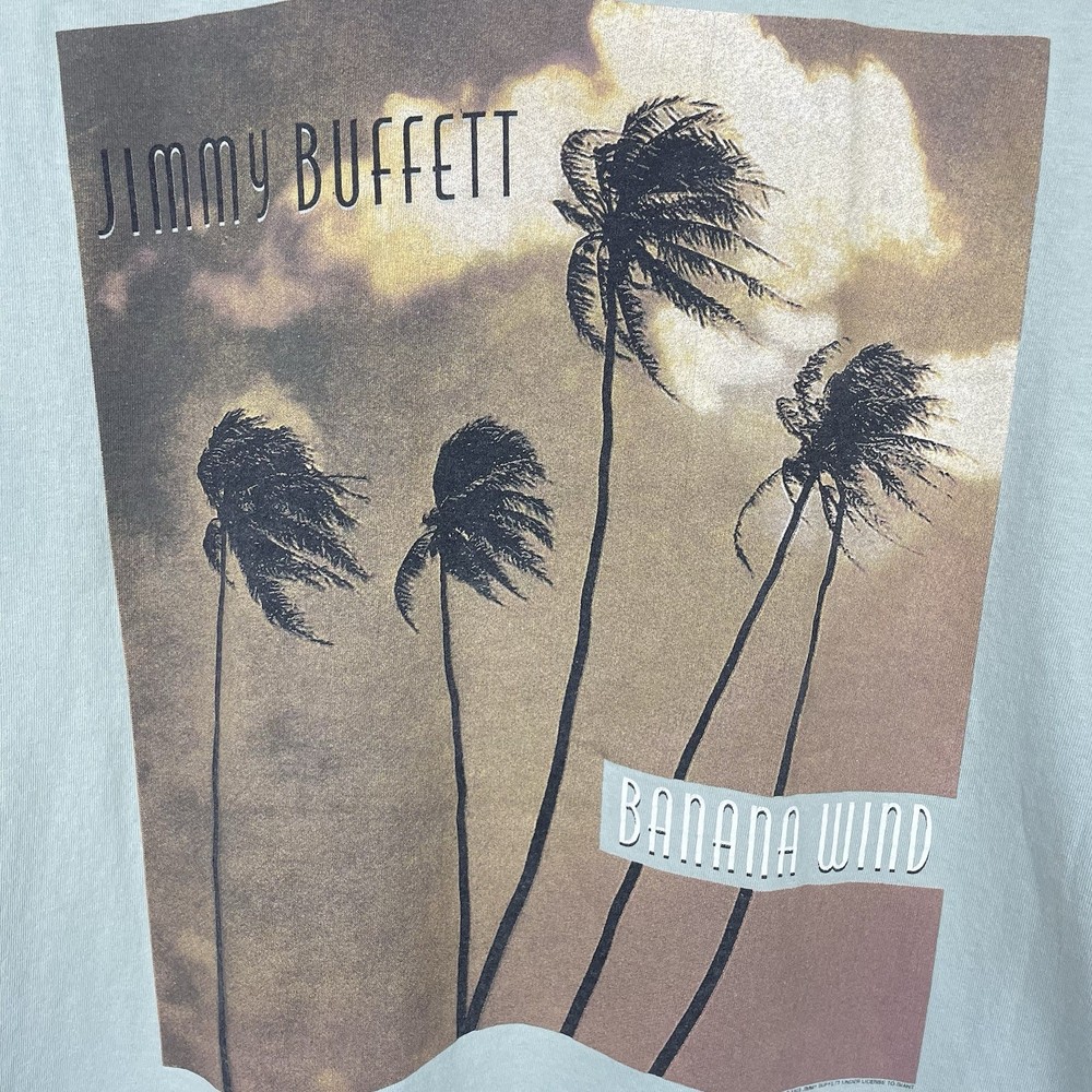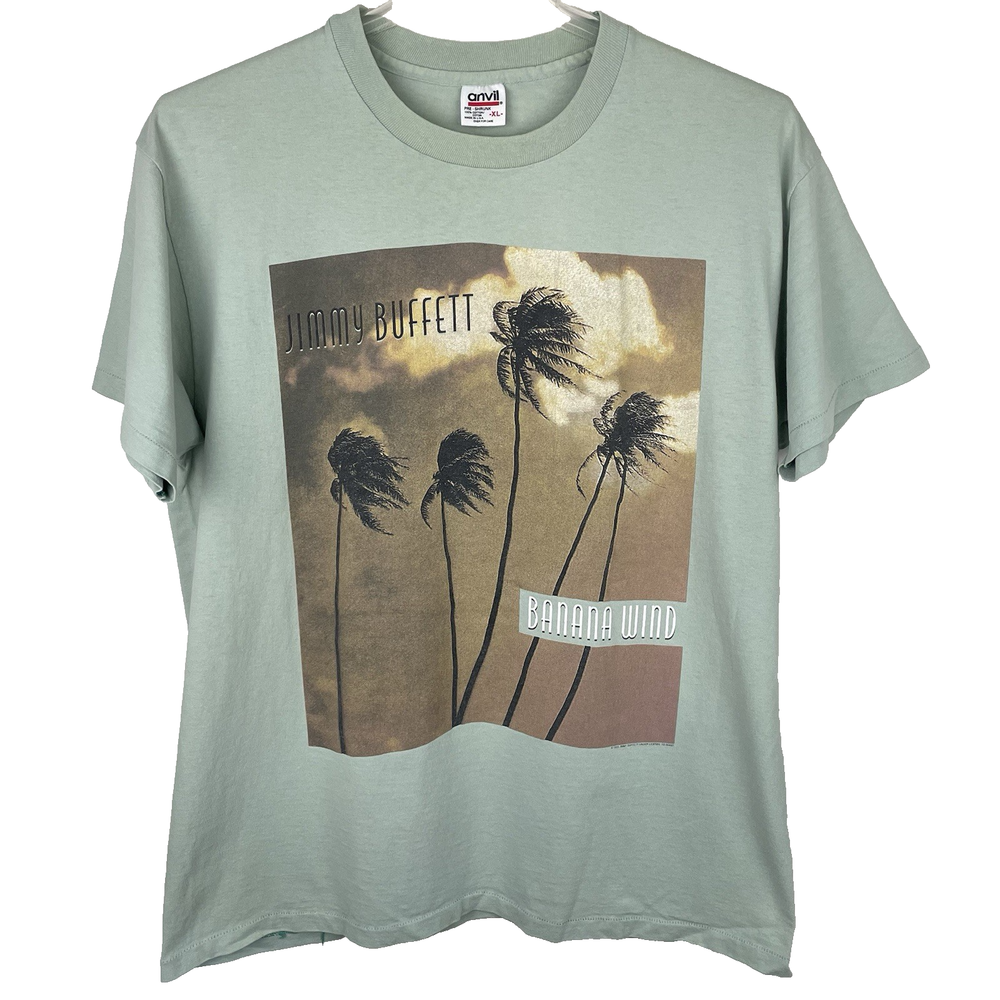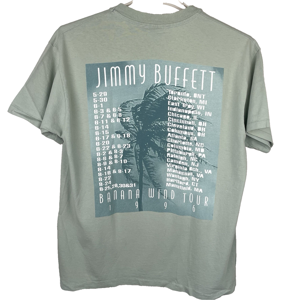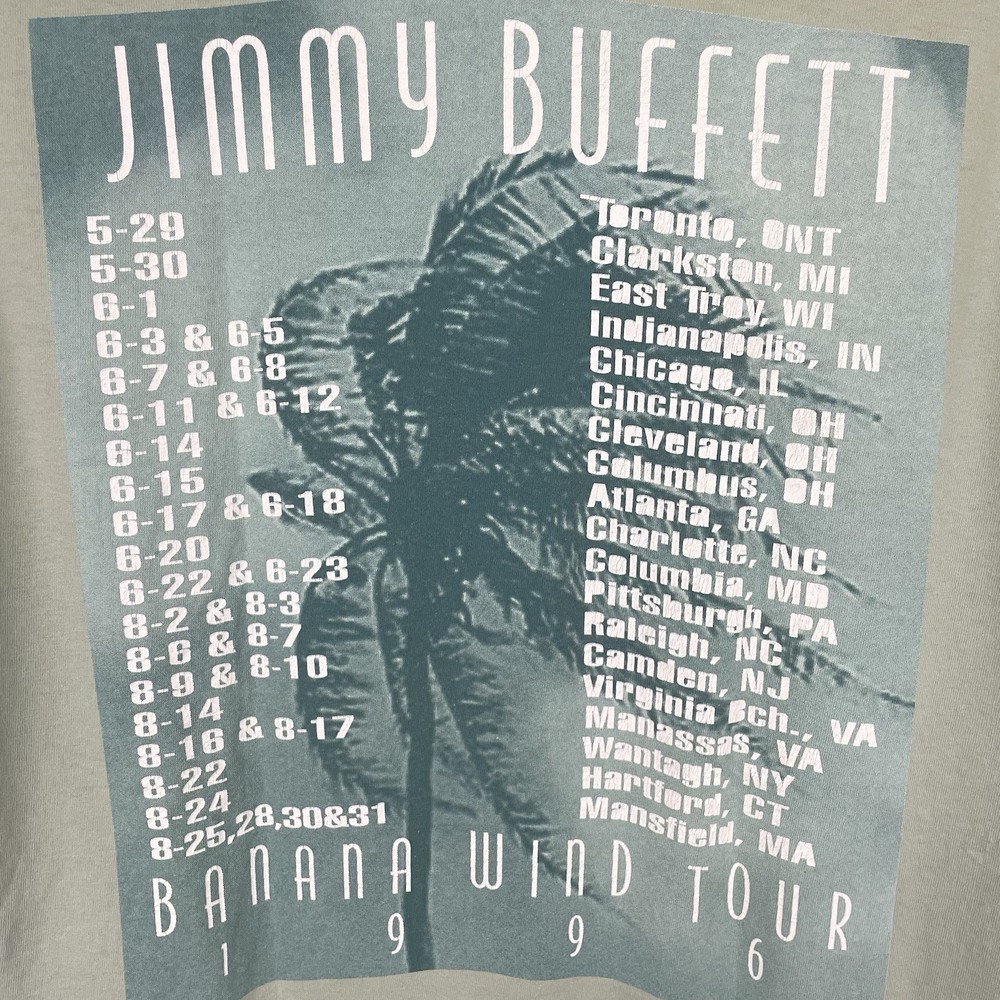 Embrace the laid-back vibes with this vintage 1996 Jimmy Buffett Banana Wind Tour T-Shirt. Adorned with a tropical graphic print, it's a classic piece for any parrot head fan of the tropical rock legend. Crafted from soft, breathable cotton, this green crew neck T-shirt is a testament to the carefree spirit of the '90s. Size XL and made in the United States, this knit tee offers a comfortable regular fit with short sleeves, perfect for any season. Whether you're out for a casual day or attending a concert, this single-stitch T-shirt embodies the essence of Jimmy Buffett's Trop-Rock era, complete with easy-care convenience for the modern man. Very Good pre-owned condition. No holes, tears or stains. Some overall fading. Sleeve Length (Top of Arm at Shoulder Seam to Cuff) Short Width (Arm Pit to Arm Pit) 22 1/2 inches Length (Top of Collar Seam to Hem) 28 inches