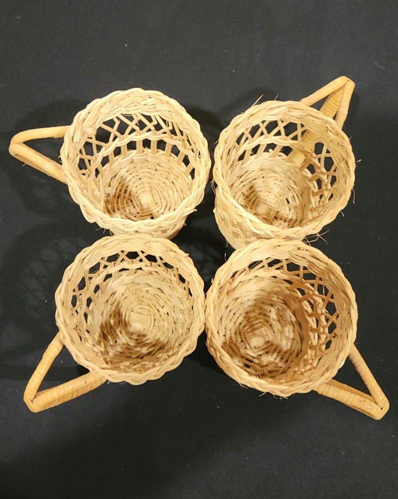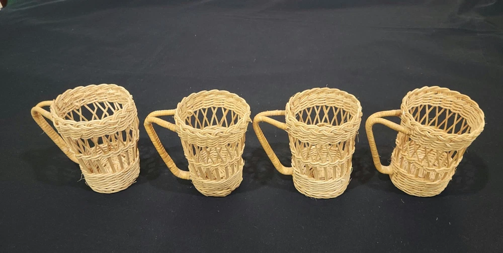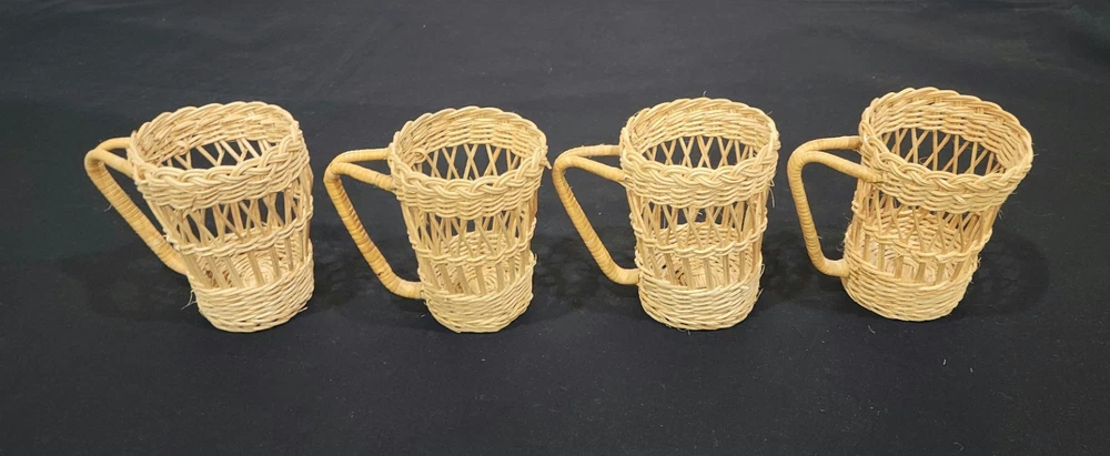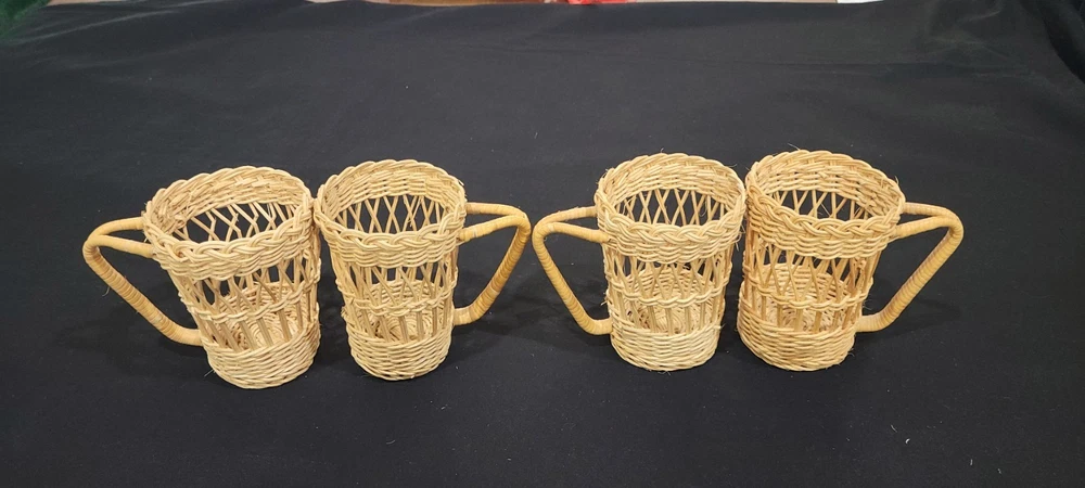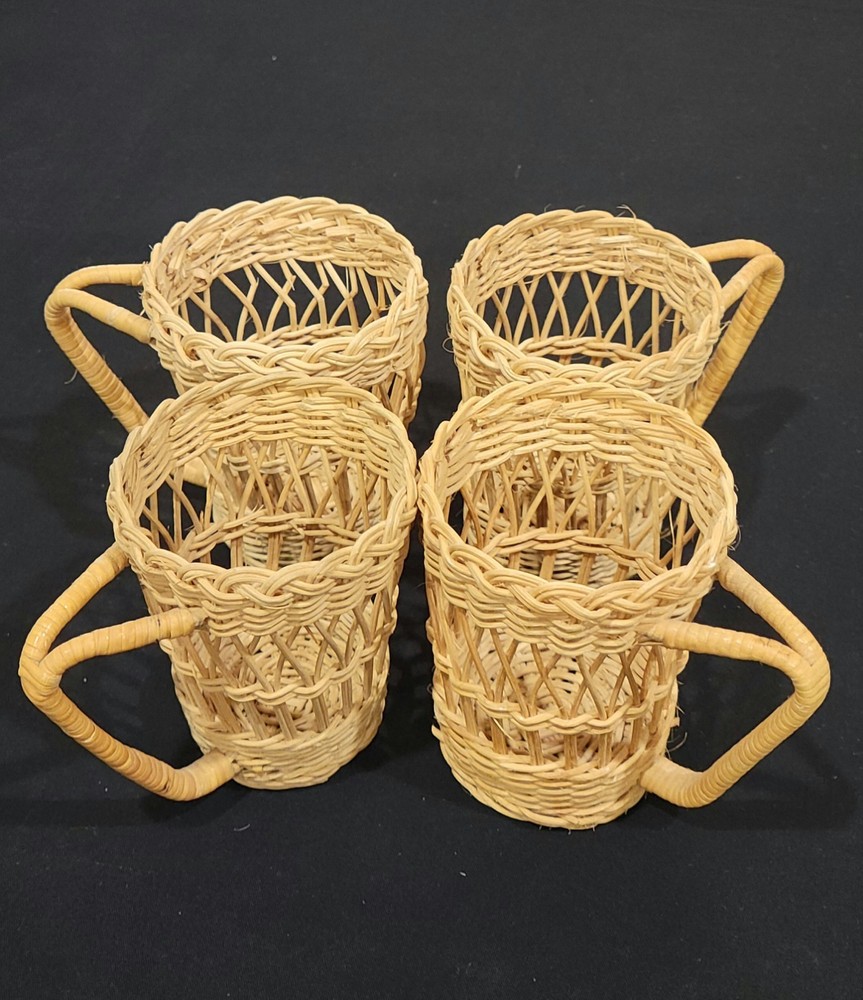 This set of four coffee cup holders from Coffee Imports Made in Hong Kong is made of woven wicker and ratan material. Each holder has a diameter of 3 inches and a height of 4.75 inches. They are perfect for holding your favorite coffee cup and adding a vintage touch to your kitchen or dining room decor. The beige color and medium size make them a great addition to any home. These cup holders are a unique and collectible item, perfect for collectors and those who love to add a touch of charm to their home. These preowned items are in great condition. Please view pics for details. Feel free to ask if you have any questions.