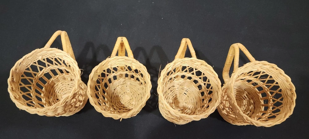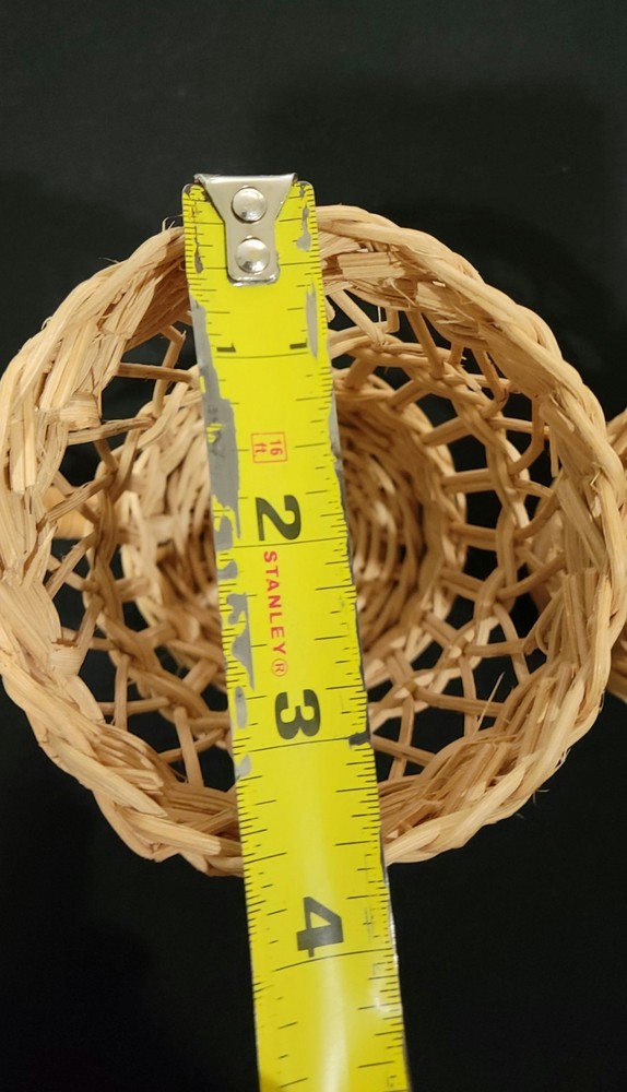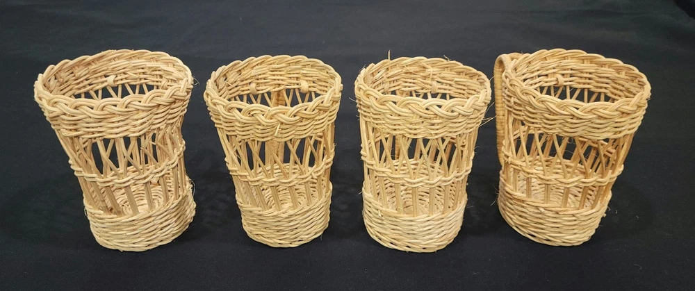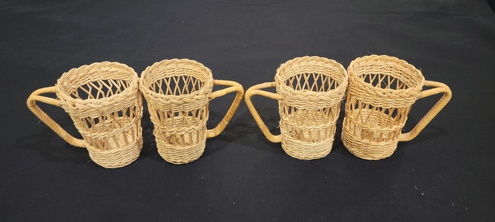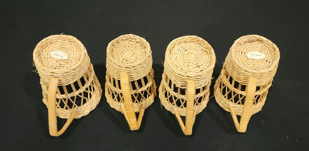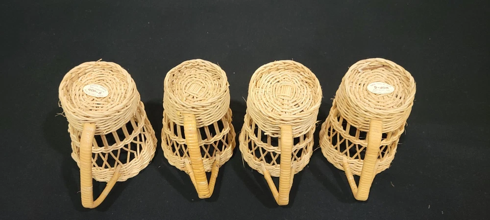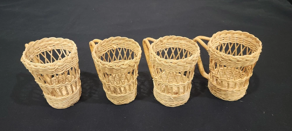 This set of four coffee cup holders from Coffee Imports Made in Hong Kong is made of woven wicker and ratan material. Each holder has a diameter of 3 inches and a height of 4.75 inches. They are perfect for holding your favorite coffee cup and adding a vintage touch to your kitchen or dining room decor. The beige color and medium size make them a great addition to any home. These cup holders are a unique and collectible item, perfect for collectors and those who love to add a touch of charm to their home. These preowned items are in great condition. Please view pics for details. Feel free to ask if you have any questions.