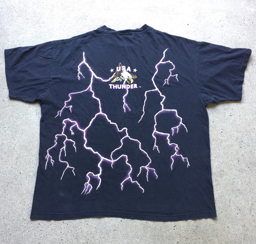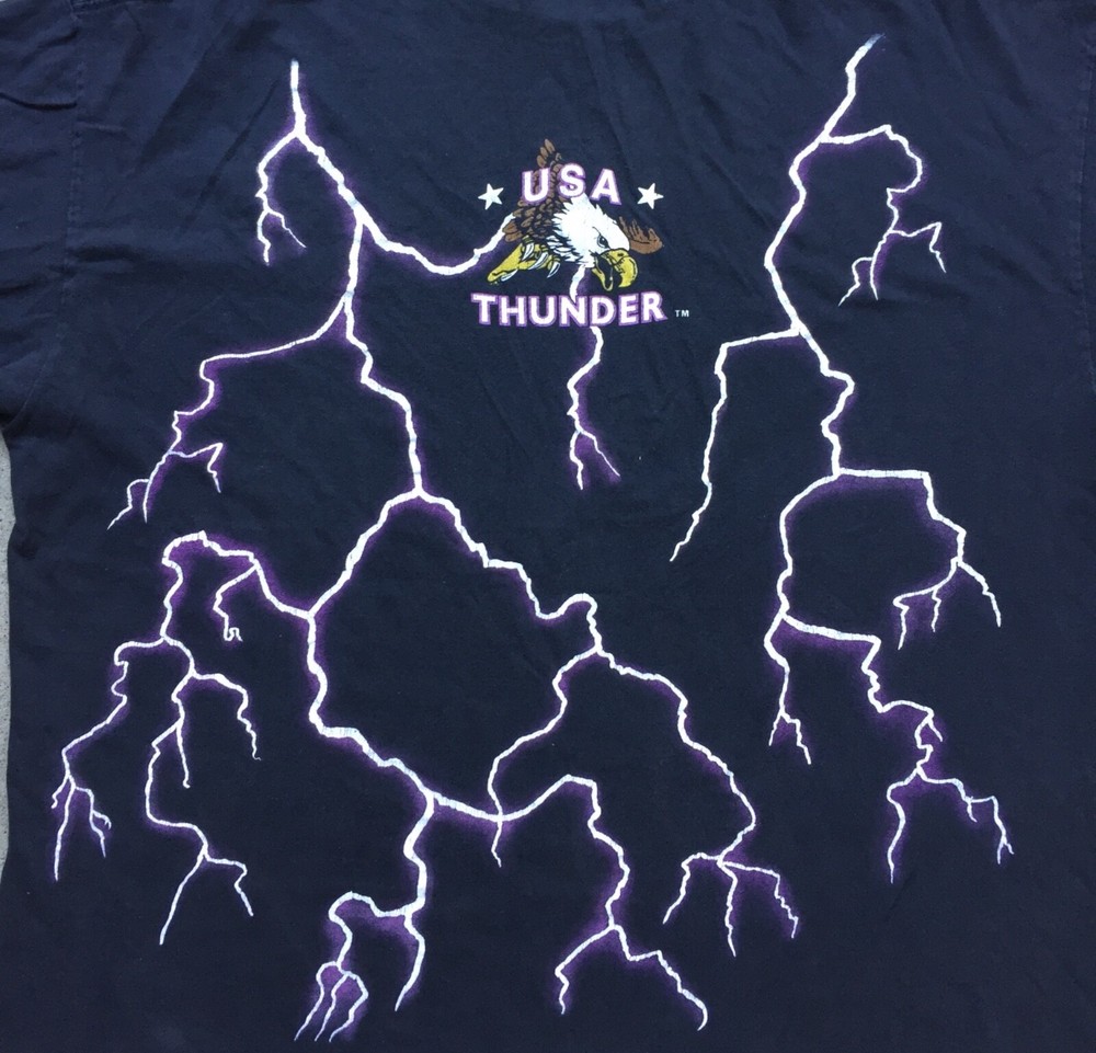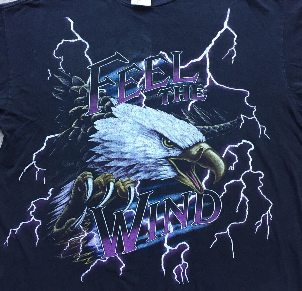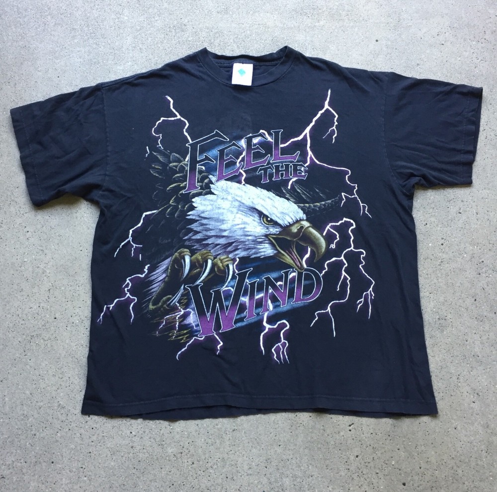 Vtg 90s All Over Print Feel The Wind T Shirt American Thunder Biker Lightning XL. Tour Champ 100% Cotton Made In El Salvador Tee. Double Stitched. Cracking and wear to print/graphic. Shirt is faded. Measures 25” from pit to pit (50” chest size) & 27” from shoulder to hem (bottom) of shirt. Fits like a bigger fitting size XL in modern sizing. Boxy fit.