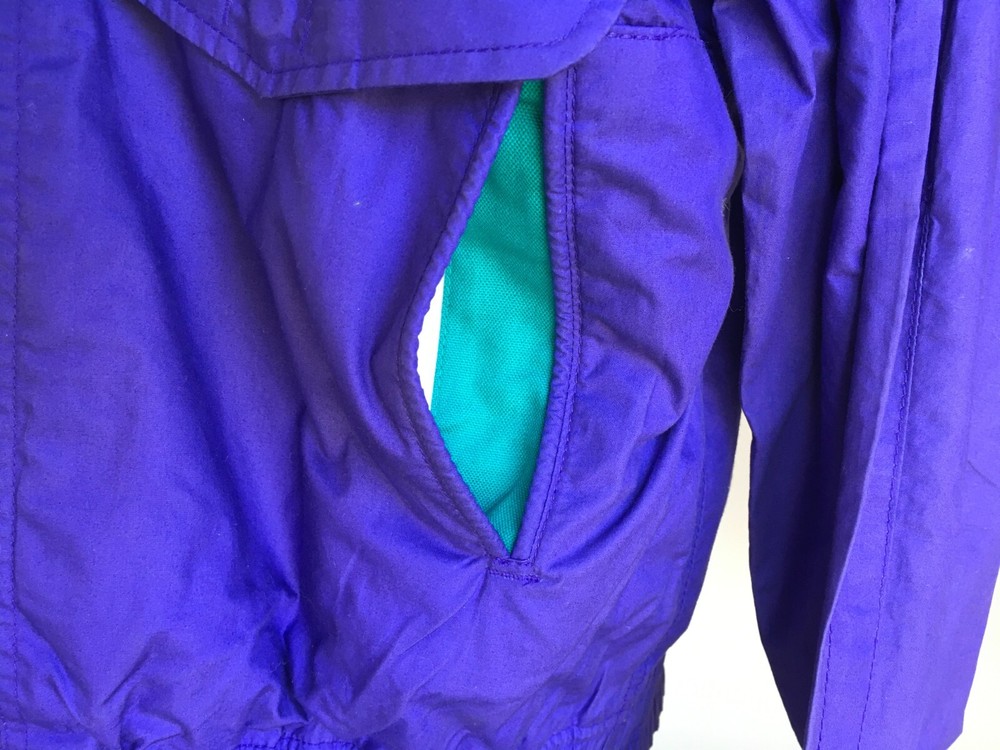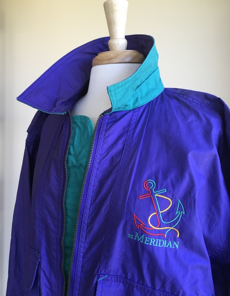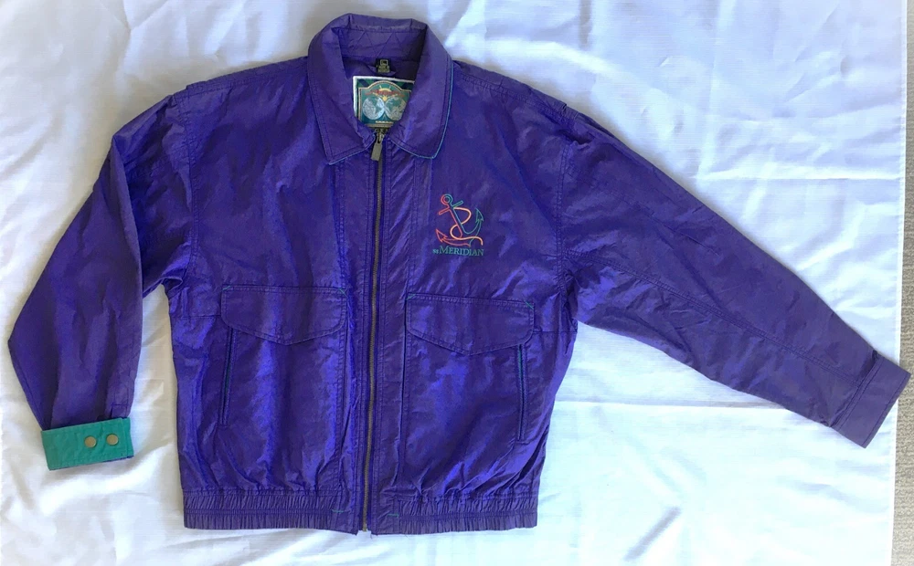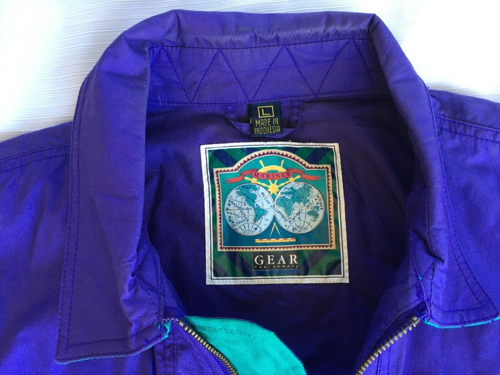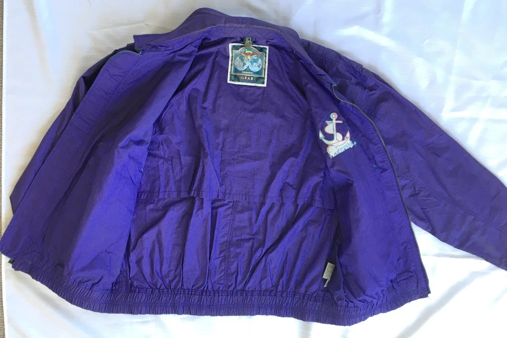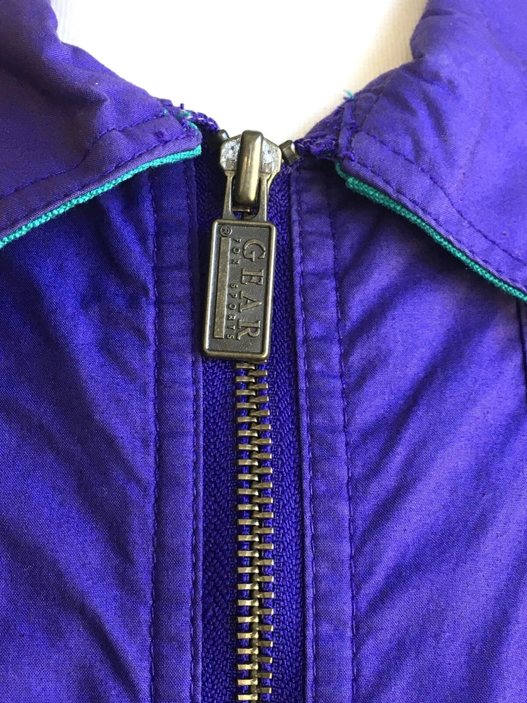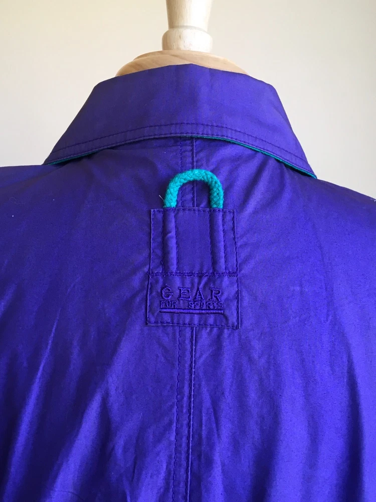 Elevate your style with this vintage GEAR FOR SPORTS men's jacket. Crafted from softshell cotton material, this bomber jacket is perfect for travel, workwear, and casual occasions. The water and wind-resistant features make it ideal for all seasons, while the elastic waist and full zip provide both comfort and functionality. The jacket is lined with cotton and comes in a striking purple color with green trim. The embroidered and logo accents add a touch of personality, making it perfect for those who love the outdoors and classic style. The chest size is 48 inches, and it is a regular fit in size L. This jacket is a must-have for any fashion-conscious man who loves the nautical, dad, outdoor, city, classic, 90s, retro, colorful, and logo-themed apparel. See below for measurements and additional information: Brand: GEAR FOR SPORTS Size: Large Fabric : Shell: Cotton (100%); Lining: Cotton (100%); Trim: Cotton (100%) Chest: 24" flat; armpit to armpit (or 48" total) Waist: 23" flat (or 46" total) Bottom: 21" flat (or 42" total) Shoulder Width: 23" (seam to seam) Sleeve Length: 25" (from shoulder seam); 36 3/4" from center back Overall Length: 27" (from center back) Condition: Excellent pre-owned/vintage condition; no rips, tears or stains; please see photos as they are part of the description; smoke-free and pet-free home. Comments: ~ Full zip front closure ~ 2 snaps at sleeve cuff ~ Purple with contrasting green trim ~ Nautical theme with ssMeridian ship logo ~ Double pockets on both sides with snap closure for extra security ~ Dry clean only. Please contact me with any questions or if you need additional information or photos. THANKS FOR LOOKING!