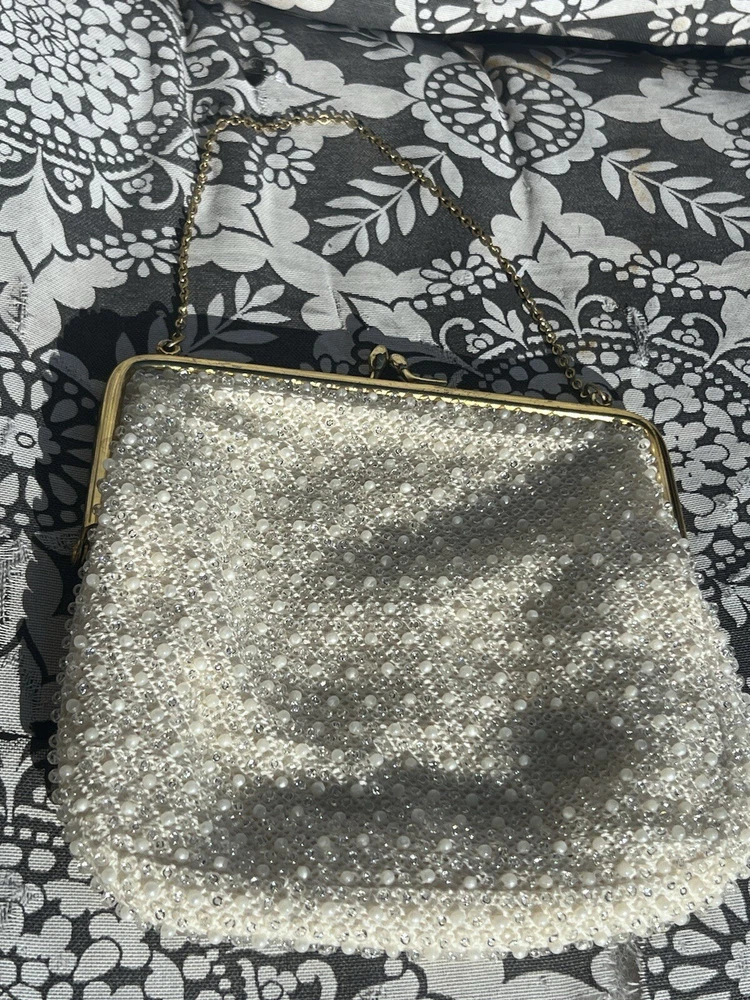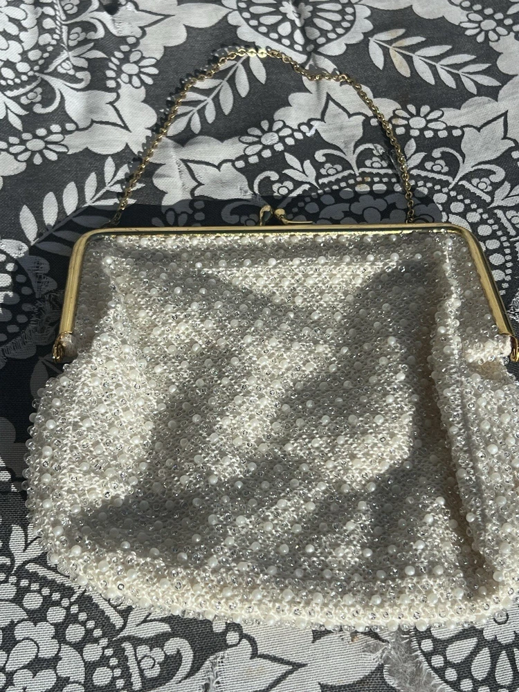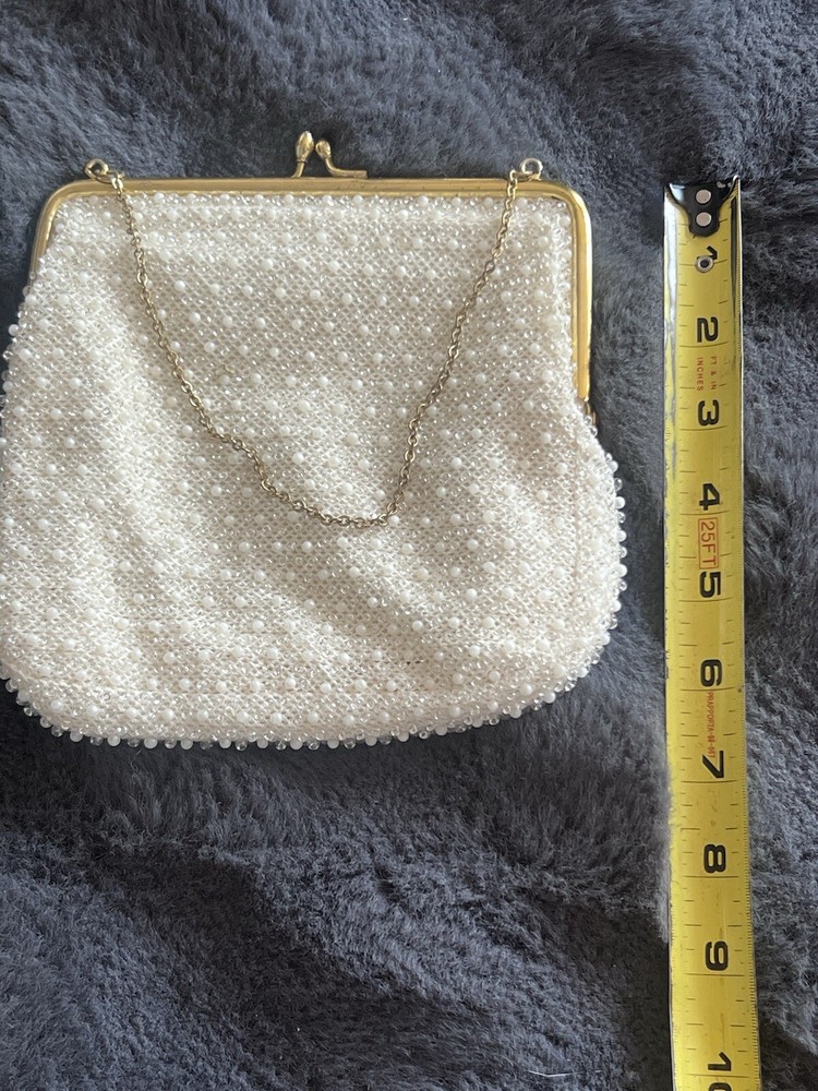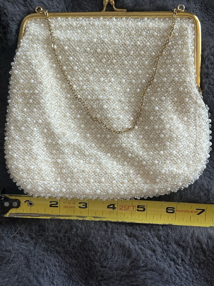 (102724) This vintage ADG Imports evening bag is a stunning addition to any formal occasion. The bag features a trapezoid shape with a gold chain strap and a kiss lock closure. The white exterior is adorned with a beaded design, adding a touch of retro glamour to the bag. Measuring 7 inches in width, 6.5 inches in height, and 5.5 inches in depth, this small bag is perfect for carrying your essentials. The bag also comes with a coin purse and features a satin lining in white. The hardware and handle are both gold in color, adding a touch of luxury to the bag. This ADG Fashion bag is a must-have for any woman who wants to feel like a princess on her special day.