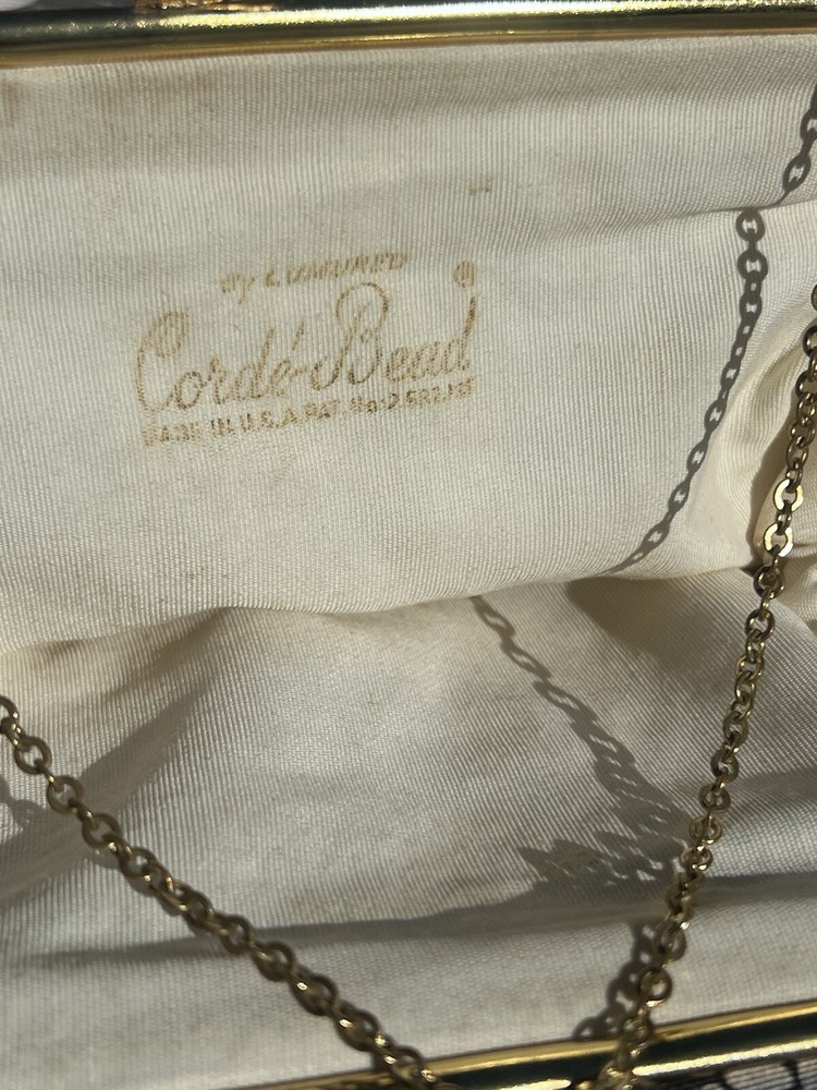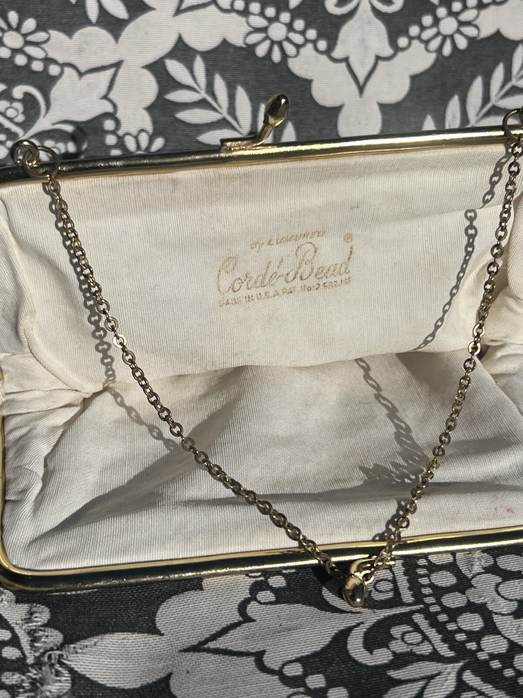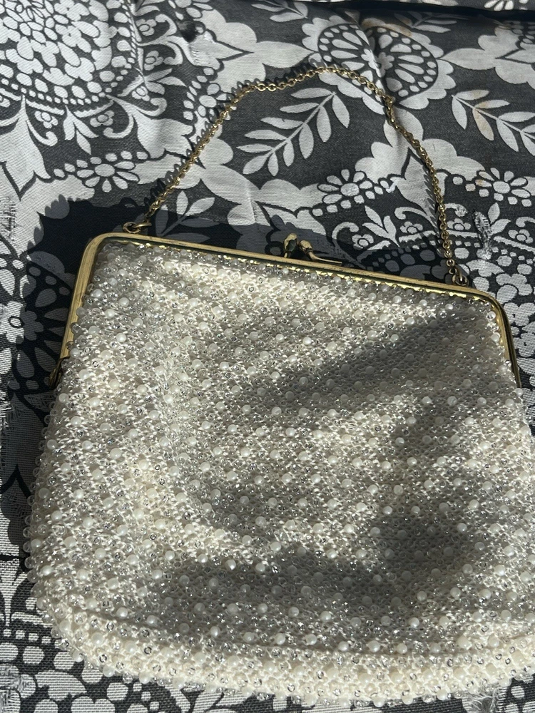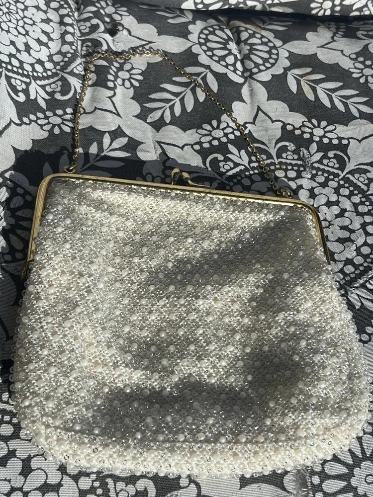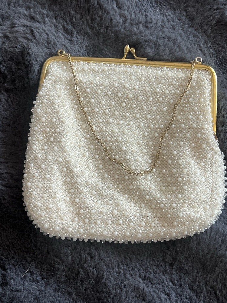 (102724) This vintage ADG Imports evening bag is a stunning addition to any formal occasion. The bag features a trapezoid shape with a gold chain strap and a kiss lock closure. The white exterior is adorned with a beaded design, adding a touch of retro glamour to the bag. Measuring 7 inches in width, 6.5 inches in height, and 5.5 inches in depth, this small bag is perfect for carrying your essentials. The bag also comes with a coin purse and features a satin lining in white. The hardware and handle are both gold in color, adding a touch of luxury to the bag. This ADG Fashion bag is a must-have for any woman who wants to feel like a princess on her special day.
