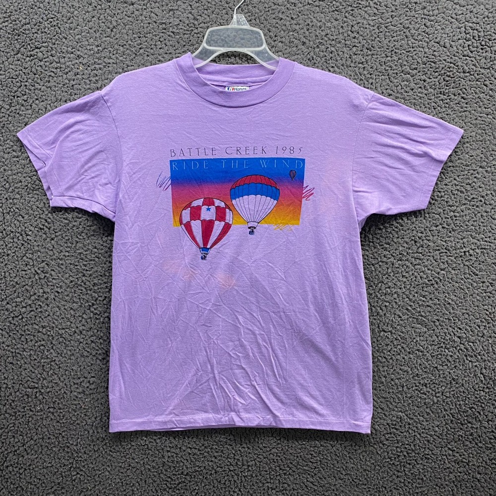Vtg Battle Creek Hot Air Balloon Ride the Wind T Shirt 1985 Large Purple FLAW. Some light bleach spotting on front and back. Single Stitch. No rips, tears or holes. See photos for detailed condition and measurements.