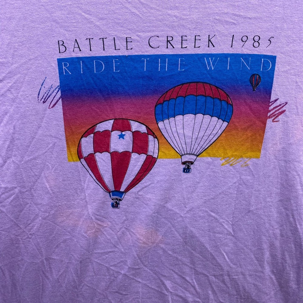 Vtg Battle Creek Hot Air Balloon Ride the Wind T Shirt 1985 Large Purple FLAW. Some light bleach spotting on front and back. Single Stitch. No rips, tears or holes. See photos for detailed condition a...