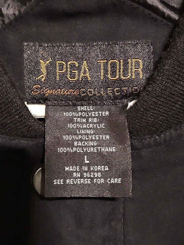 Elevate your golf game and add a touch of vintage style to your wardrobe with this rare PGA Tour Signature Collection golf jacket. Made from durable polyester, this black jacket features a full zip closure and five pockets for convenience. The collar style is a classic point collar and the sleeve length is long sleeve. The jacket is perfect for any season, with features like being wind-resistant, lined, and having zipped pockets. It also has an athletic fit and is machine washable. The PGA Tour Signature Collection jacket is perfect for any occasion, whether it's for travel, workwear, or even a party or cocktail event. With its solid pattern and stylish accents like buttons, zipper, embroidered logo, and a retro 90s design, this jacket is a must-have for any golf enthusiast or vintage style fan.