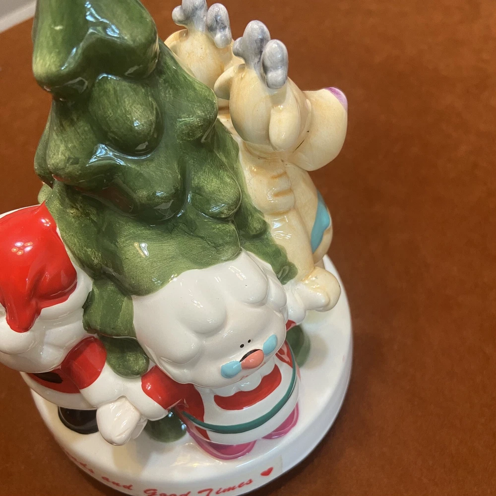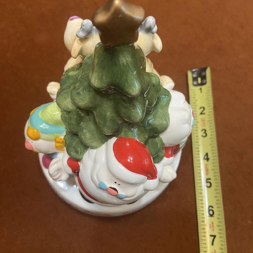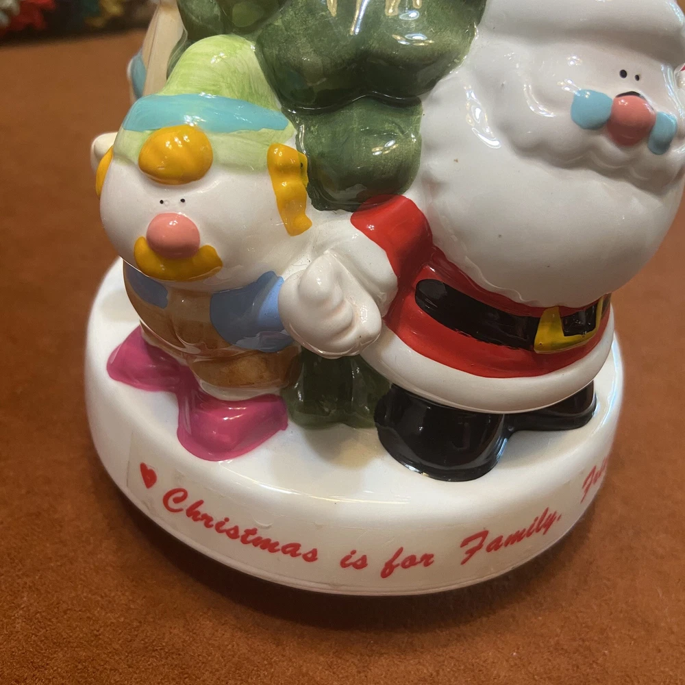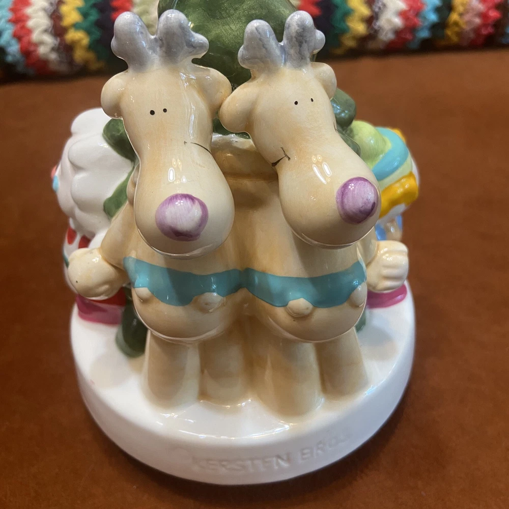 Add some festive cheer & chime to your home with this vintage ceramic figurine featuring Santa & Mrs Claus and his reindeer. The handmade piece from Kersten Brothers is perfect for Christmas decorating and features a wind-up musical tune that plays "Christmas is for family. Friends & good times" for all to enjoy. The medium-sized figurine is made of ceramic and features intricate details that make it a great addition to any collection. This collectible item is from the 1960s-1970s and has a modern design that will appeal to both boys and girls. It is a great way to add some music and holiday spirit to your home decor. Whether you're a collector or just looking for a unique Christmas decoration, this figurine is sure to delight. Wind up works. No signs of previous owner.