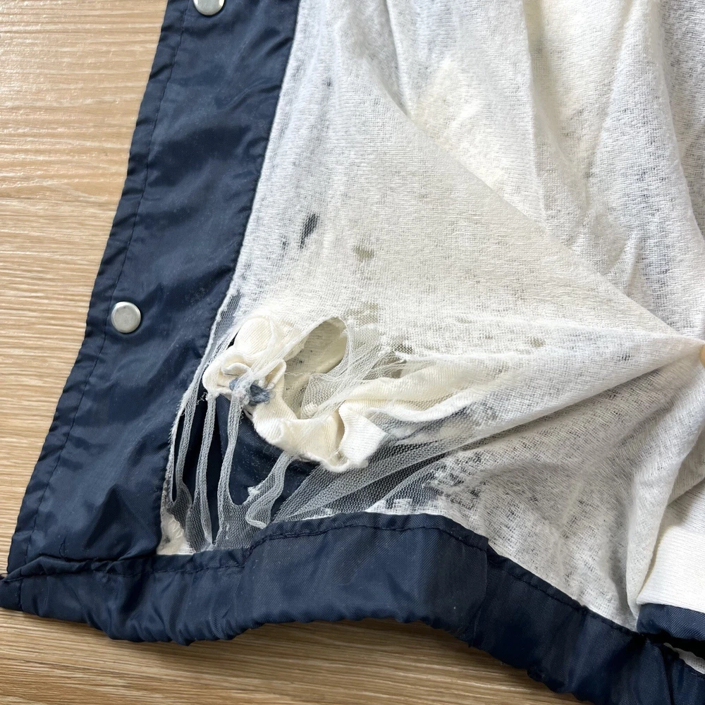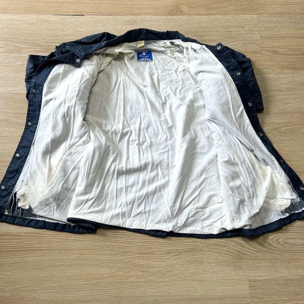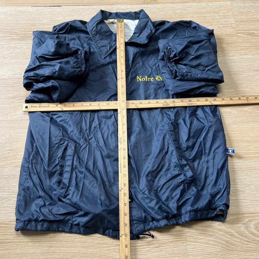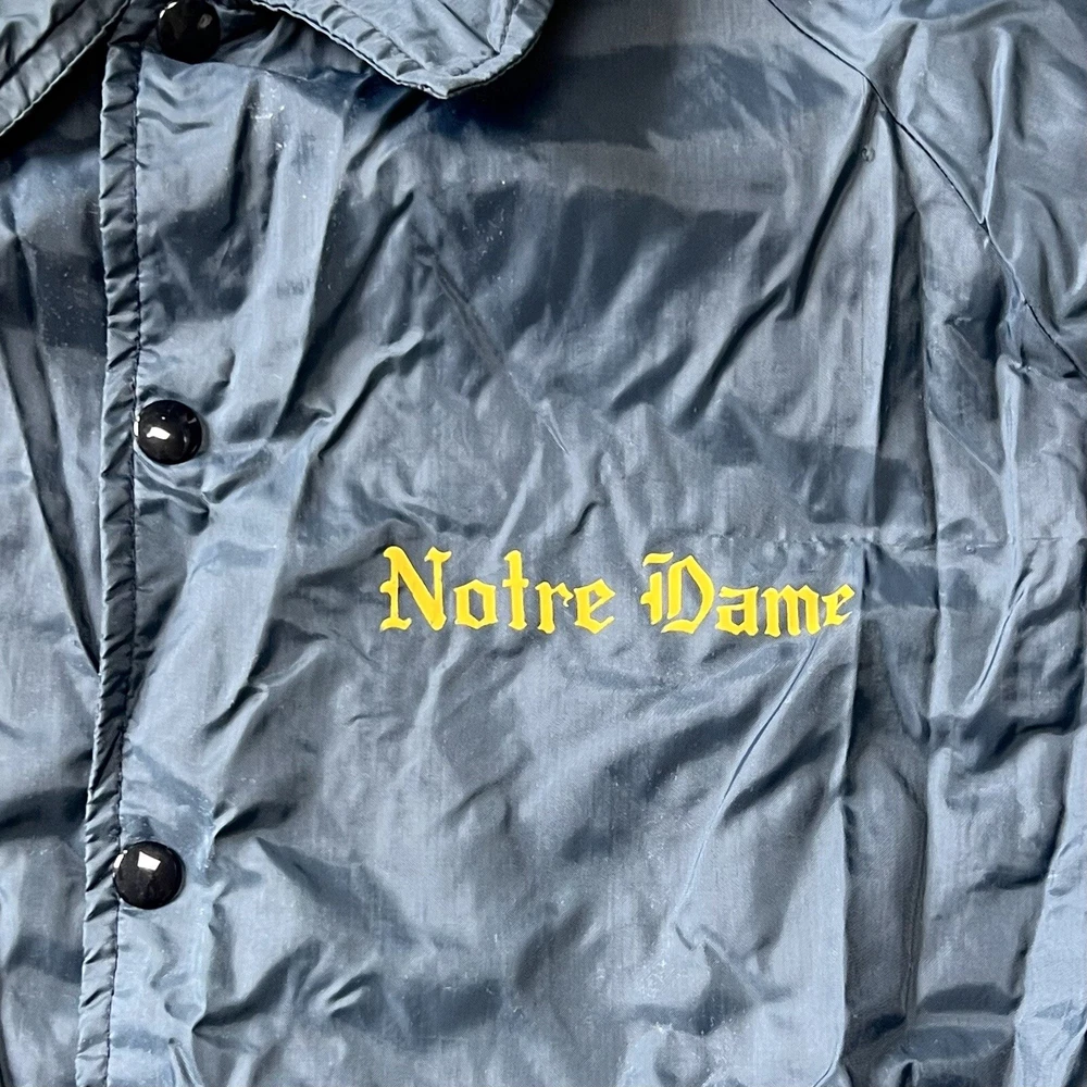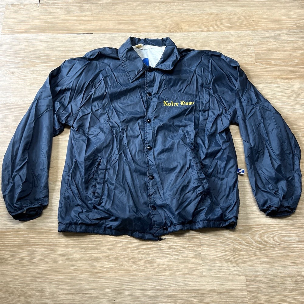 Vtg Champion Notre Dame Button Windbreaker Jacket XL Fighting Irish Made USA 80s. Please see photos for exact condition as this item is preowned and note the overall condition shown including any wear, marks, or flaws seen. Note the lining has some obviously worn spots including along one pocket and this pocket also has a hole as shown. There are also some snags on the jacket as shown. PLEASE CHECK PHOTOS FOR MEASUREMENTS as vintage clothing may run different than the average sizing. Check out my store for other vintage apparel, accessories, and more! I offer combined shipping and bundle discounts!