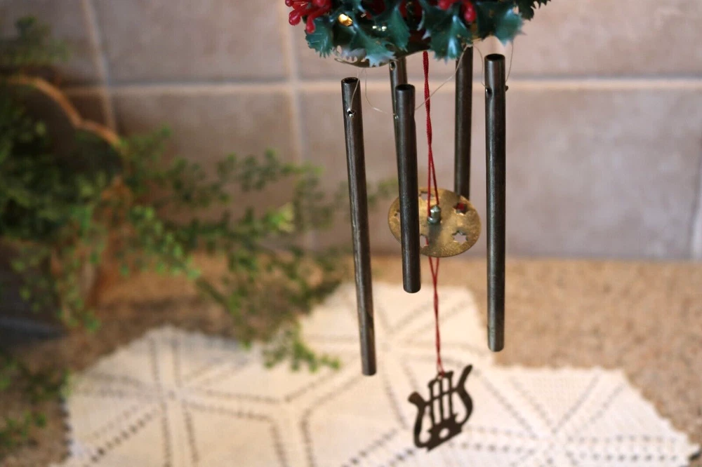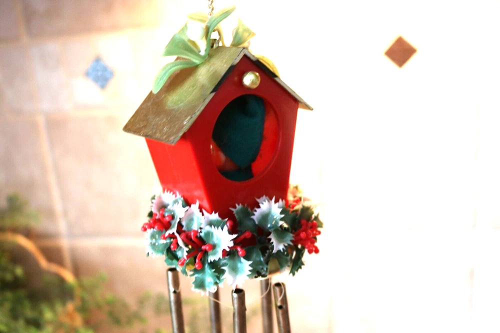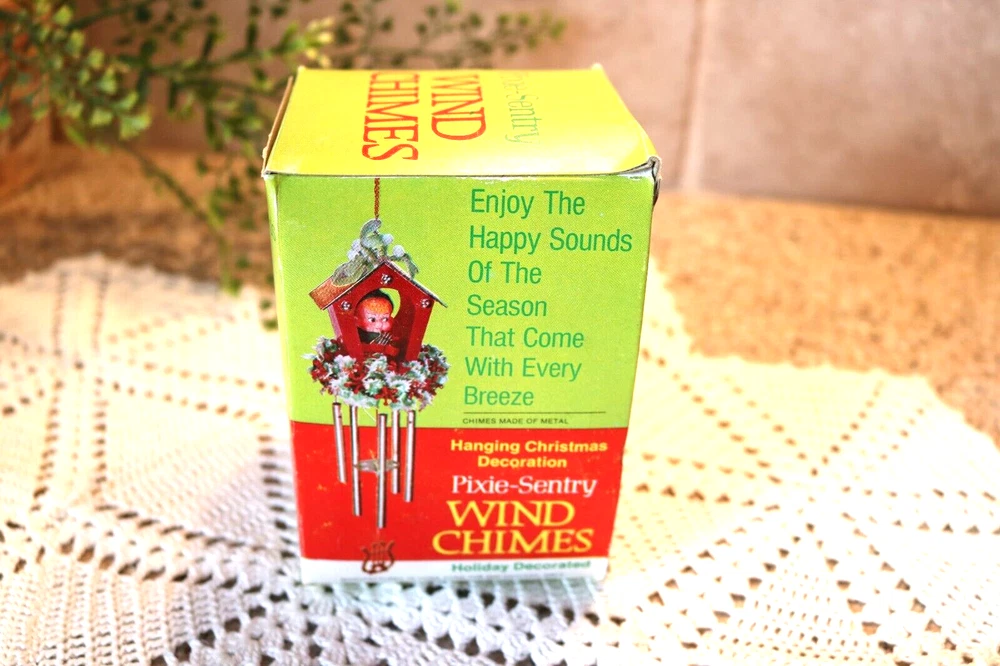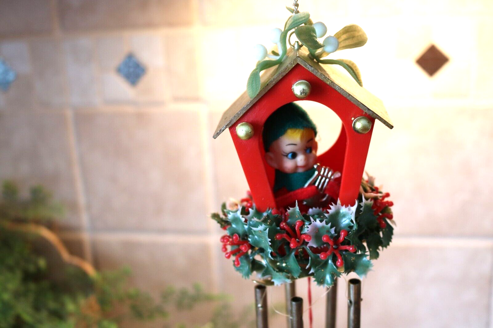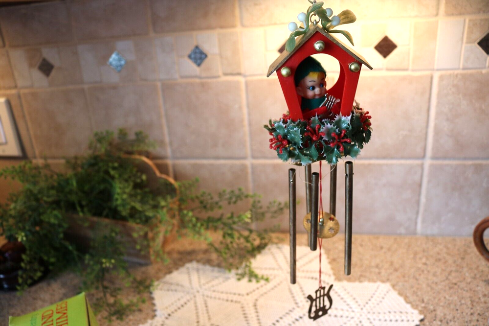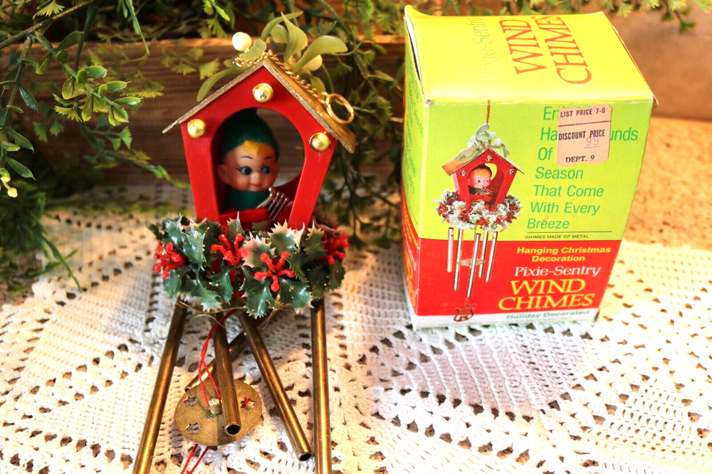 Up for sale is a 1960s, made in Hong Kong, Pixie-Sentry Wind Chime. This darling hanging elf figure is peeking out of his house which has mistletoe on top to greet you. At the base of the plastic house is holly garland and coming from that is a metal base from which hangs the windchime pieces. The entire piece measures approx. 12 inches ftom the top of the roof to the bottom of the metal tubes. There is a chain coming from the roof for hanging. It comes in its original box which is in excellent condition. Overall it is very good condition. A few marks or aging on the metal giving it a nice patina, and one cluster of berries missing from the garland. The elf in the house is holding a harp, but is made to fit in the house so only starts at the middle of his body. Very MCM. Shipping is UPSP, Ground Advantage, USA only. Look at the pictures, email me any questions, and thanks for you interest.