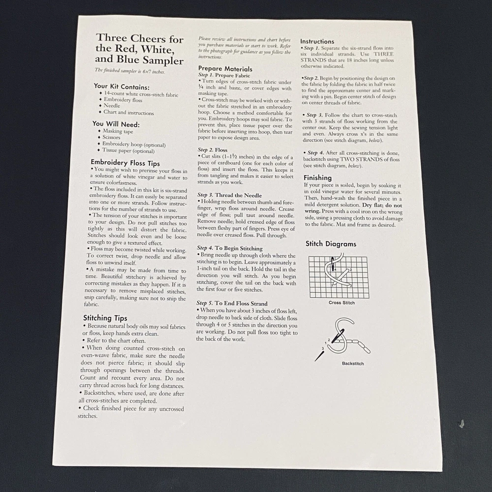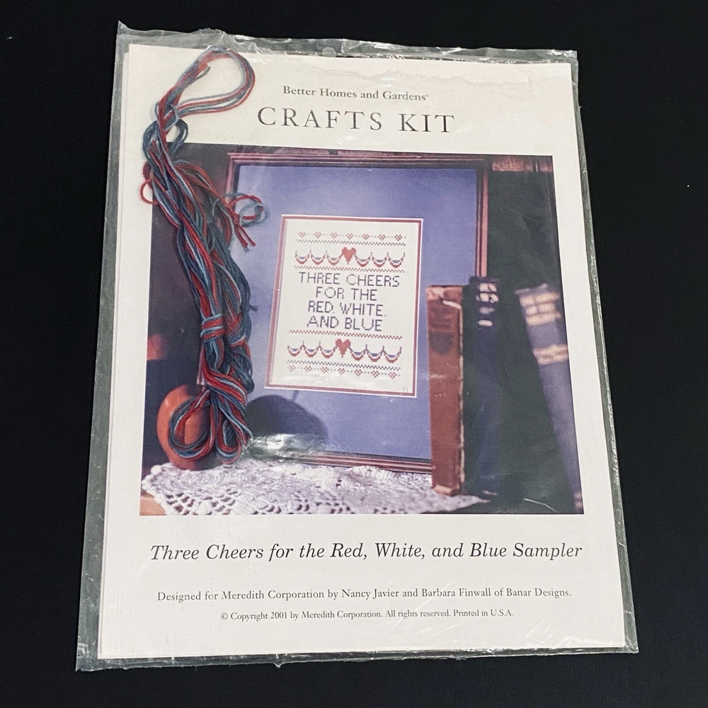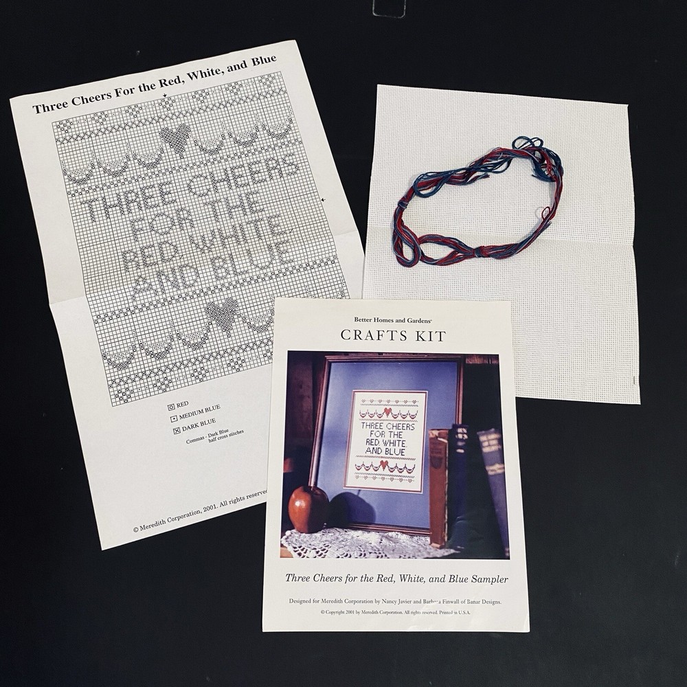 Vintage 2001 Craft Kit - Better Homes & Gardens Cross-Stitch Sampler - Patriotic Theme - Designed for Meredith Corp. by Nancy Javier, Barbara Finwall of Banar Designs Condition: Open Package but never Used - Kit is complete Three Cheers for the Red, White, and Blue The kit includes: - White cross-stitch fabric - Embroidery Floss [ Red/Med.Blue/Blue ] - Tapestry needle is stored on fabric edge ** You will need a glue stick or spray adhesive Please See pics for measurements Thanks for Shopping ! Item Ships from Los Angeles, California All Reasonable Offers will be Considered