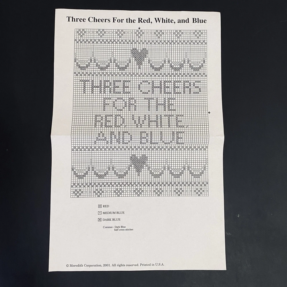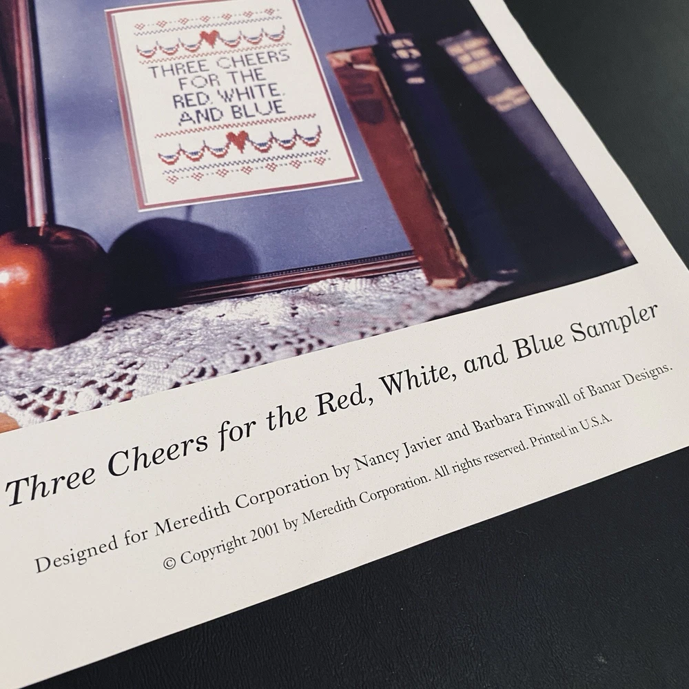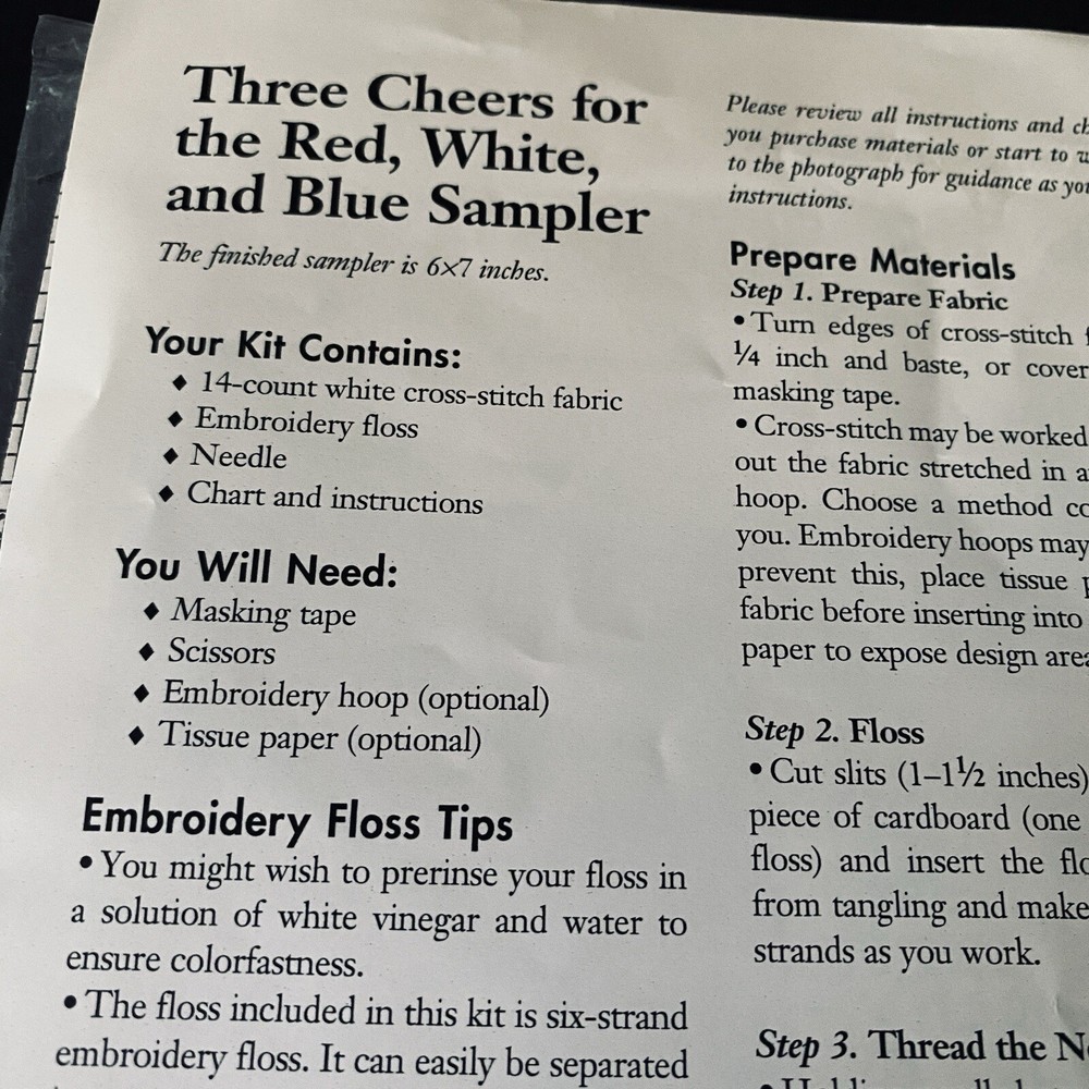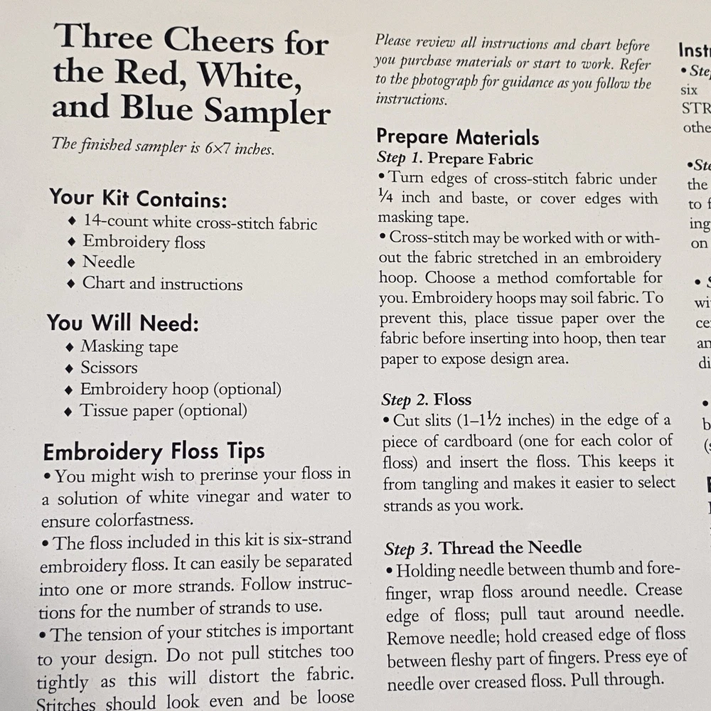 Vintage 2001 Craft Kit - Better Homes & Gardens Cross-Stitch Sampler - Patriotic Theme - Designed for Meredith Corp. by Nancy Javier, Barbara Finwall of Banar Designs Condition: Open Package but never Used - Kit is complete Three Cheers for the Red, White, and Blue The kit includes: - White cross-stitch fabric - Embroidery Floss [ Red/Med.Blue/Blue ] - Tapestry needle is stored on fabric edge ** You will need a glue stick or spray adhesive Please See pics for measurements Thanks for Shopping ! Item Ships from Los Angeles, California All Reasonable Offers will be Considered